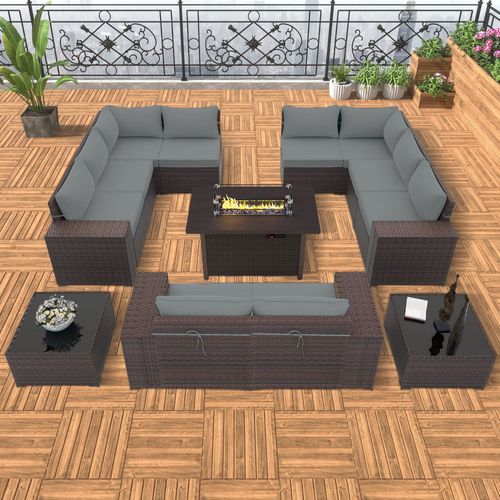 GOJOOASIS Grey 12PCS Set Wicker Outdoor Sectional Sofa With Fire Pit Dining Table