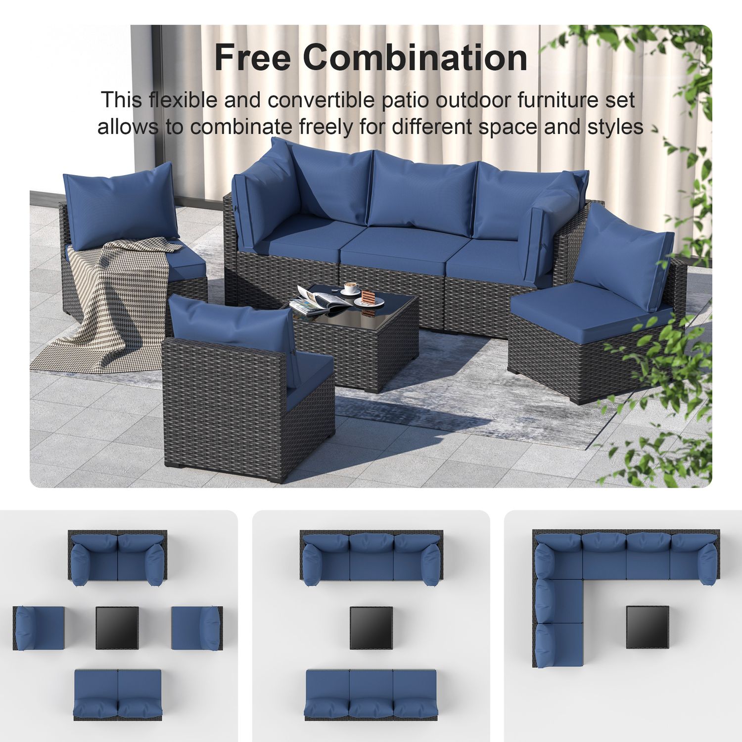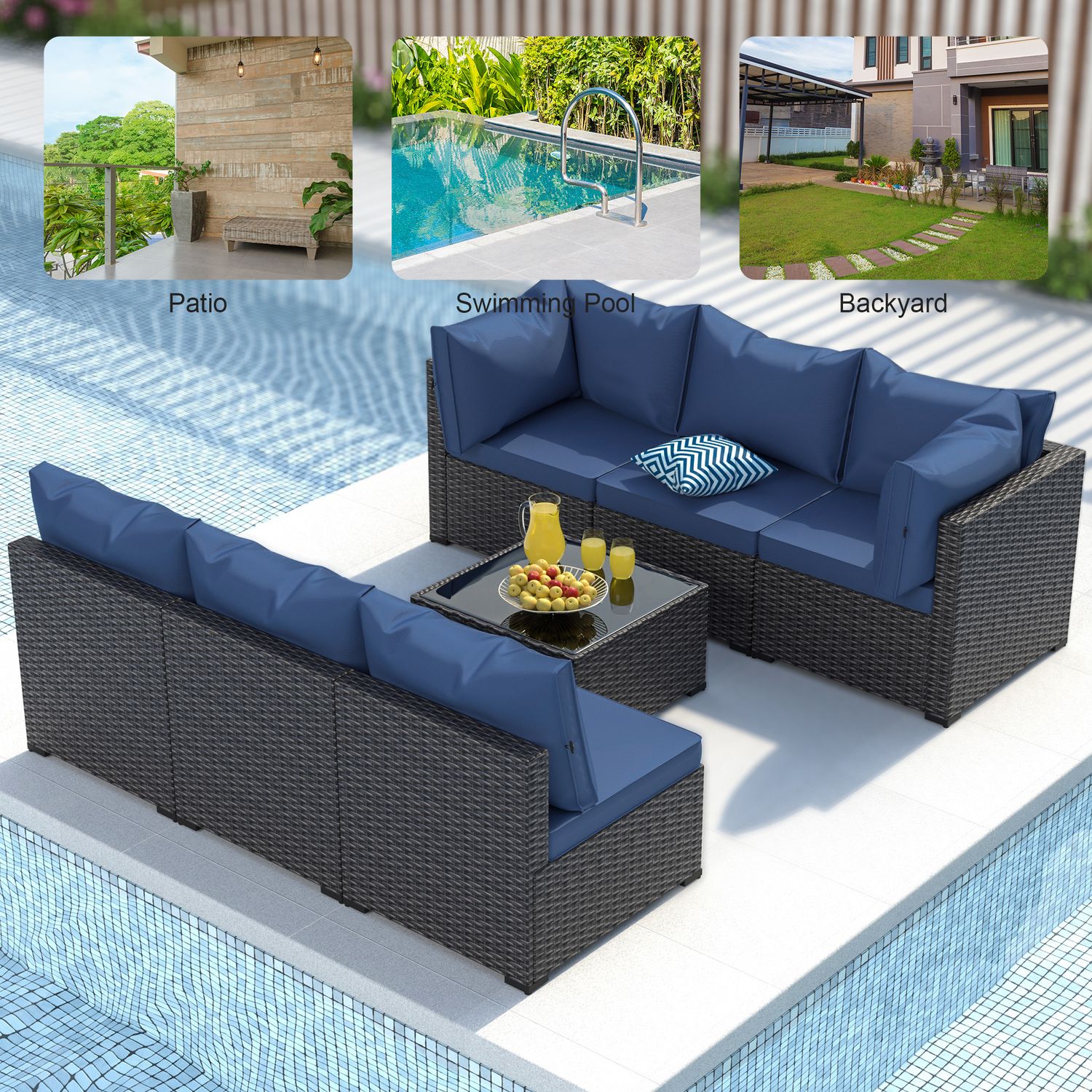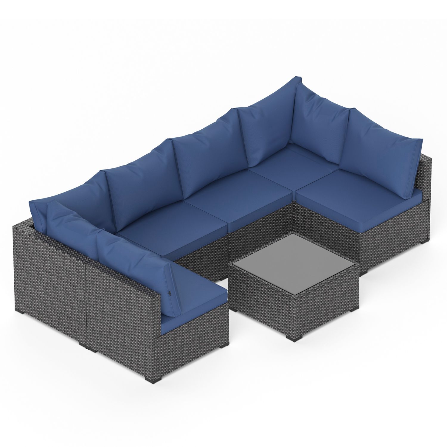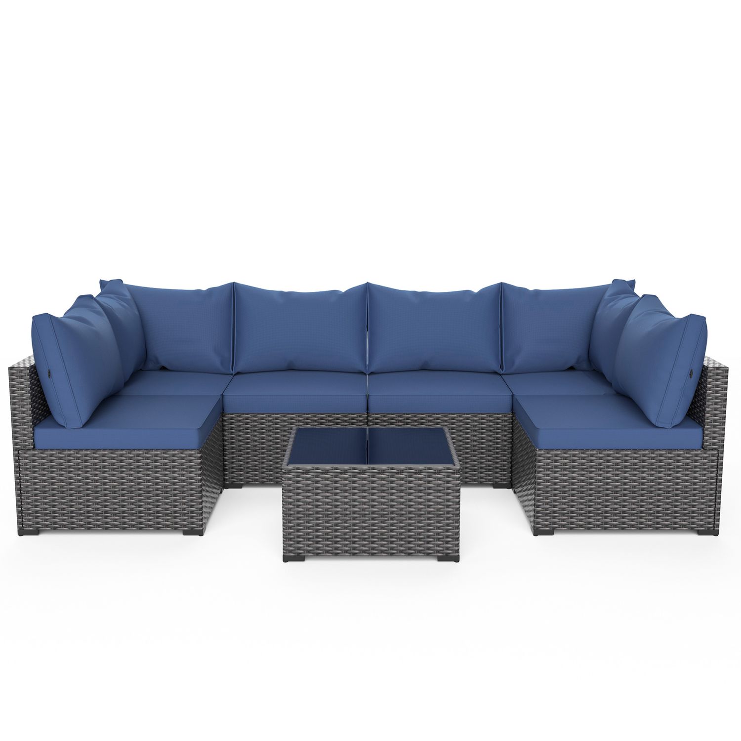 7PCS Rattan Patio Furniture Set PE Wicker Sectional Sofa w/Cushion Outdoor Blue