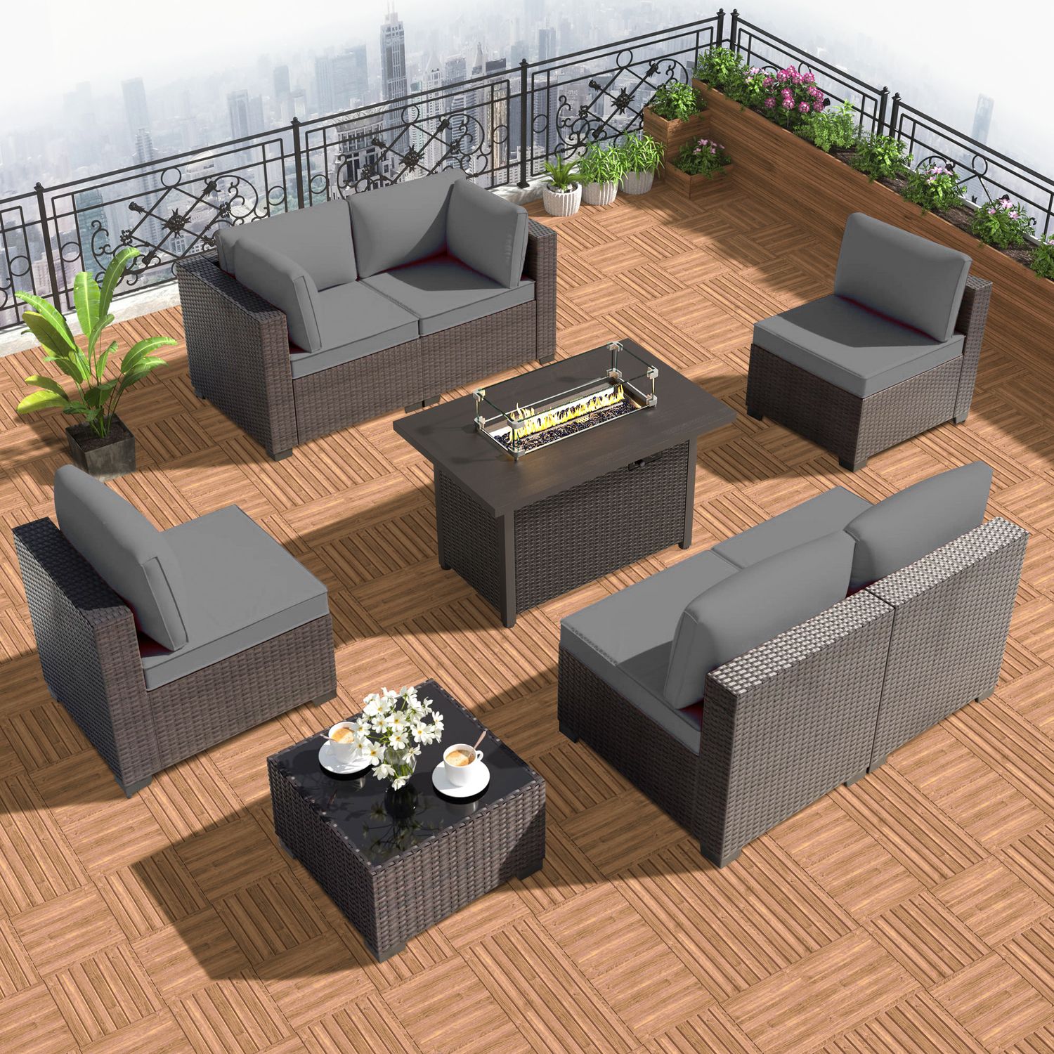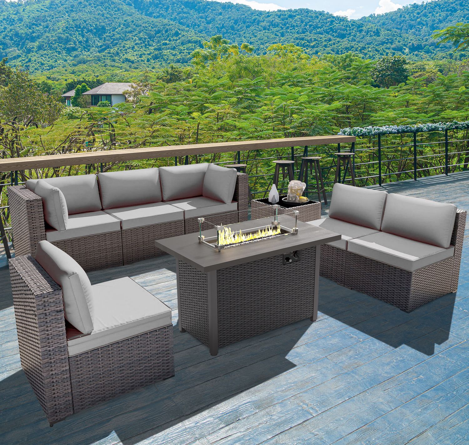 GOJOOASIS Grey 7PCS Set Wicker Outdoor Sectional Sofa With Fire Pit Dining Table
