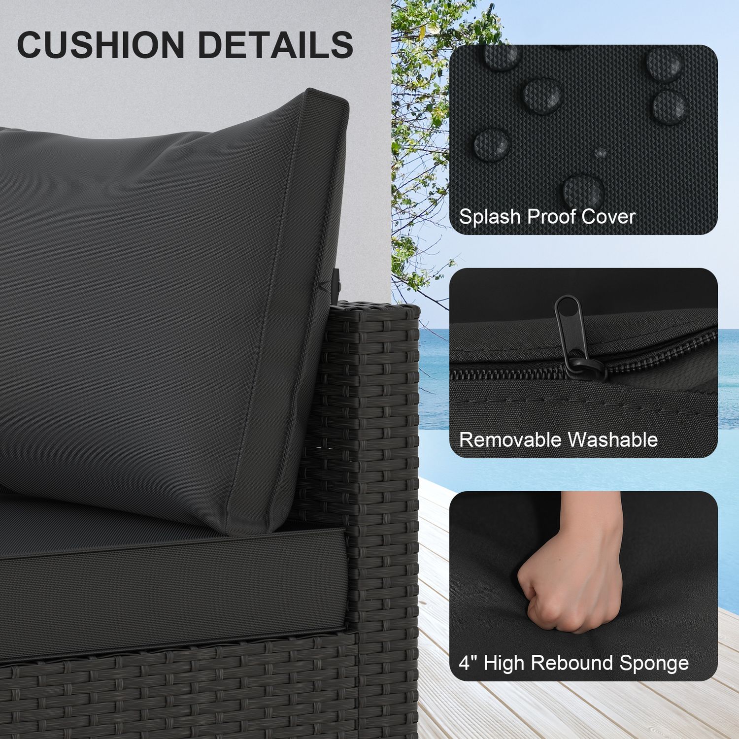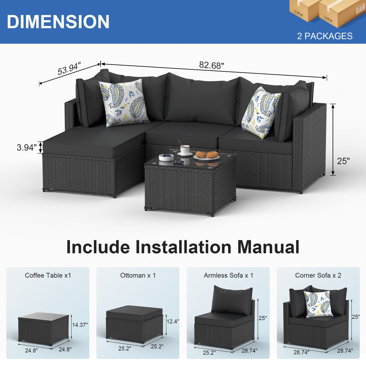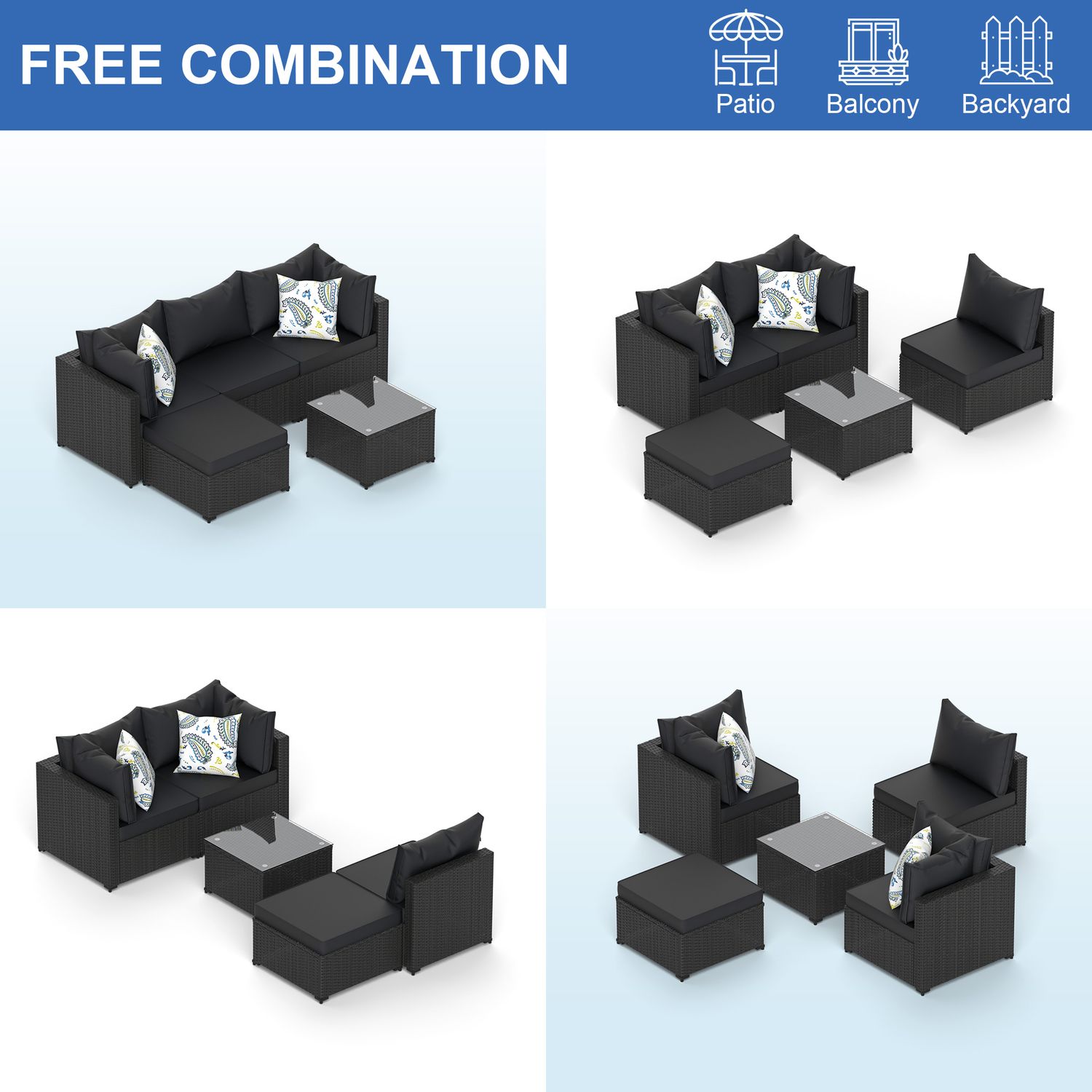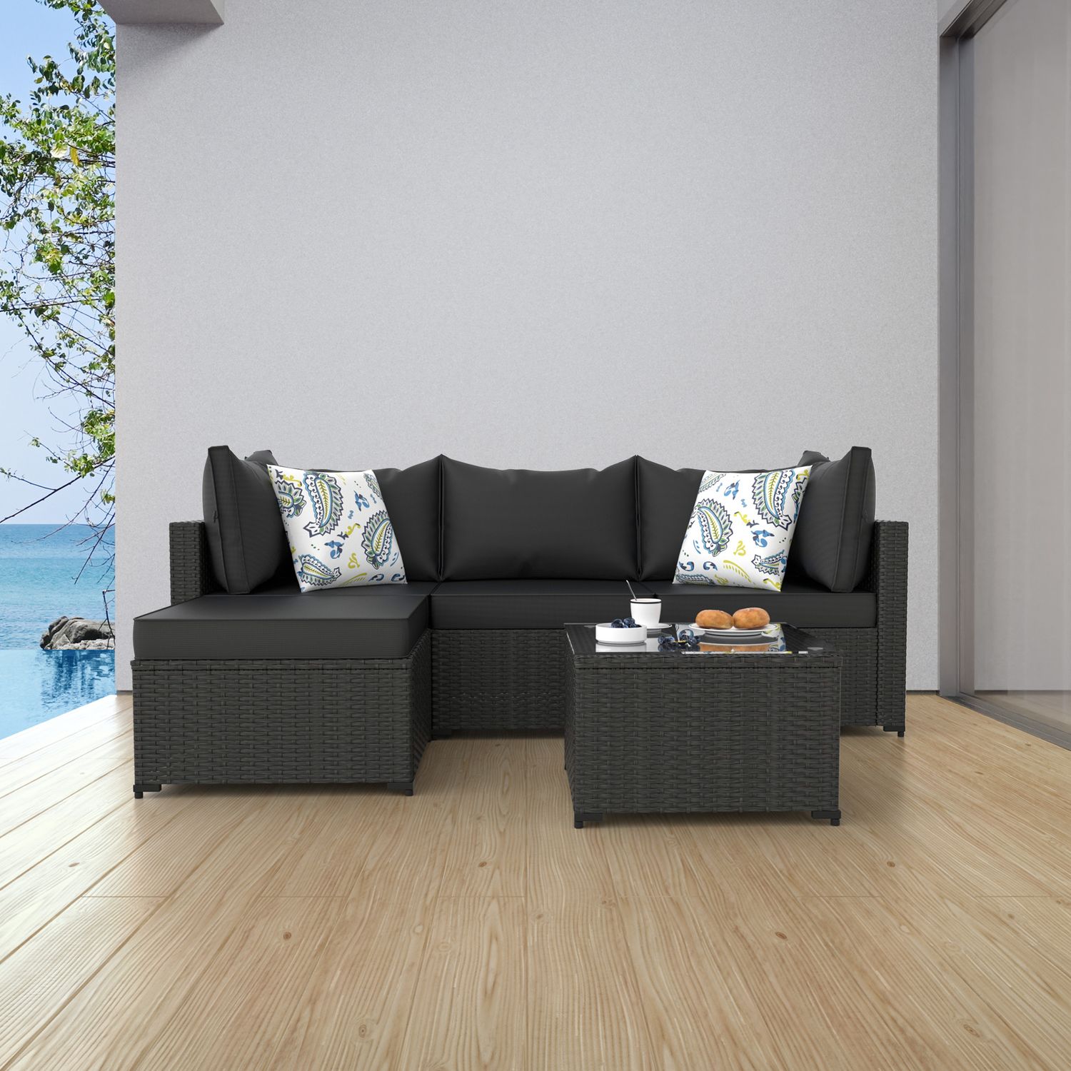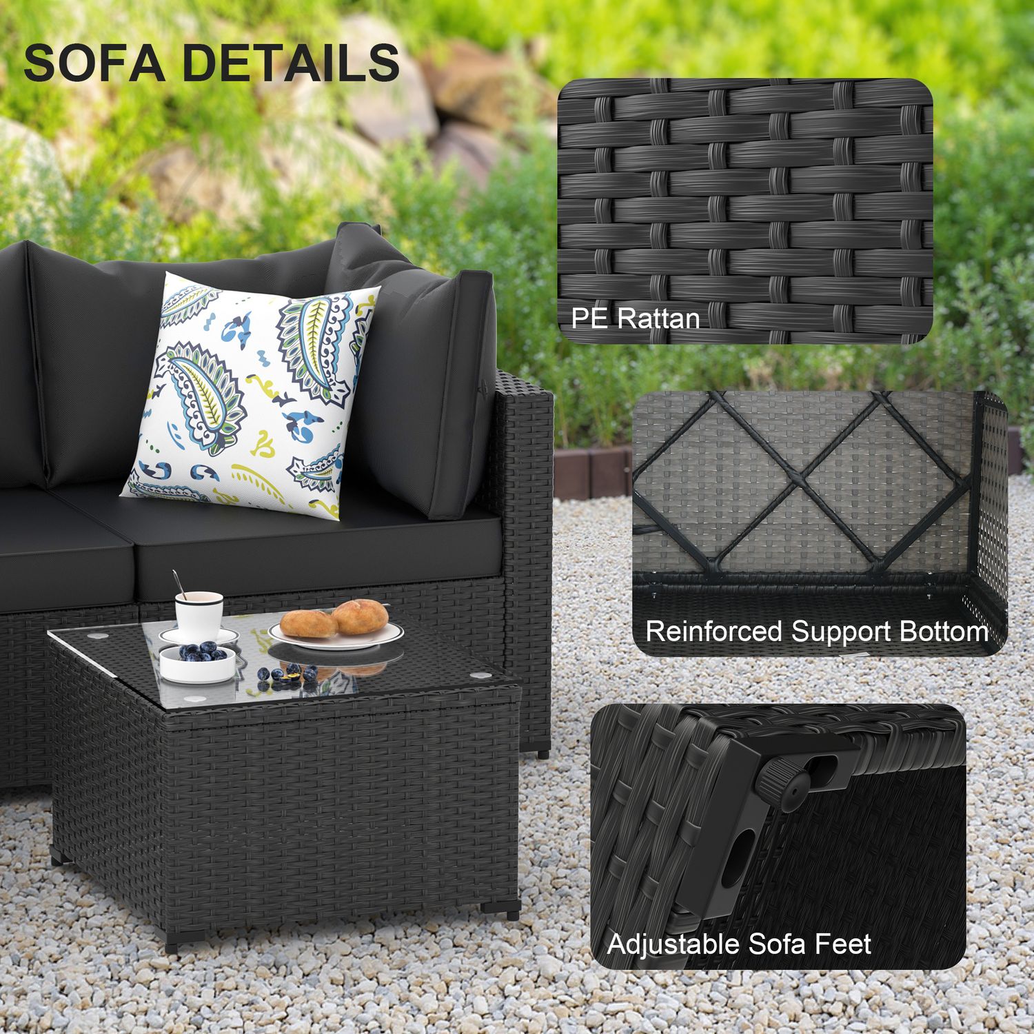 Phonjoroo 5pcs Patio Furniture Sets All Weather Outdoor Sectional Sofa Manual Weaving Wicker Rattan Outdoor Conversation Set with With Cushion And Glass Table, Black