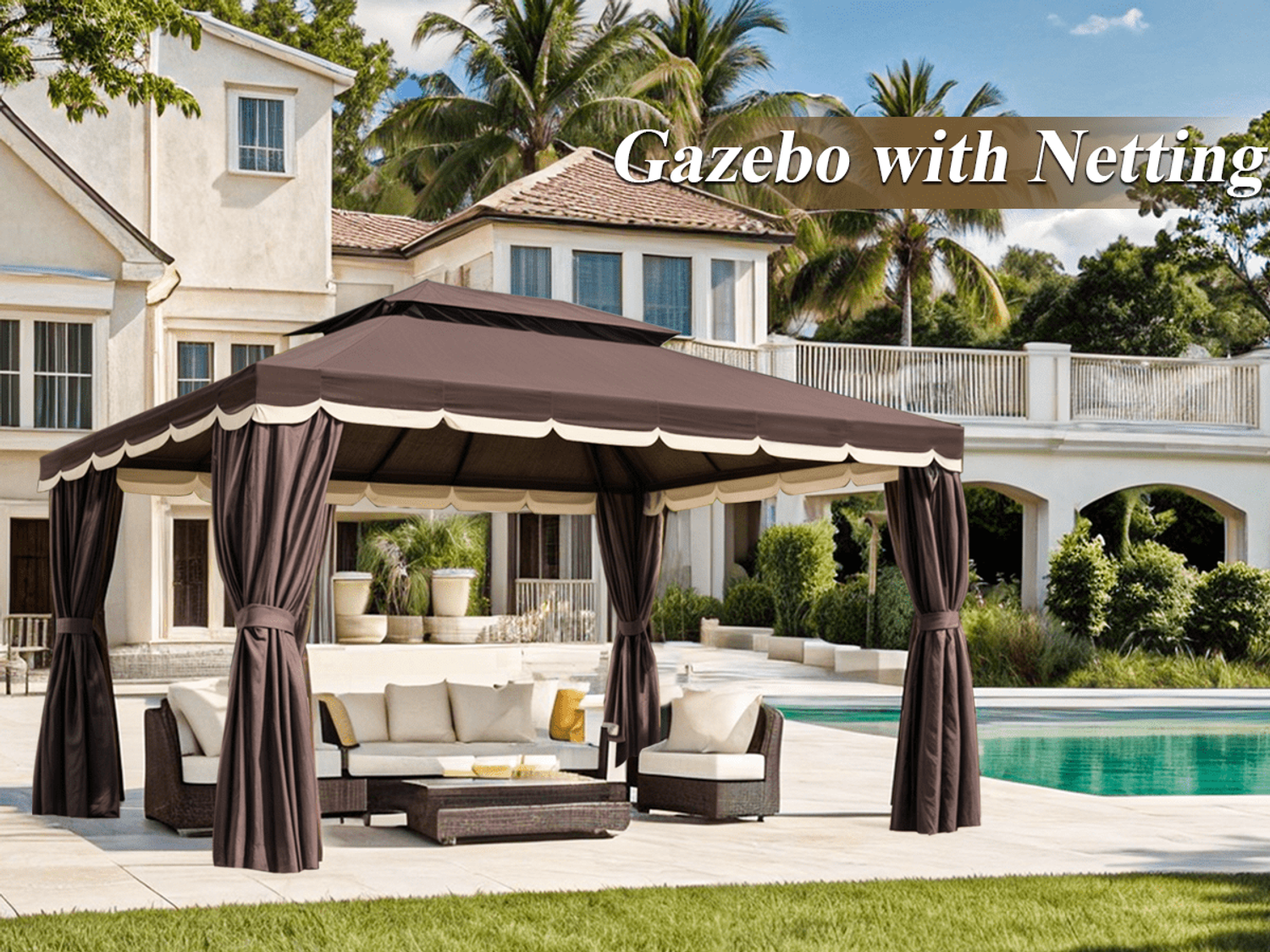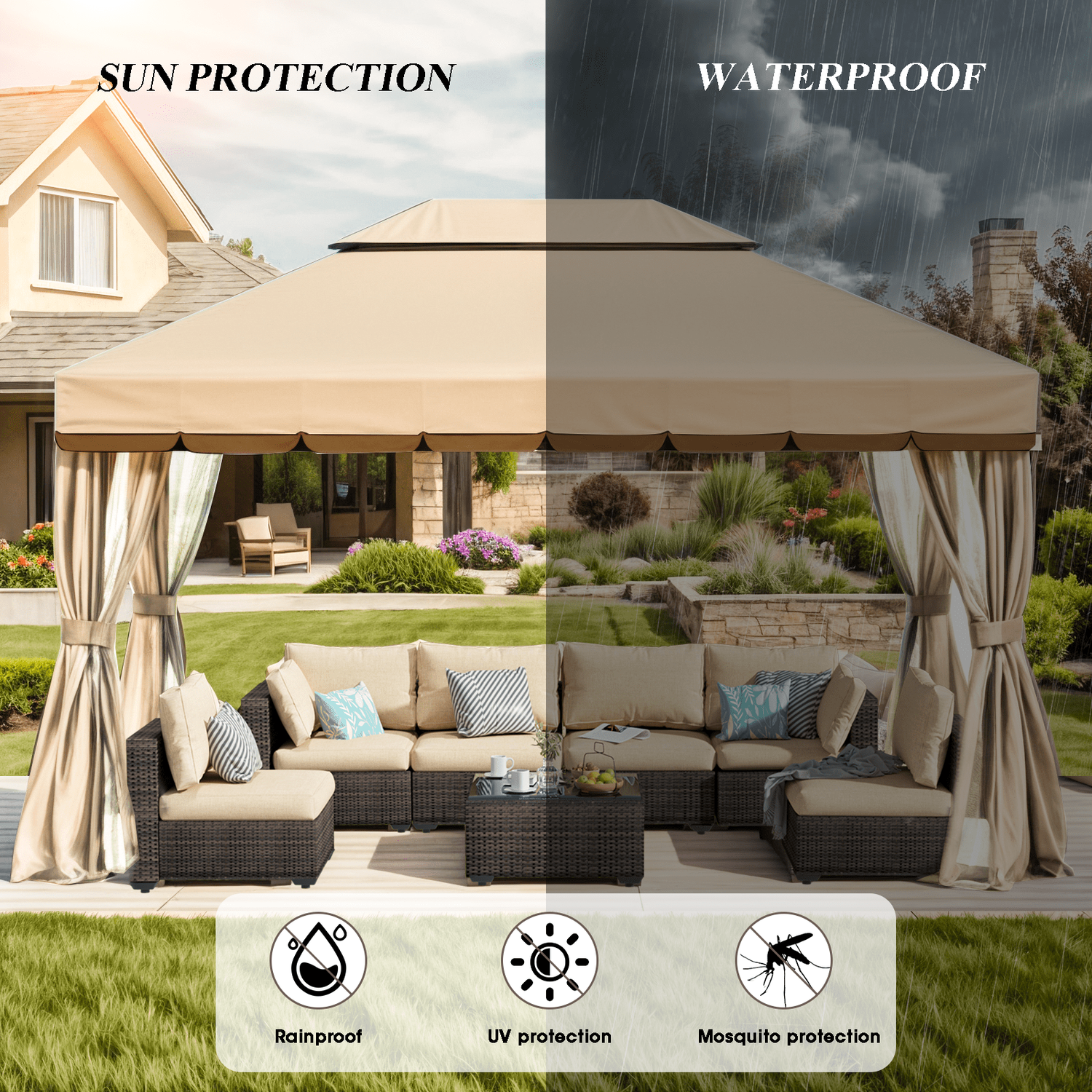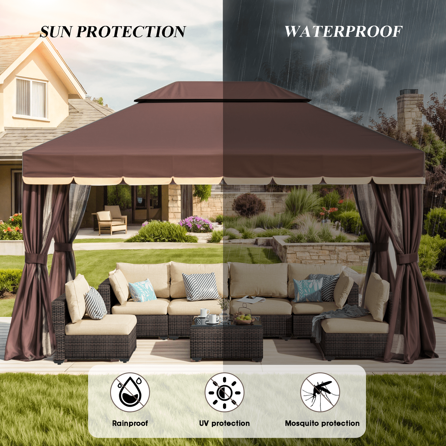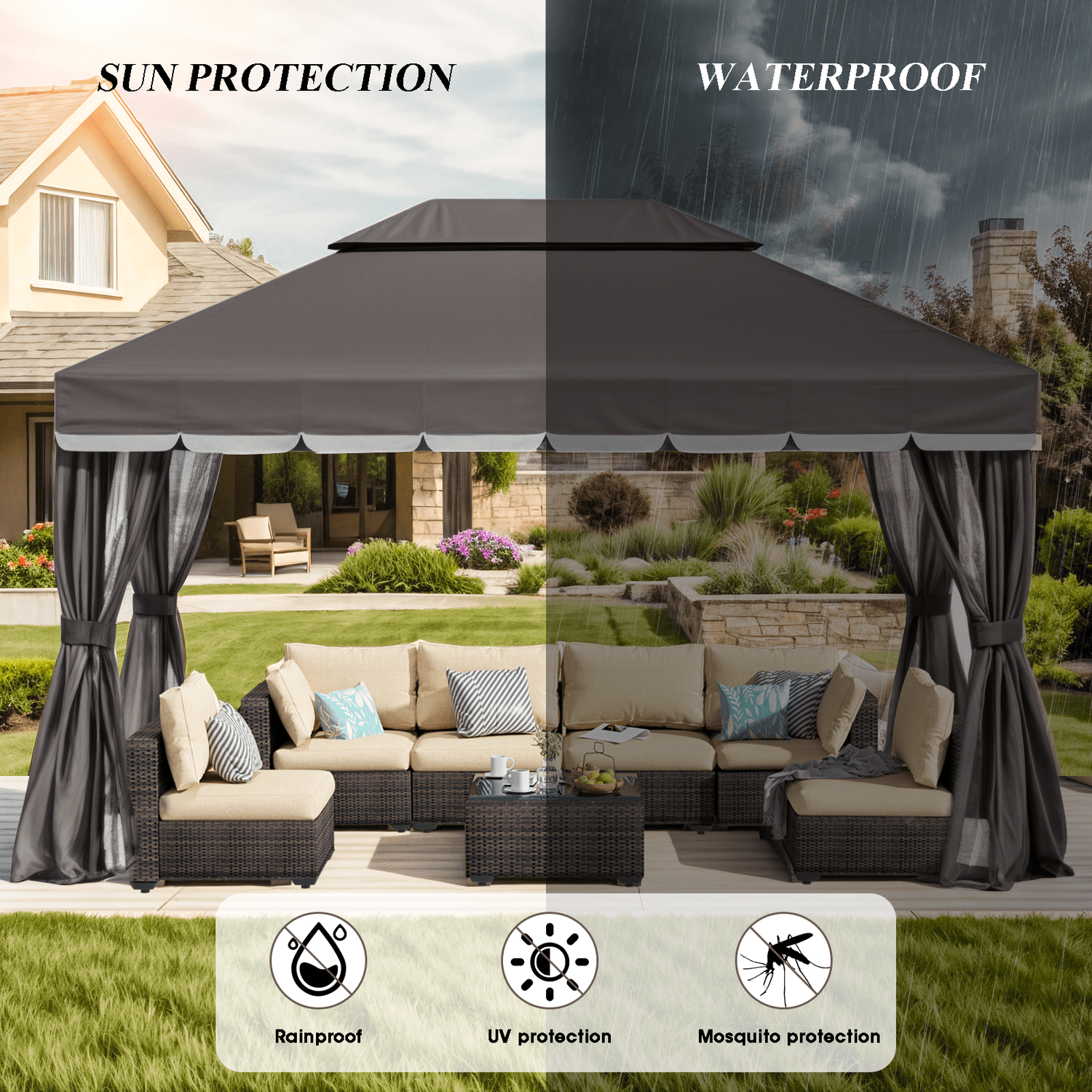 Gaildon 1310 FT Deluxe No Screws Gaebo,Double Roof Outdoor Shelter Tent with Netting and 7 Patio Outdoor Furniture Wicker Sectional Sofa Couch Lawn S