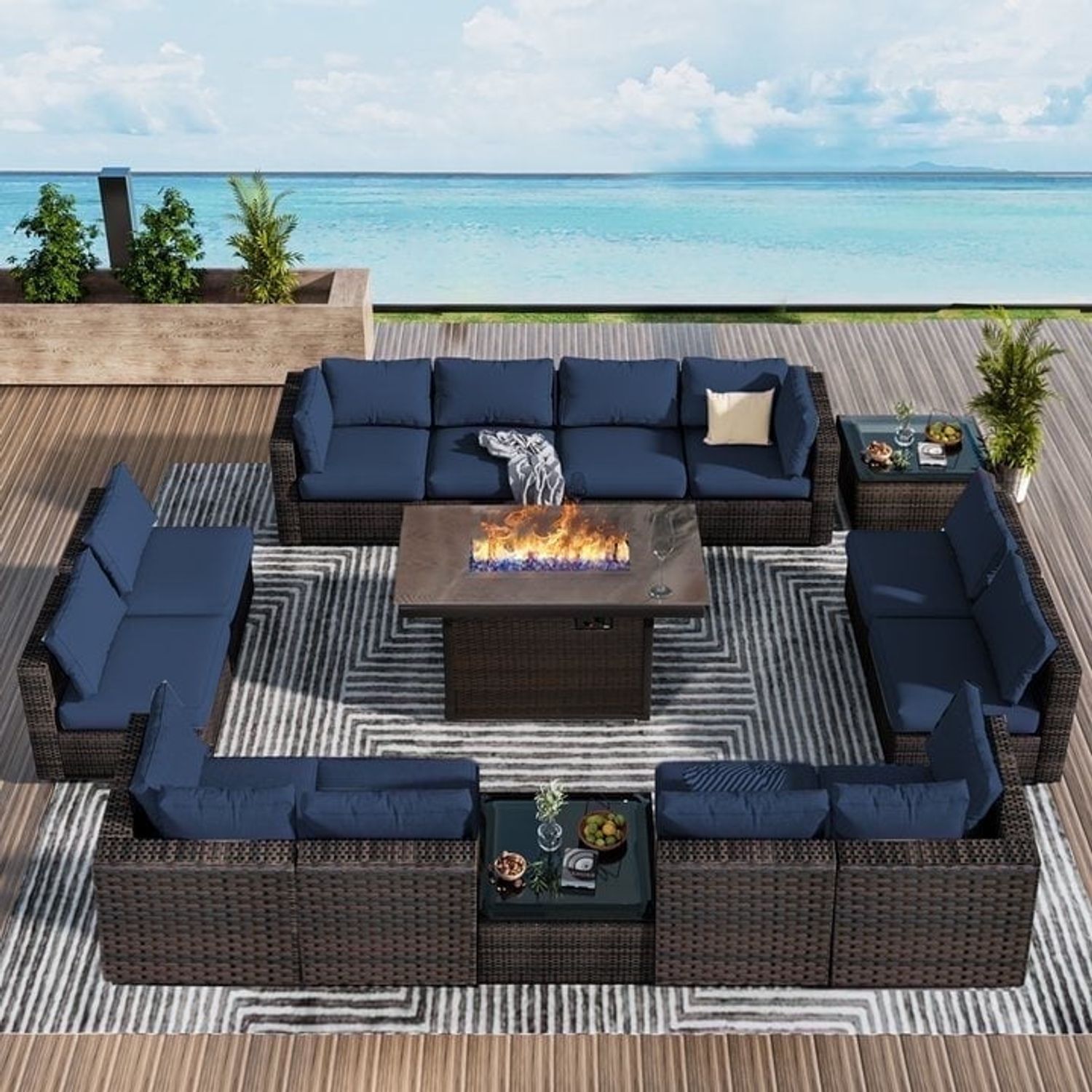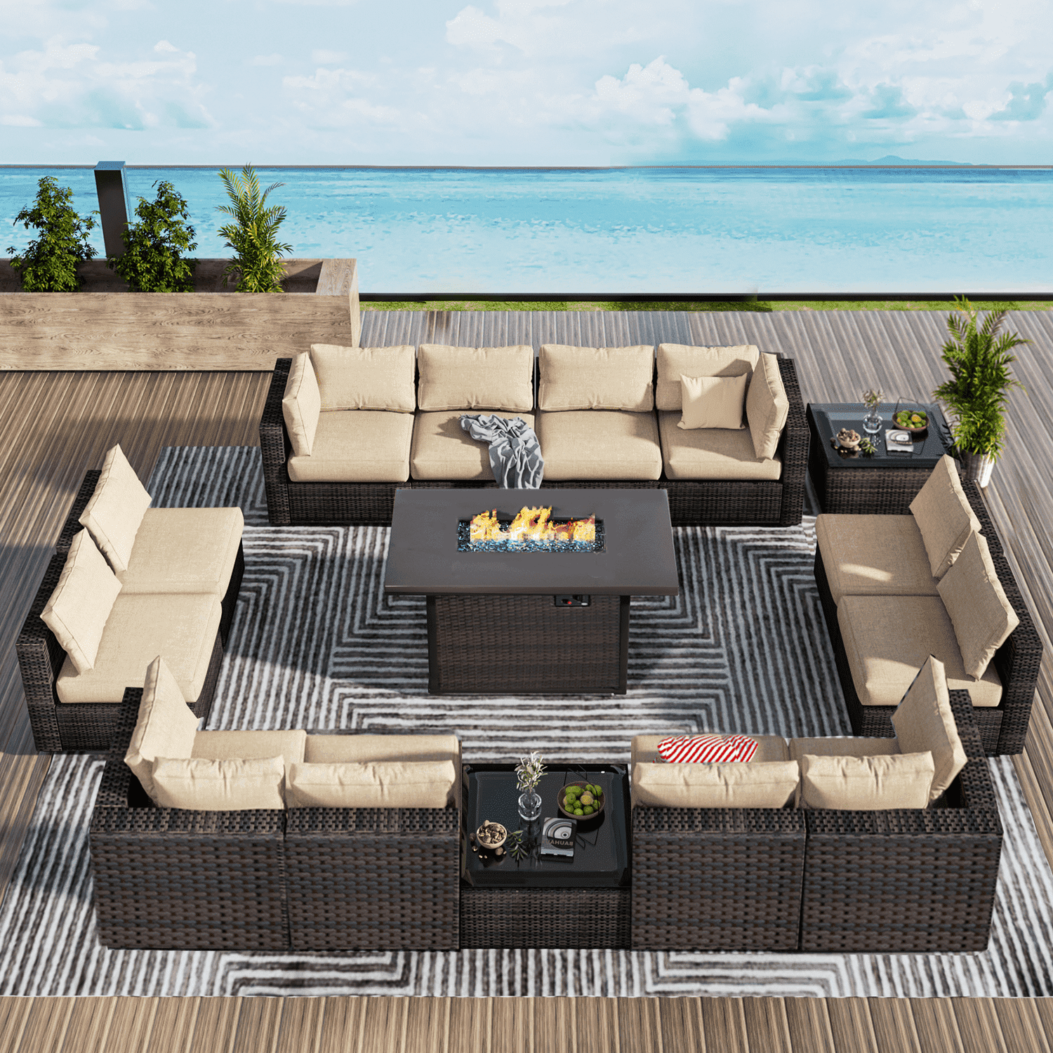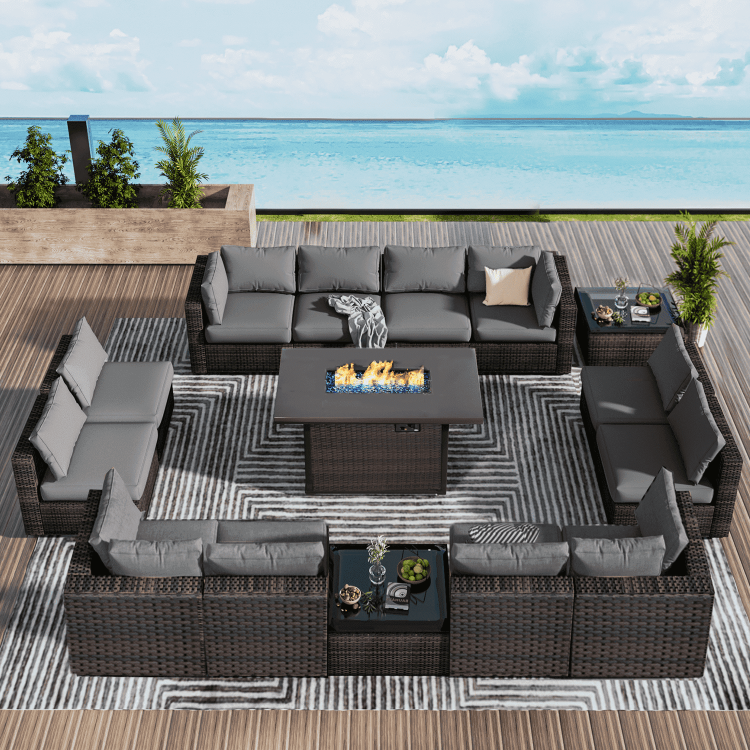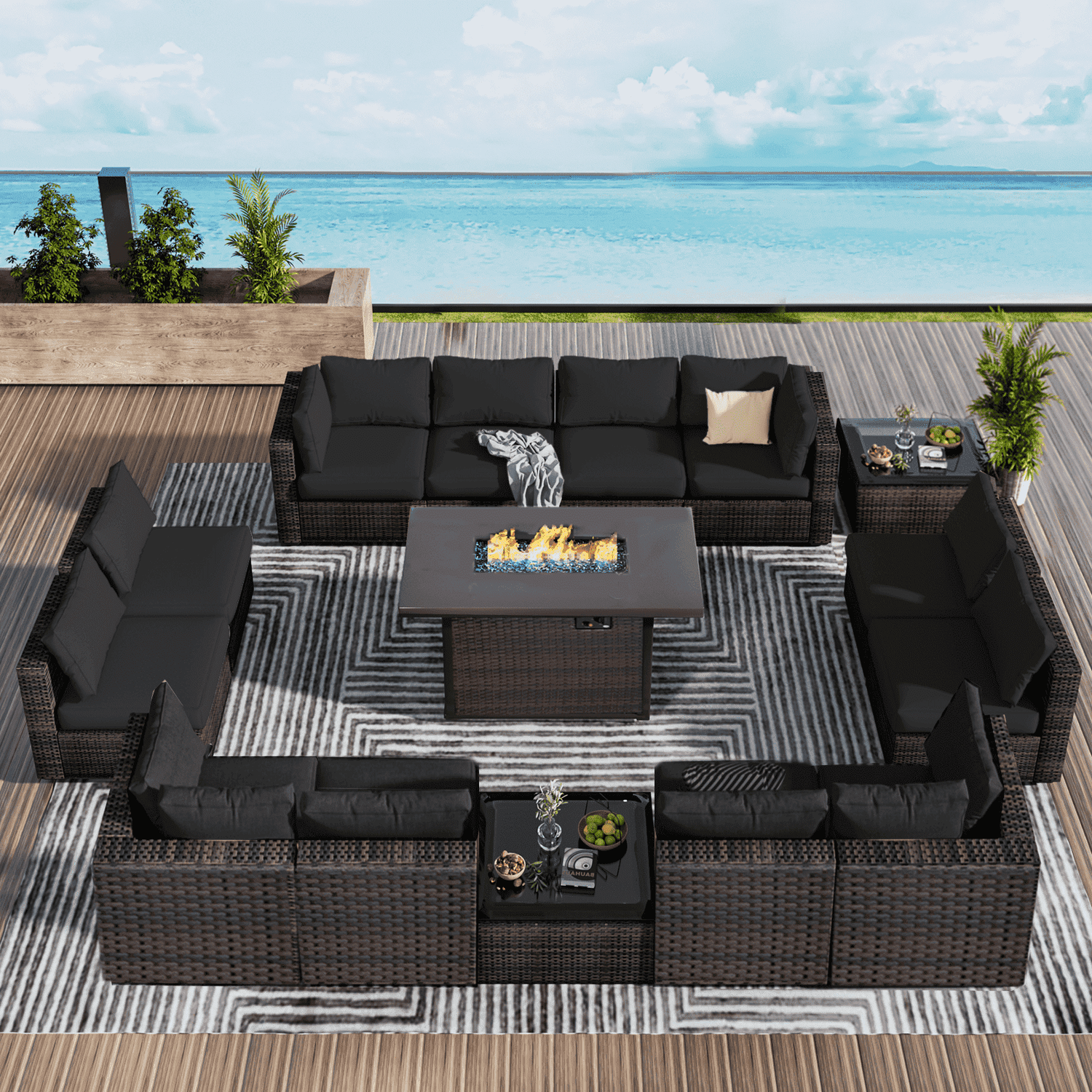 Gaildon 15 Pieces Patio Furniture Set with Fire Pit Table, All Weather Outdoor Sectional PE Rattan, Patio Conversation Sets Cushions Black-glass Coff