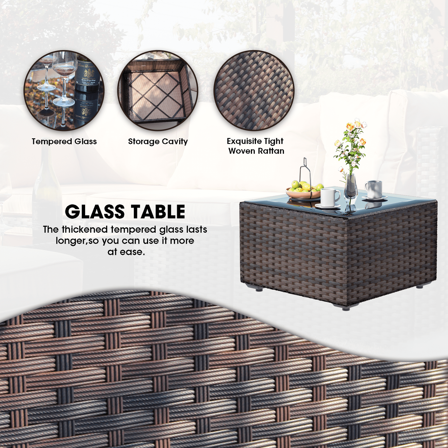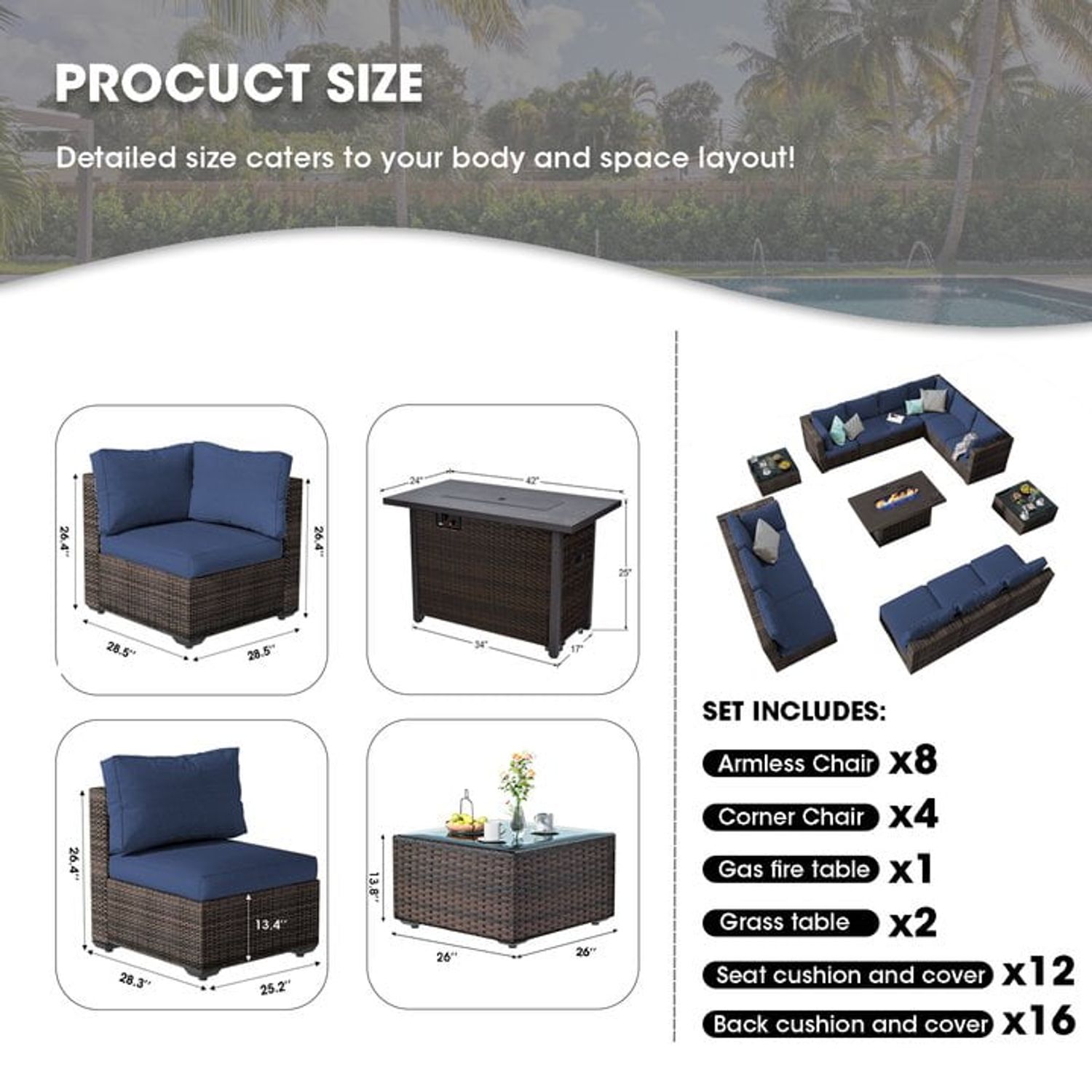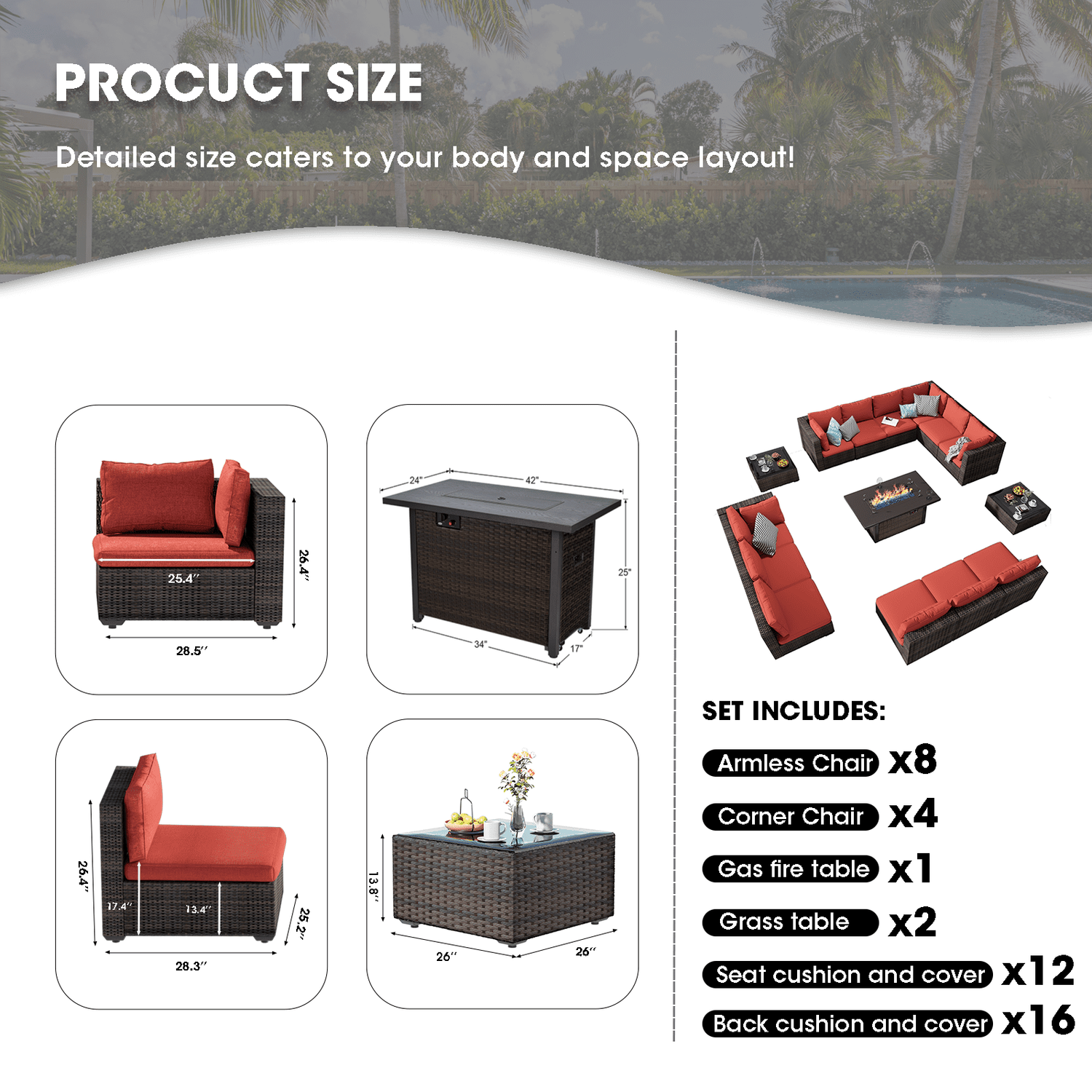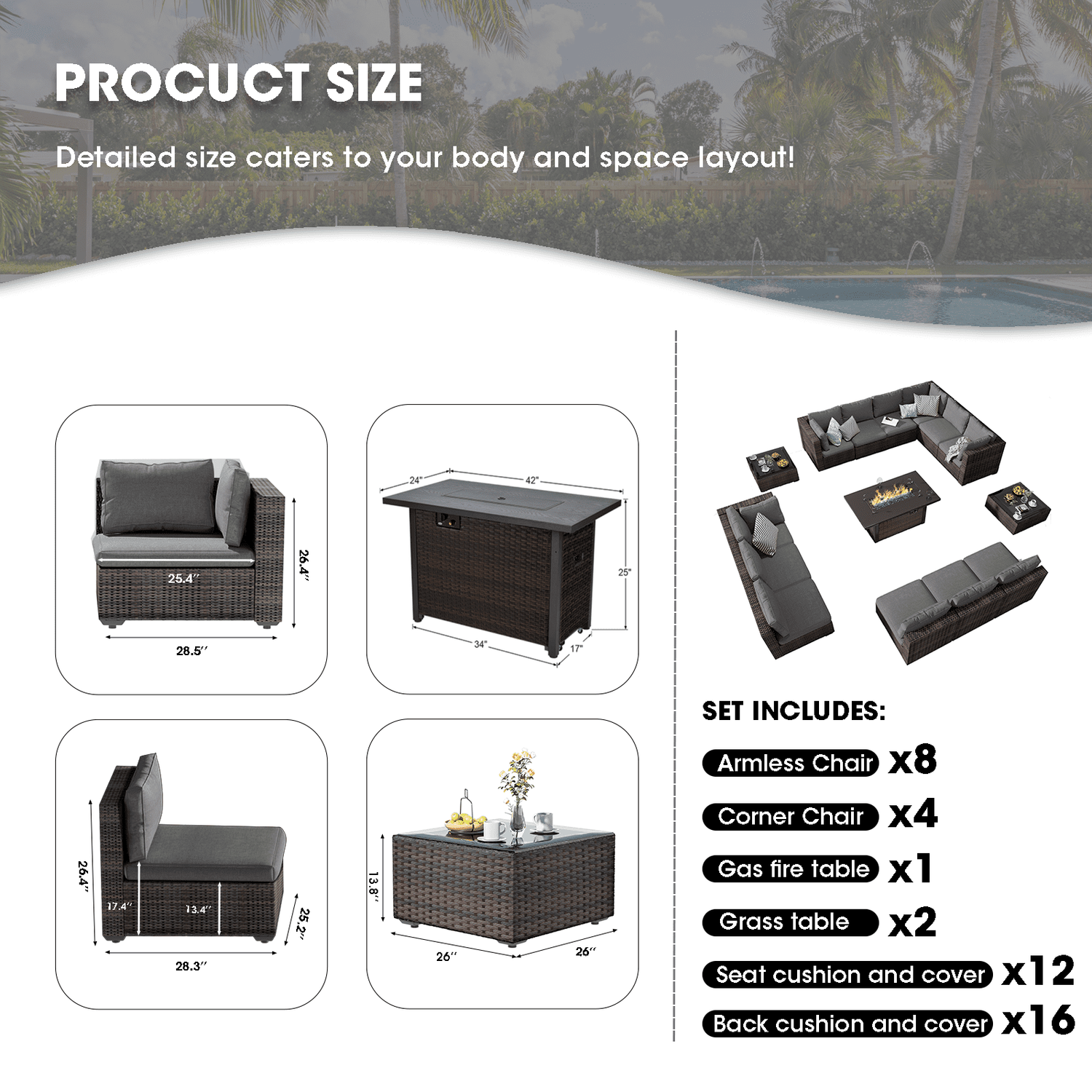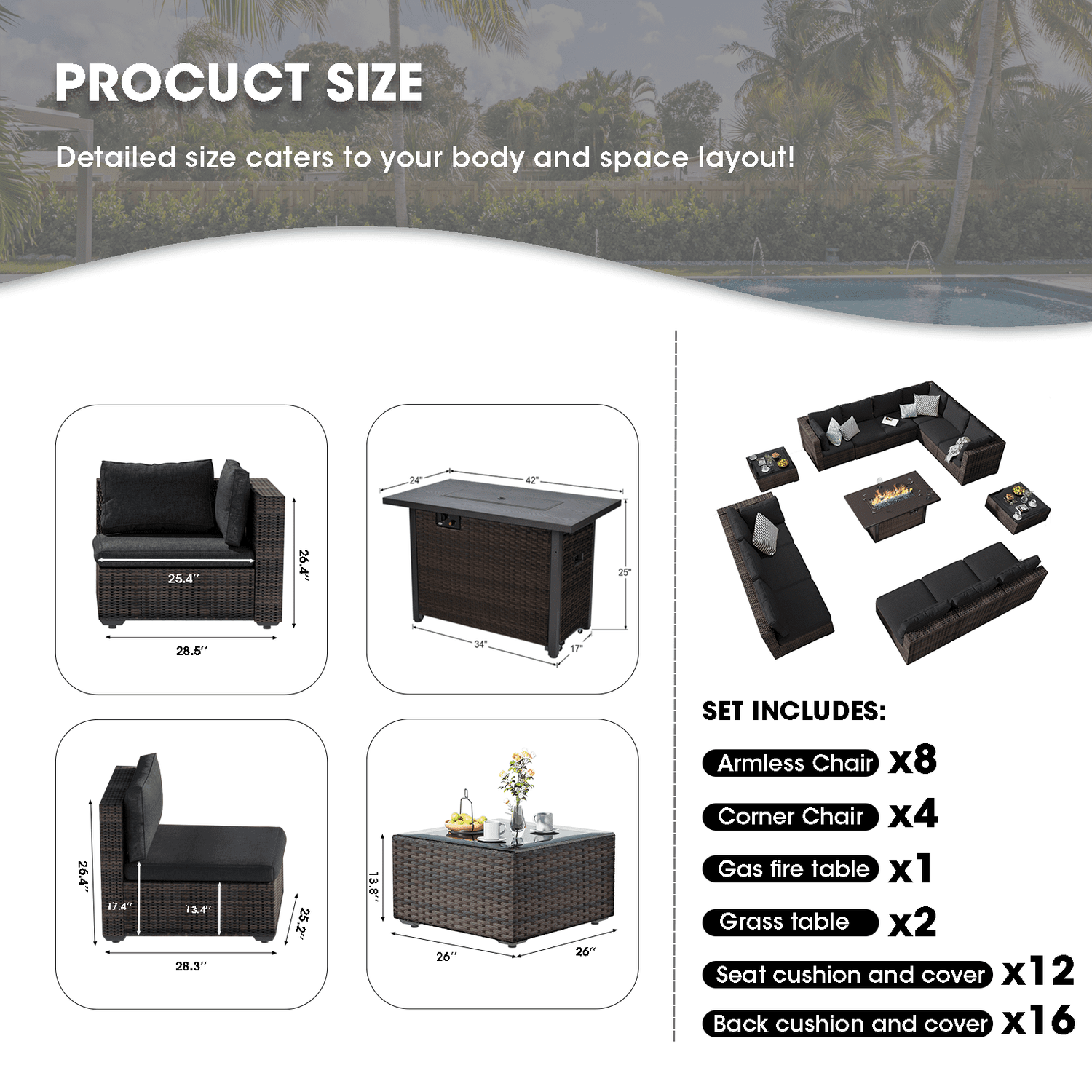 Gaildon 15 Pieces Patio Furniture Set with Fire Pit Table, All Weather Outdoor Sectional PE Rattan, Patio Conversation Sets Cushions Black-glass Coff