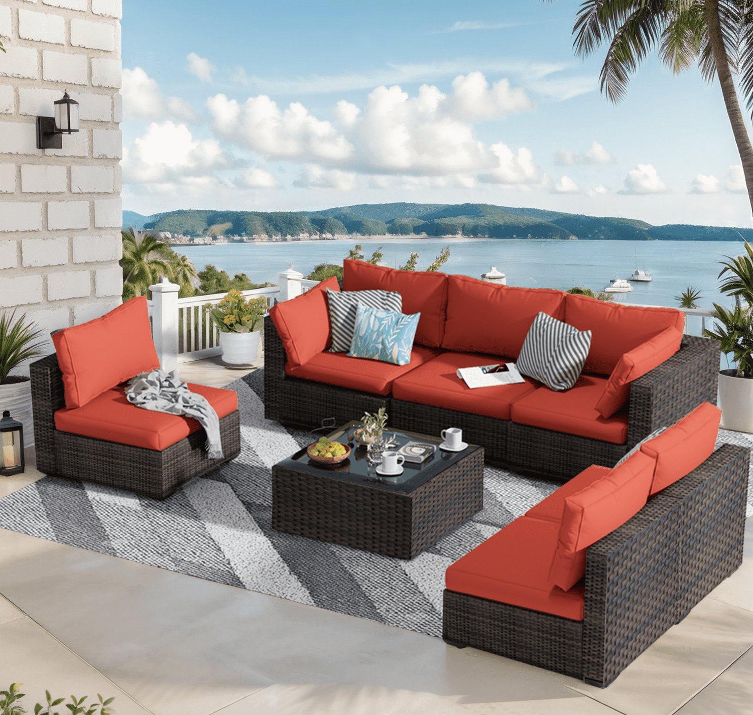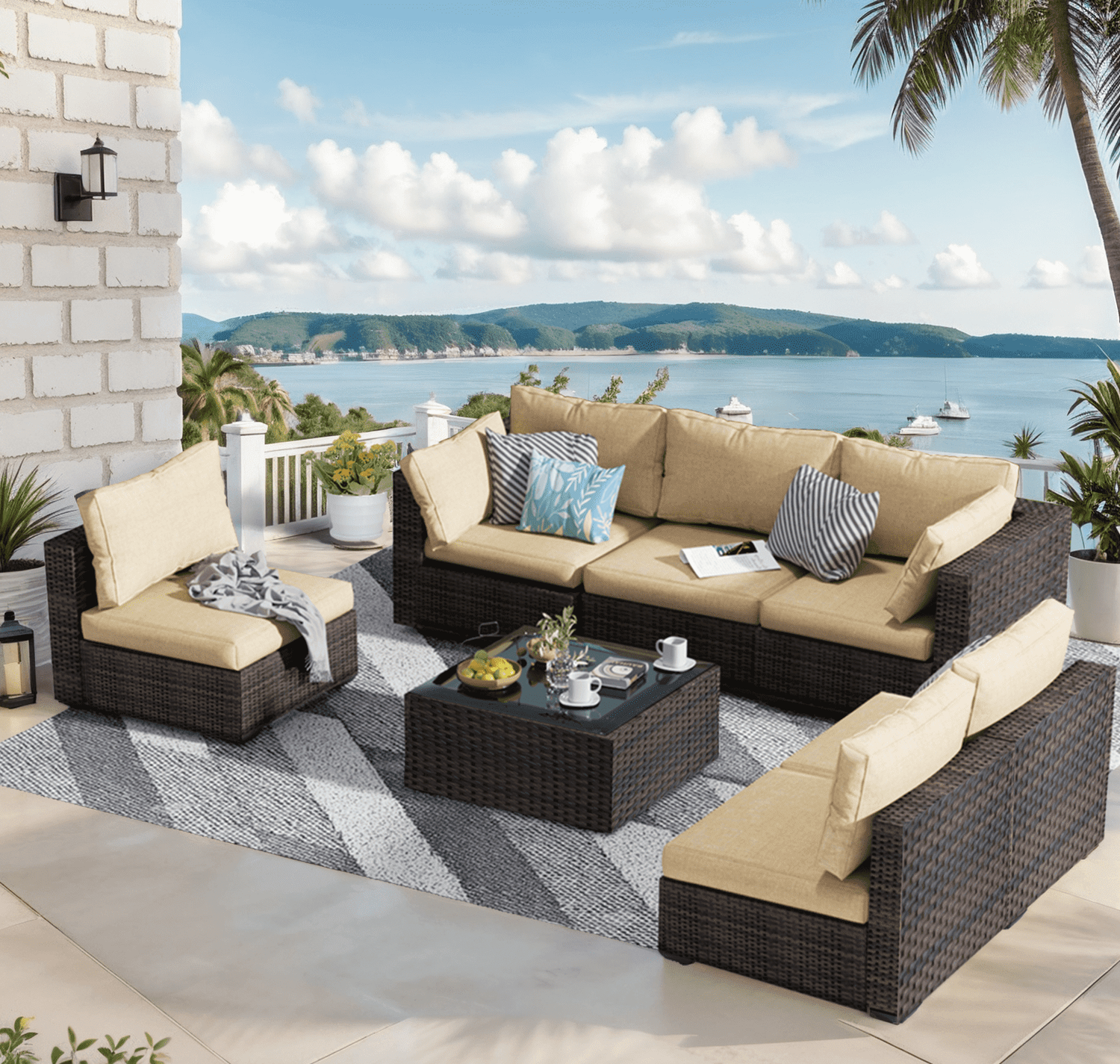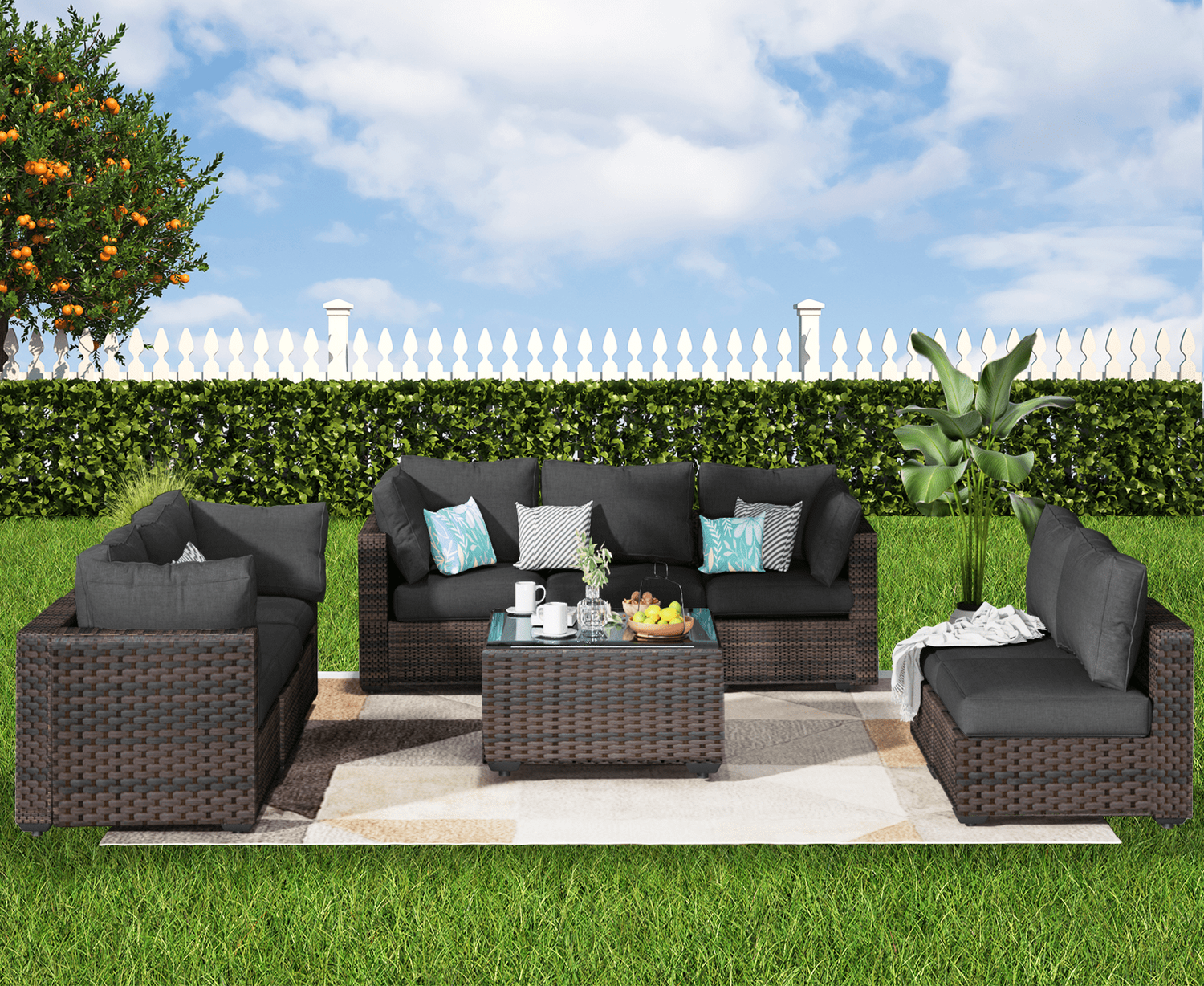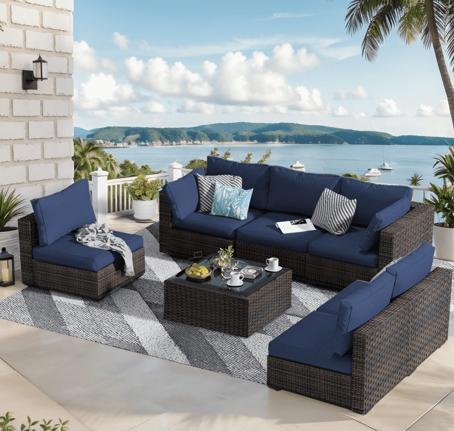 Gaildon 7 Patio Outdoor Furniture Wicker Sectional Sofa Couch Lawn Sectional Black Glass Table, Blue