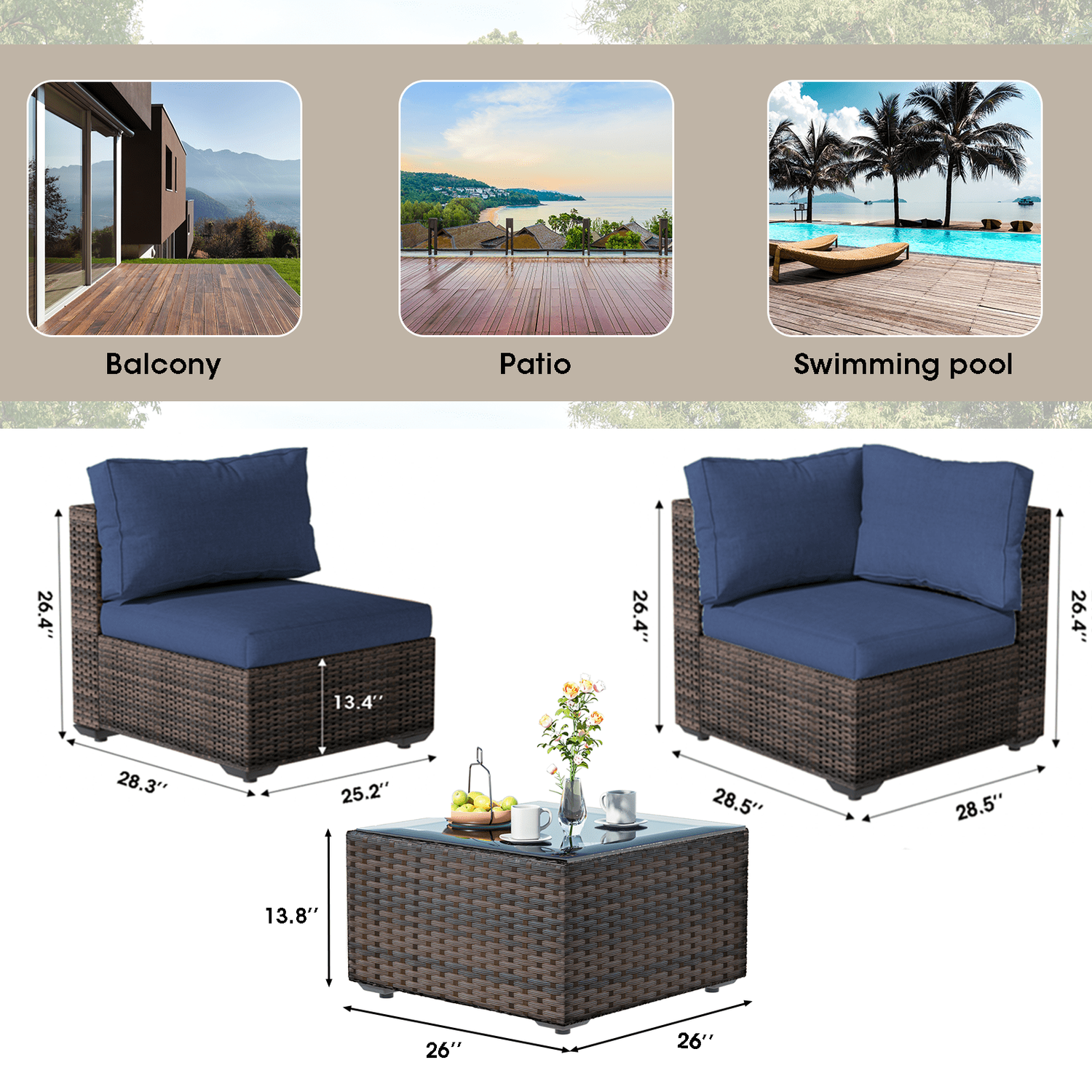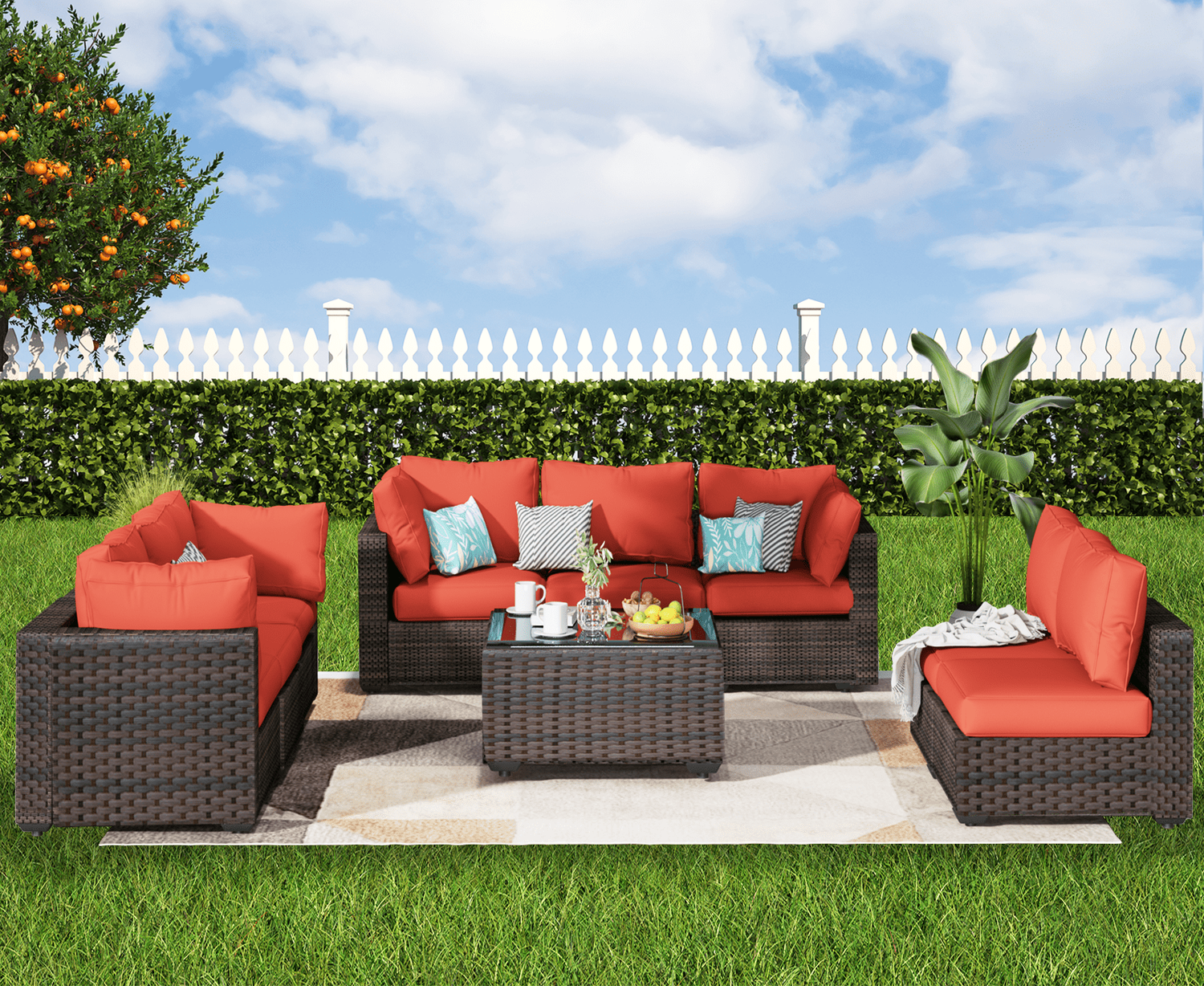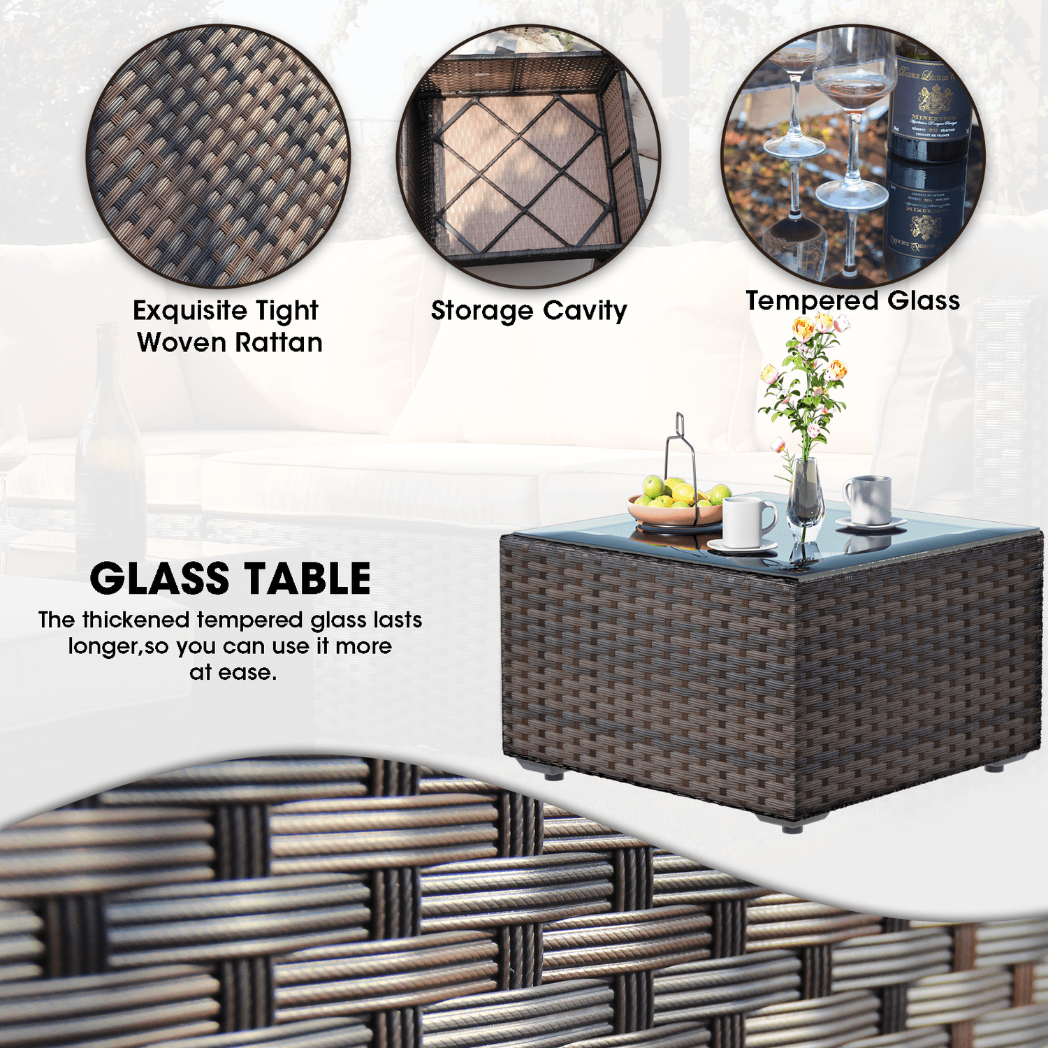 Gaildon 7 Patio Outdoor Furniture Wicker Sectional Sofa Couch Lawn Sectional Black Glass Table, Blue