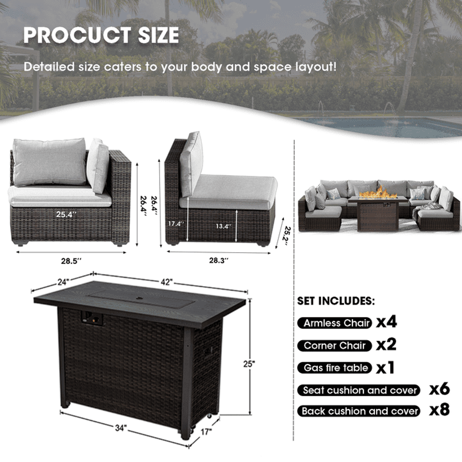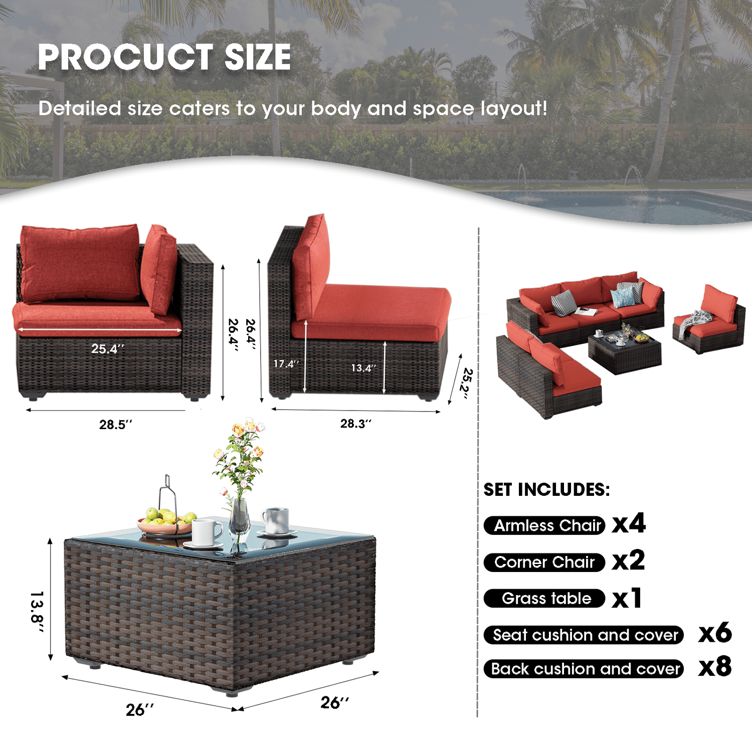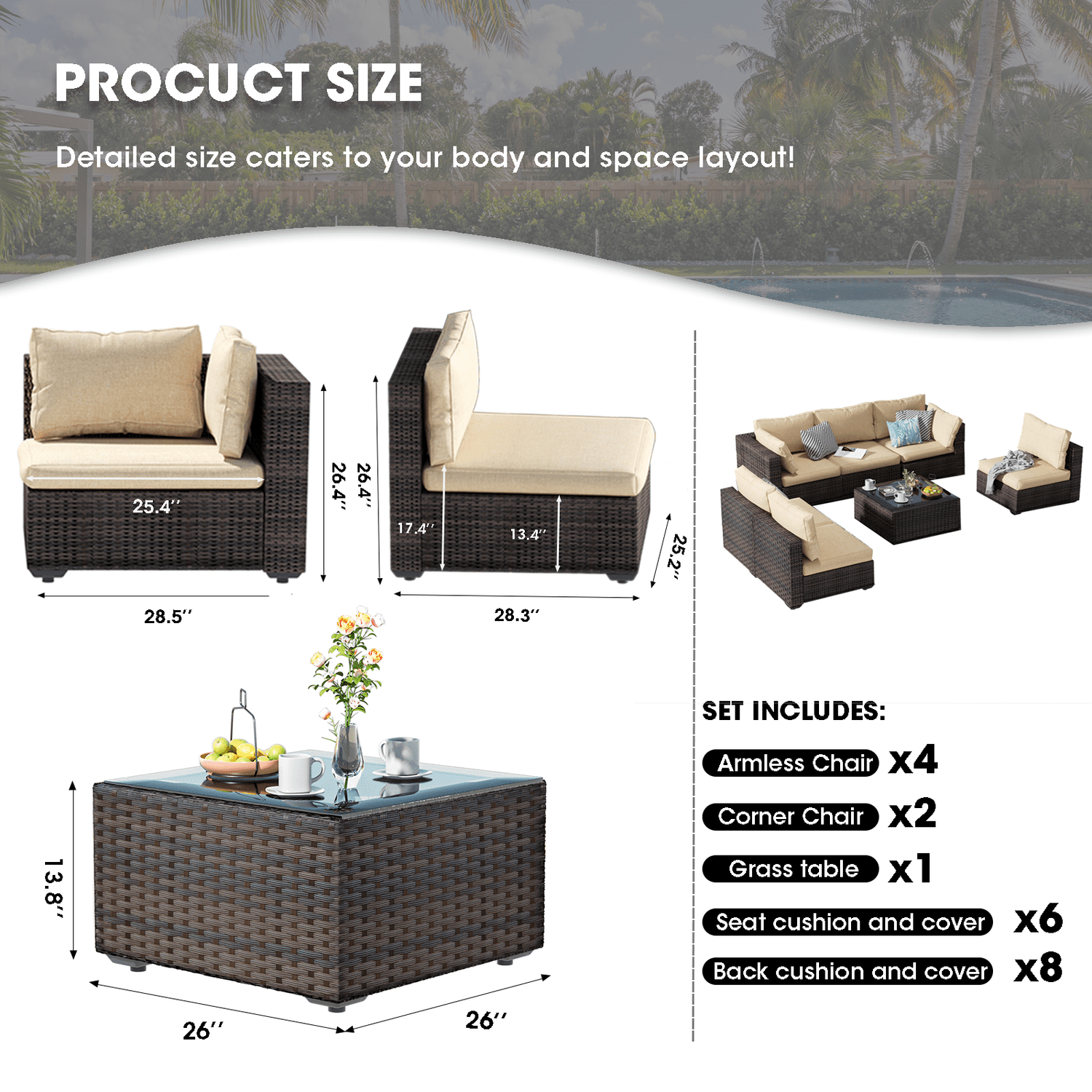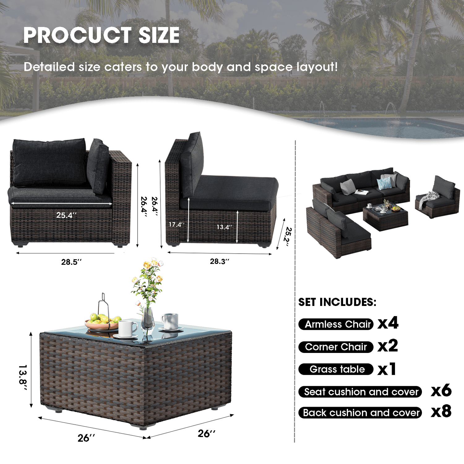Gaildon 7 Patio Outdoor Furniture Wicker Sectional Sofa Couch Lawn Sectional Black Glass Table, Blue