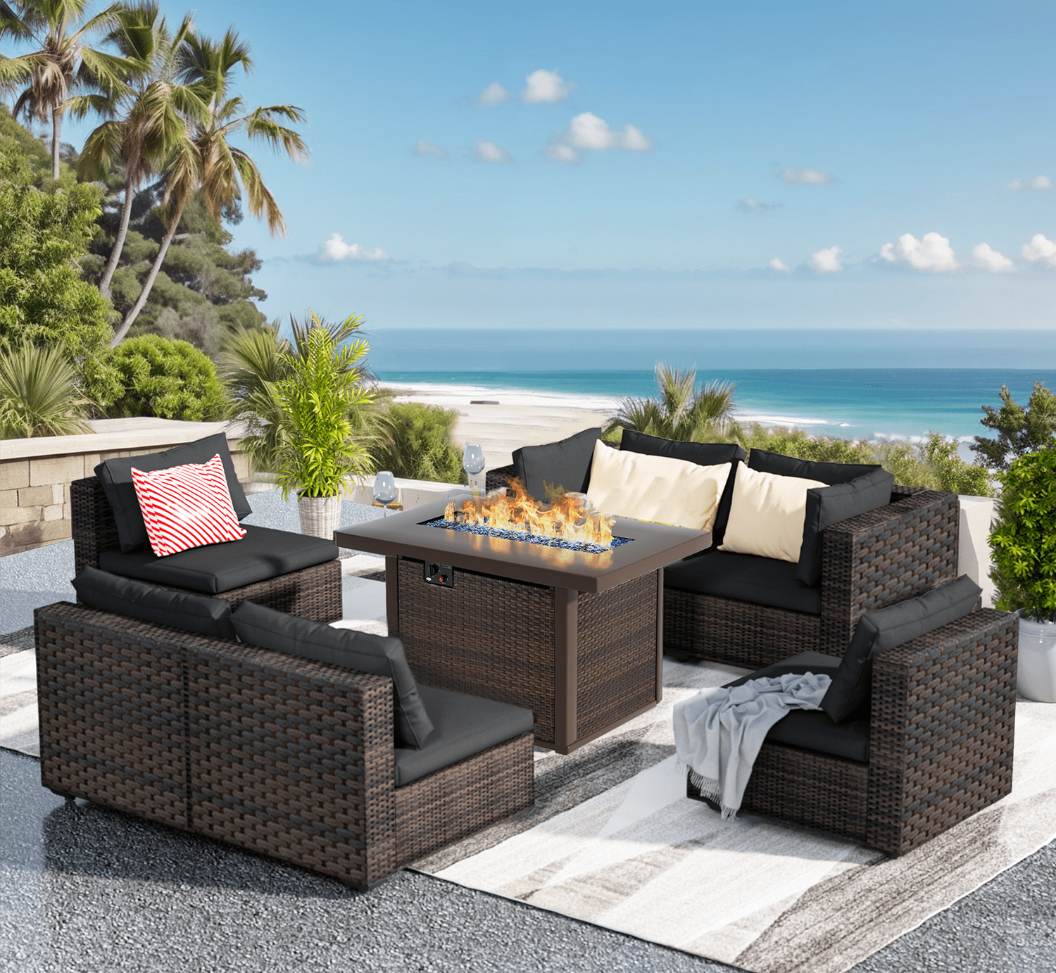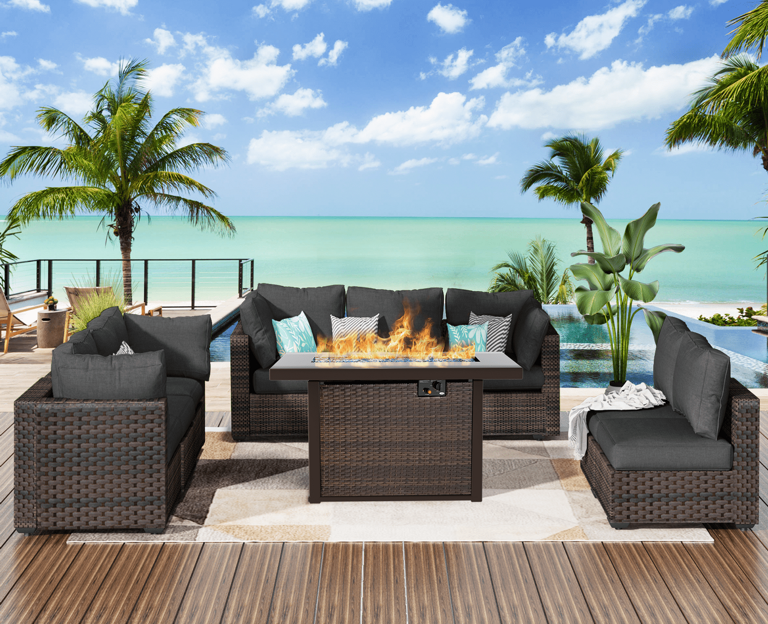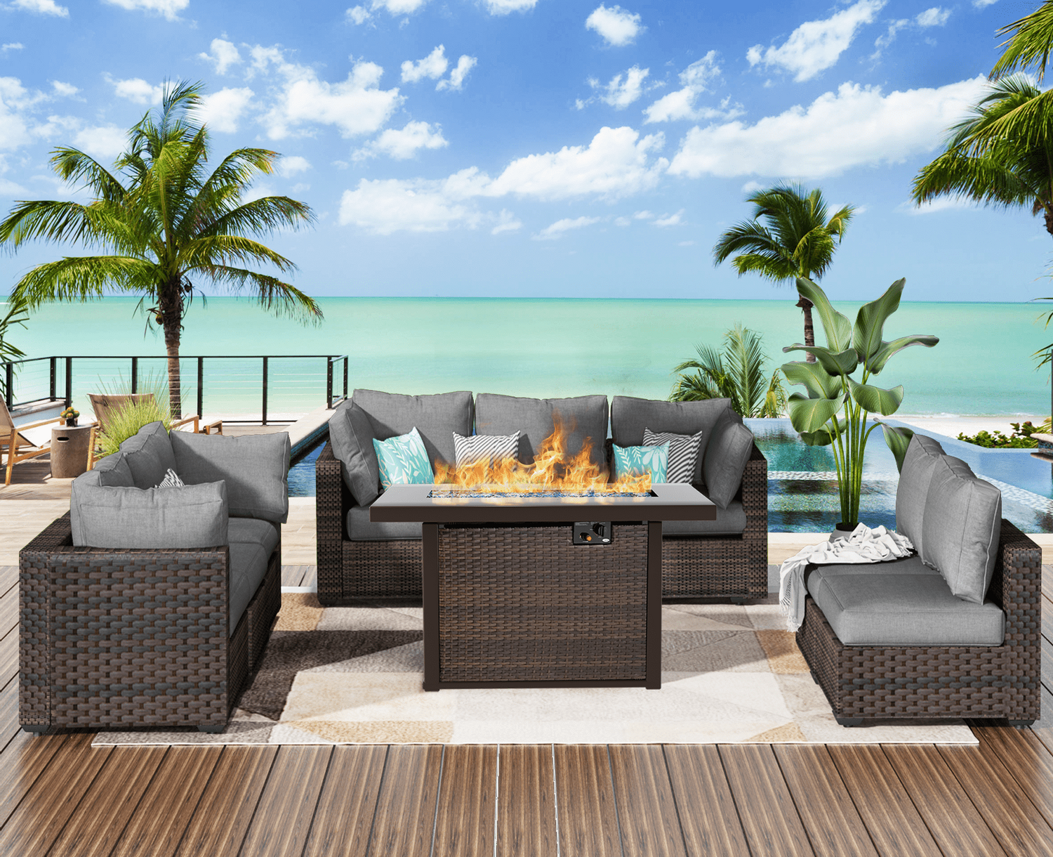 Gaildon 7 Piece Patio Furniture Set with Fire Pit Table, All Weather Outdoor Sectional PE Rattan, Patio Conversation Sets with Cushions and Glass Coff