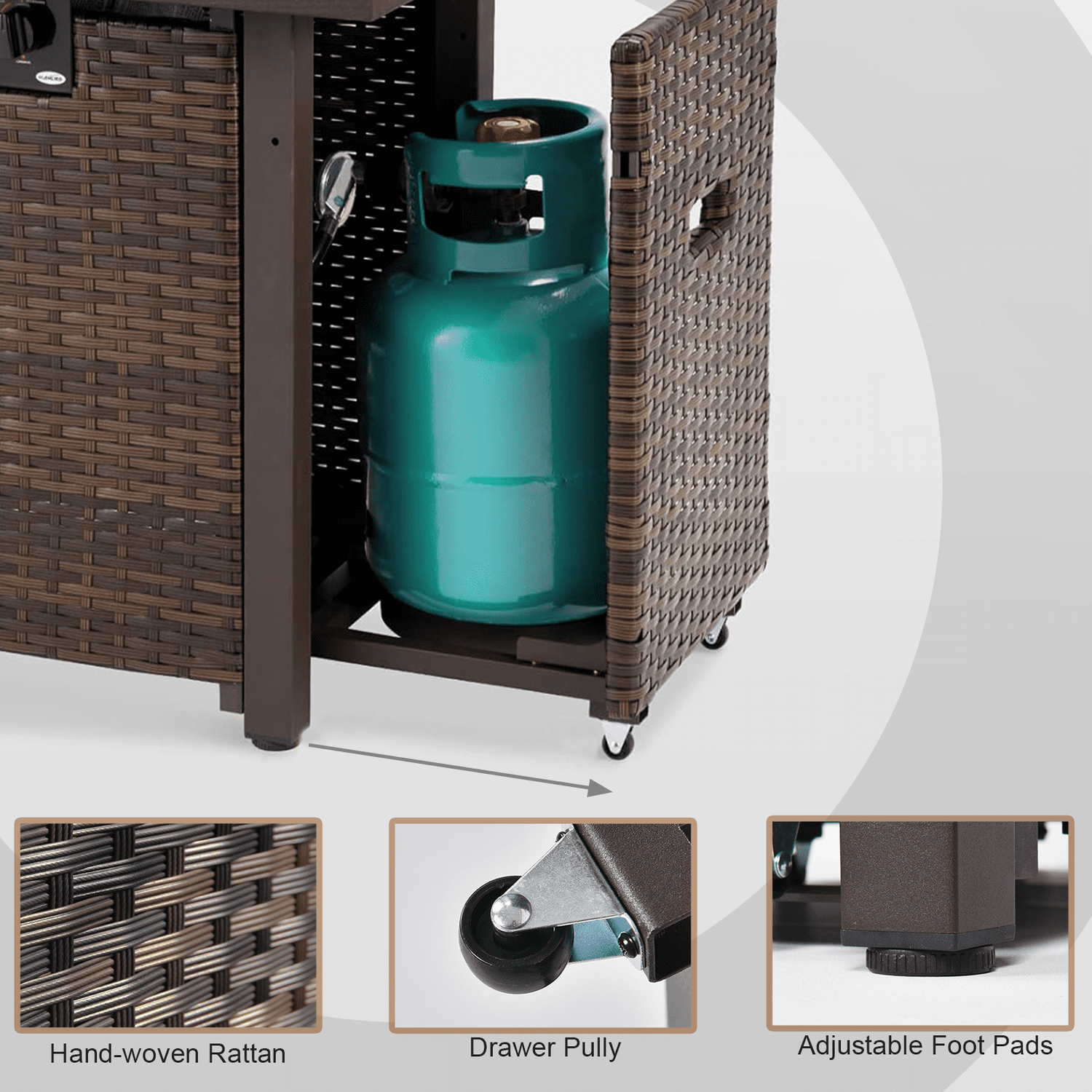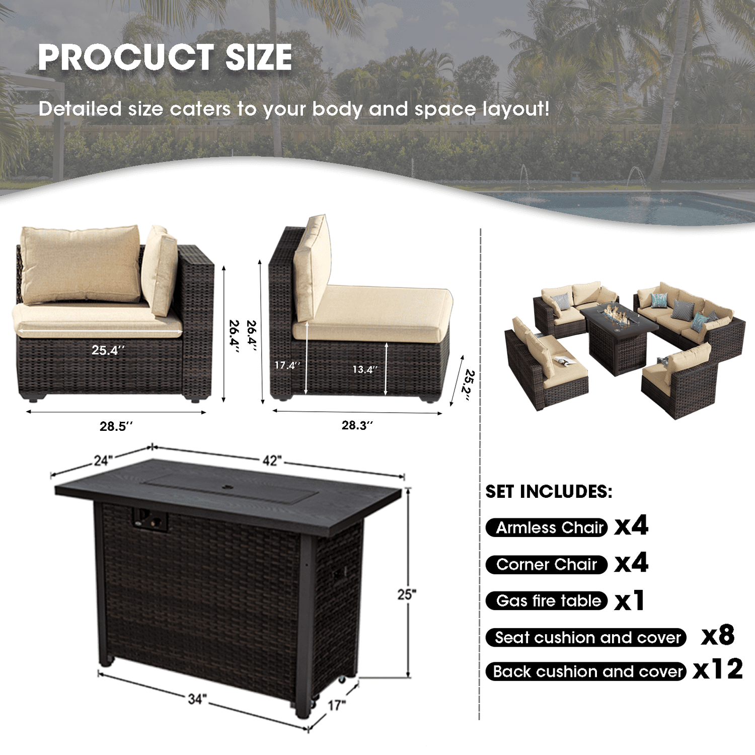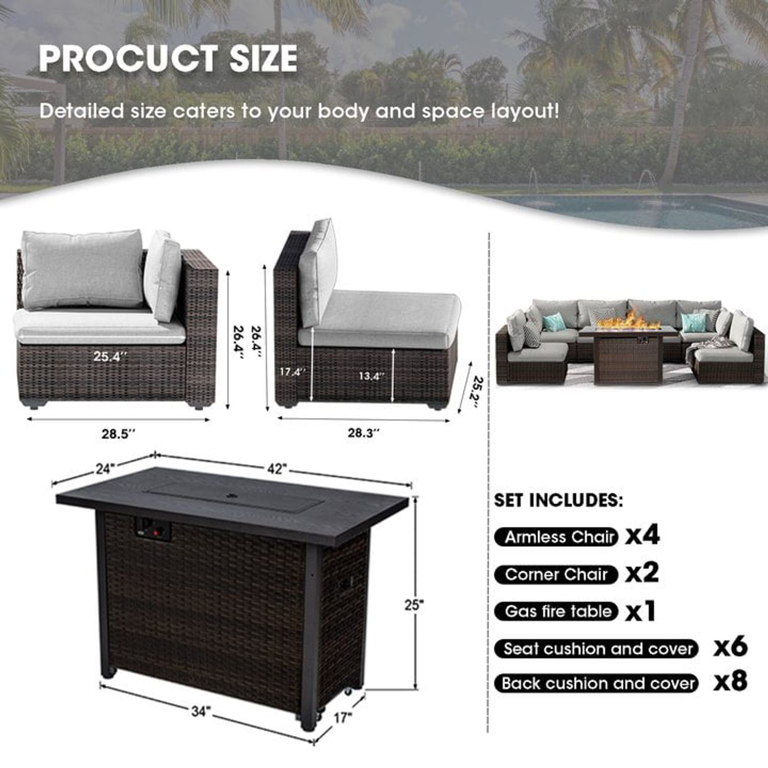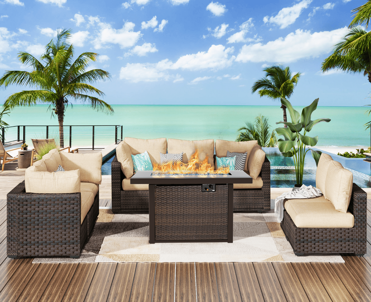 Gaildon 7 Piece Patio Furniture Set with Fire Pit Table, All Weather Outdoor Sectional PE Rattan, Patio Conversation Sets with Cushions and Glass Coff