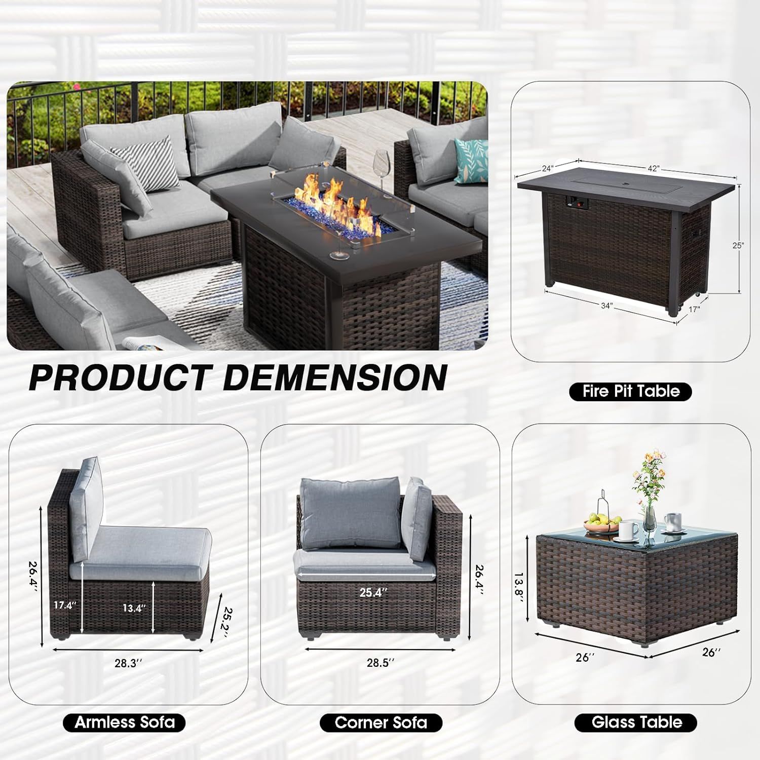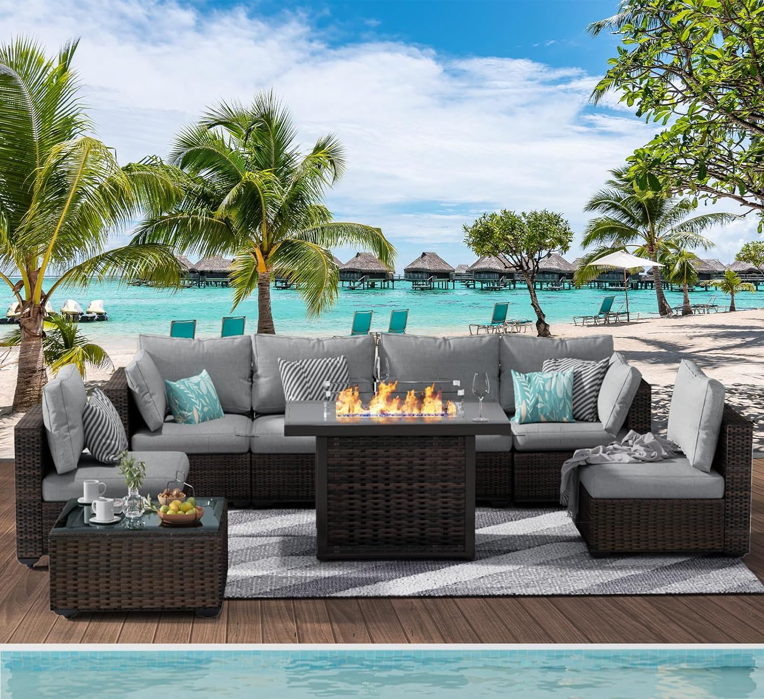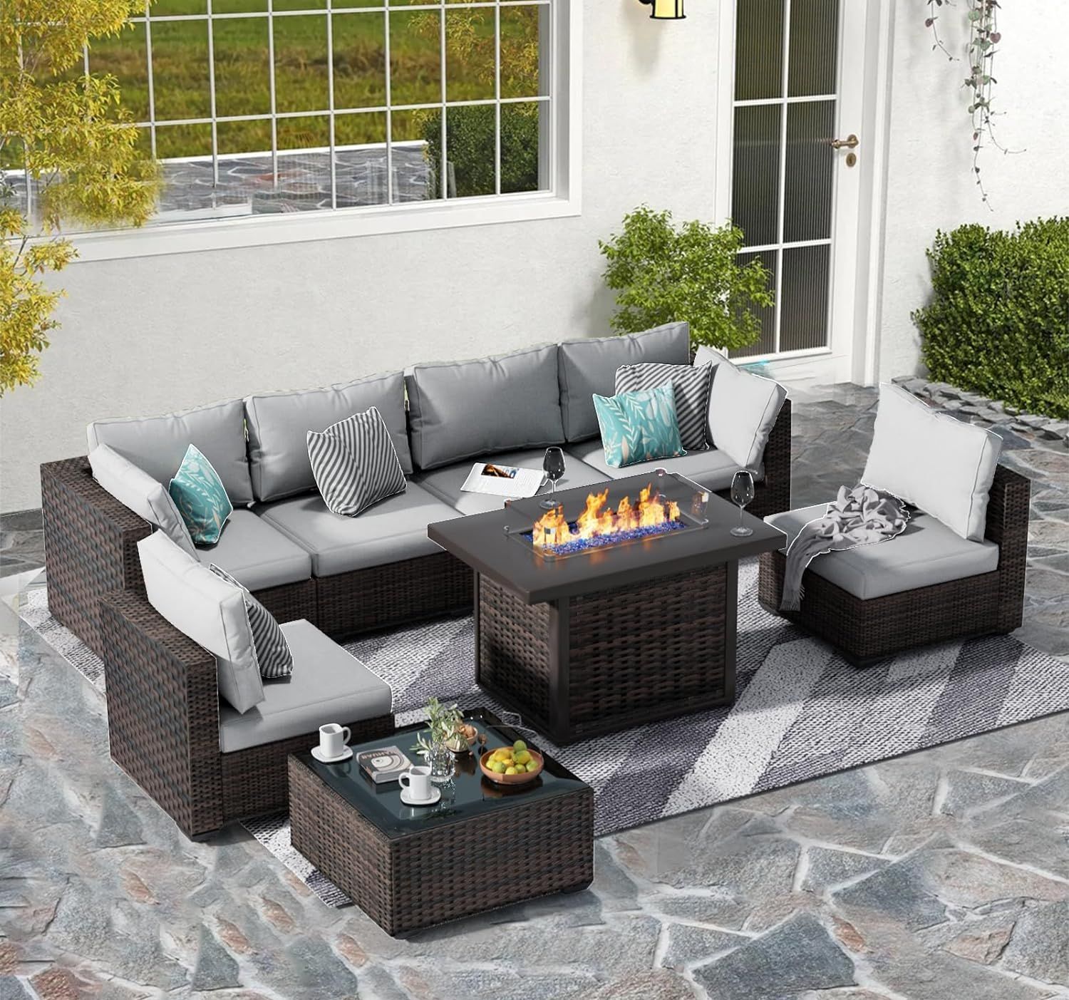 Gaildon 8 Piece Patio Furniture Set with Fire Pit Table, All Weather Outdoor Sectional PE Rattan