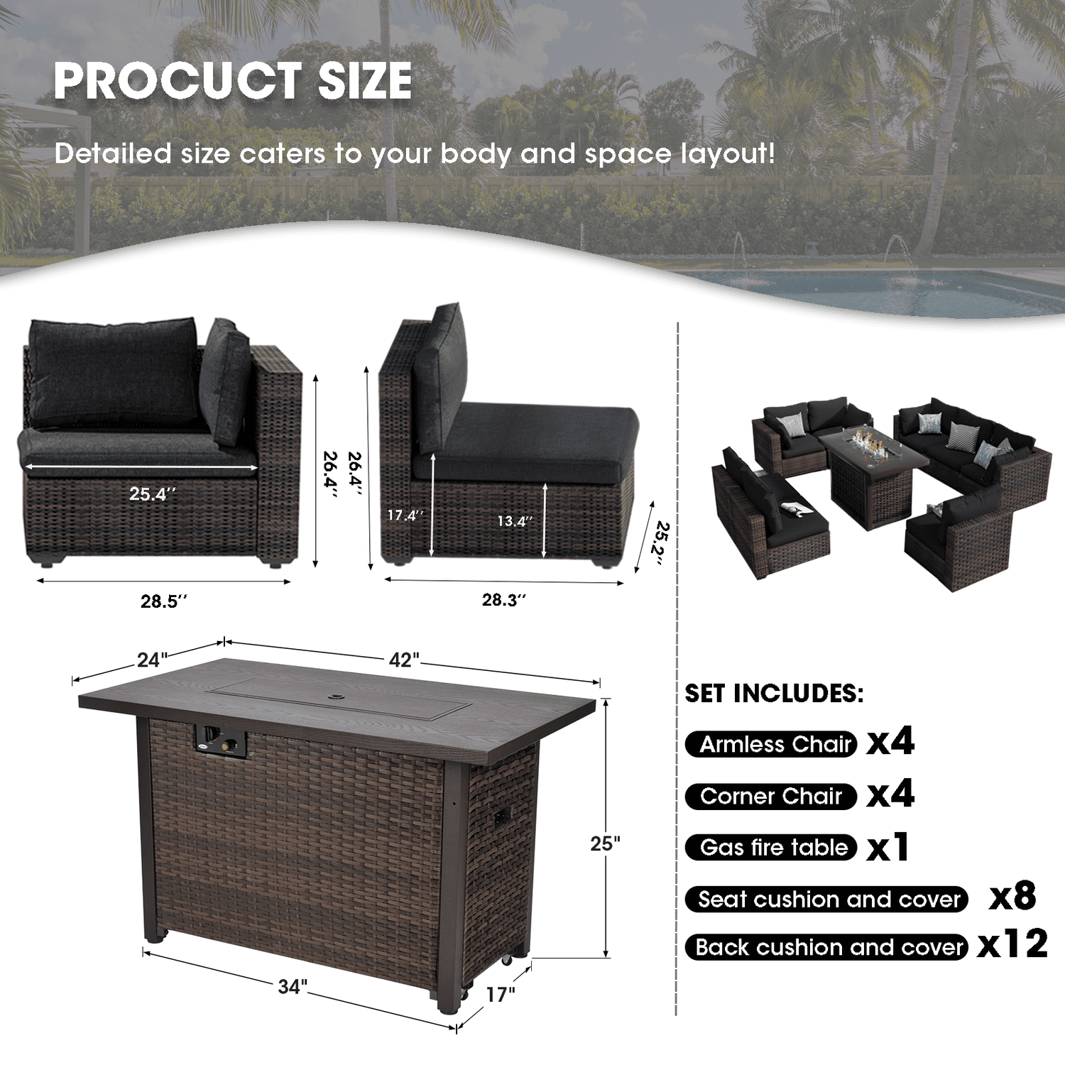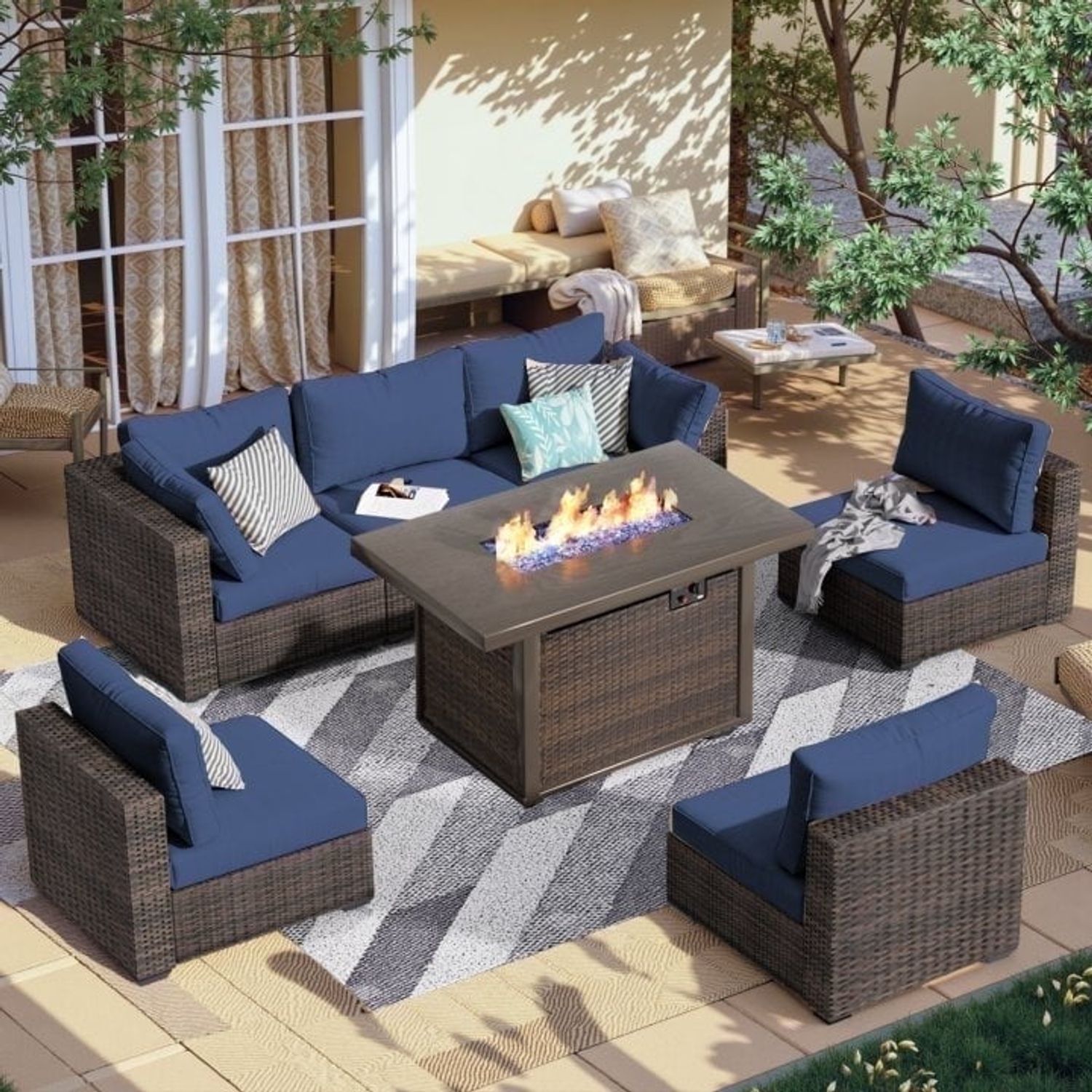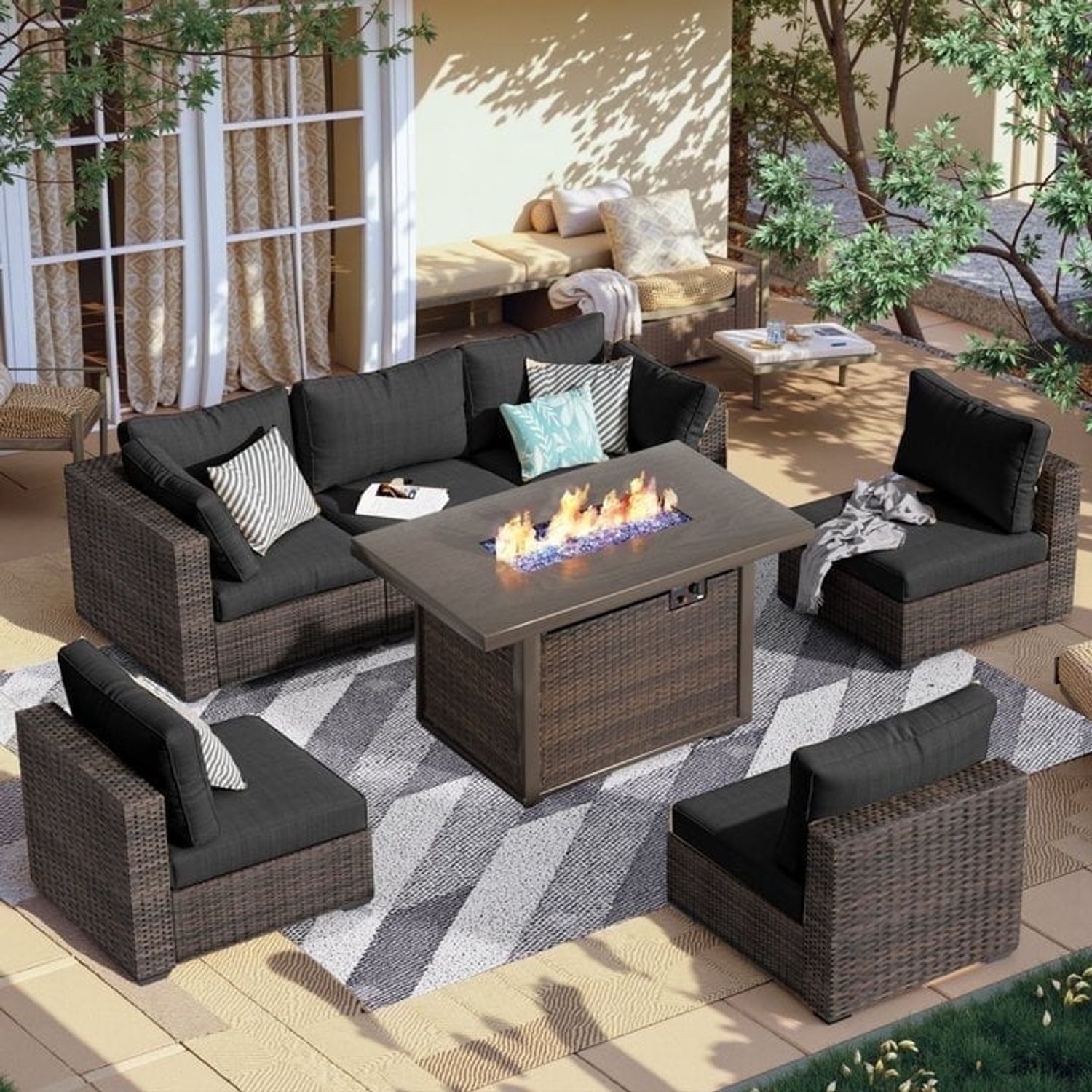 Gaildon 8 Piece Patio Furniture Set with Fire Pit Table, All Weather Outdoor Sectional PE Rattan, Patio Conversation Sets with Cushions and Glass Coff