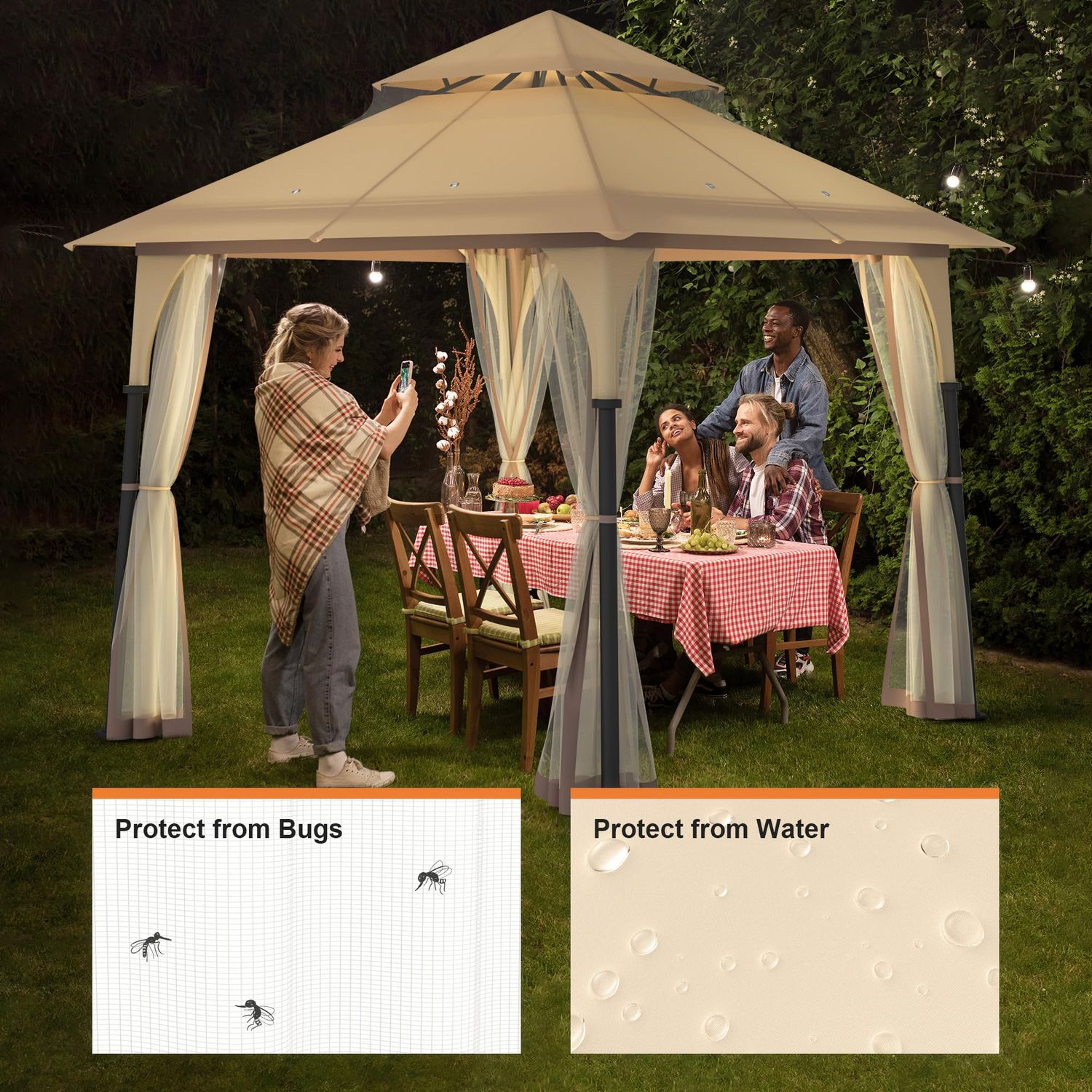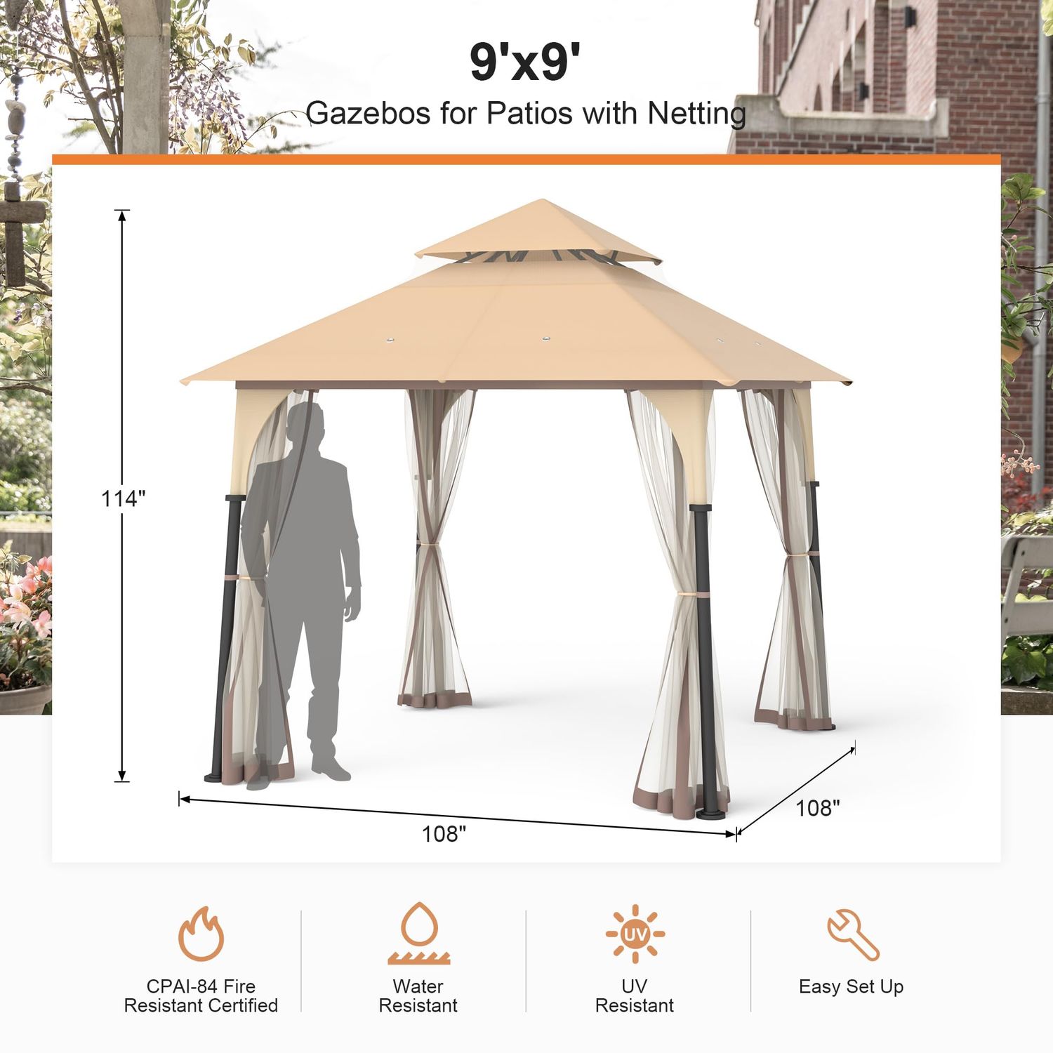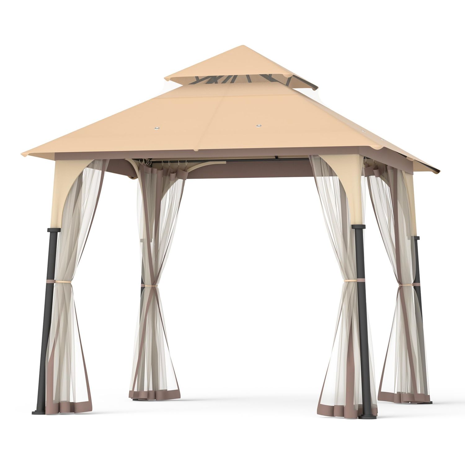 Gazebo 9'x9' Outdoor Canopy Tent with Double Roofs and Mosquito Netting for Patio Garden Backyard Beige