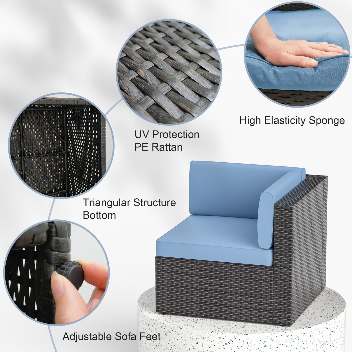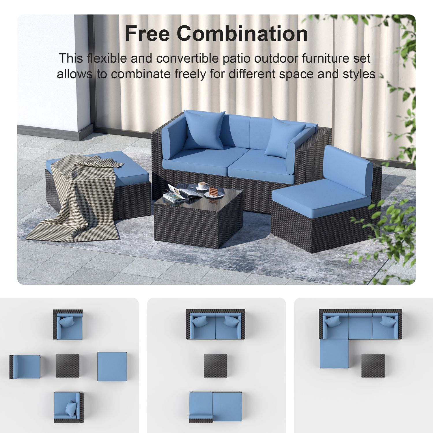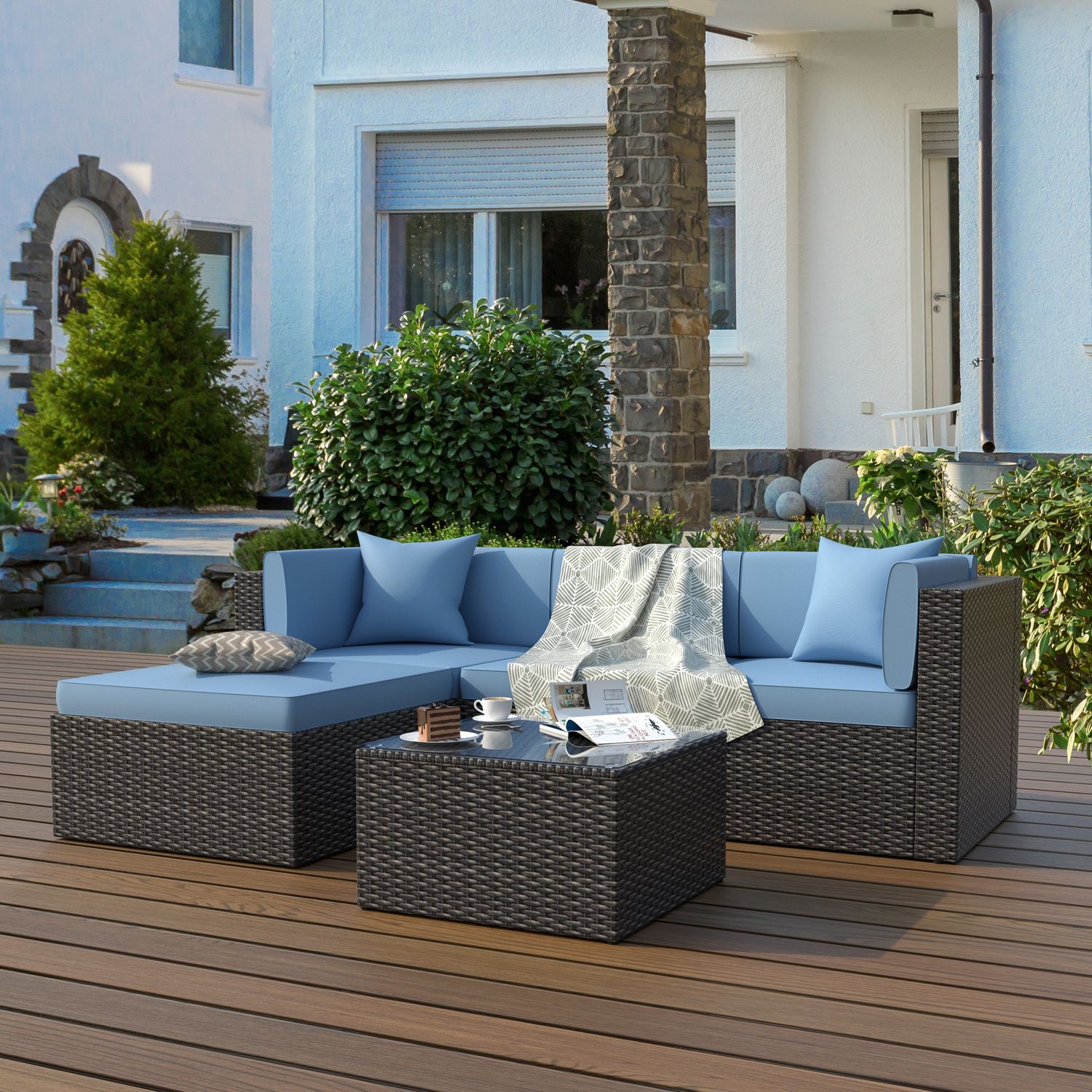 Gojooasis 5 PCS Patio Furniture Set PE Wicker Sectional Sofa w/Cushions Outdoor Blue Set