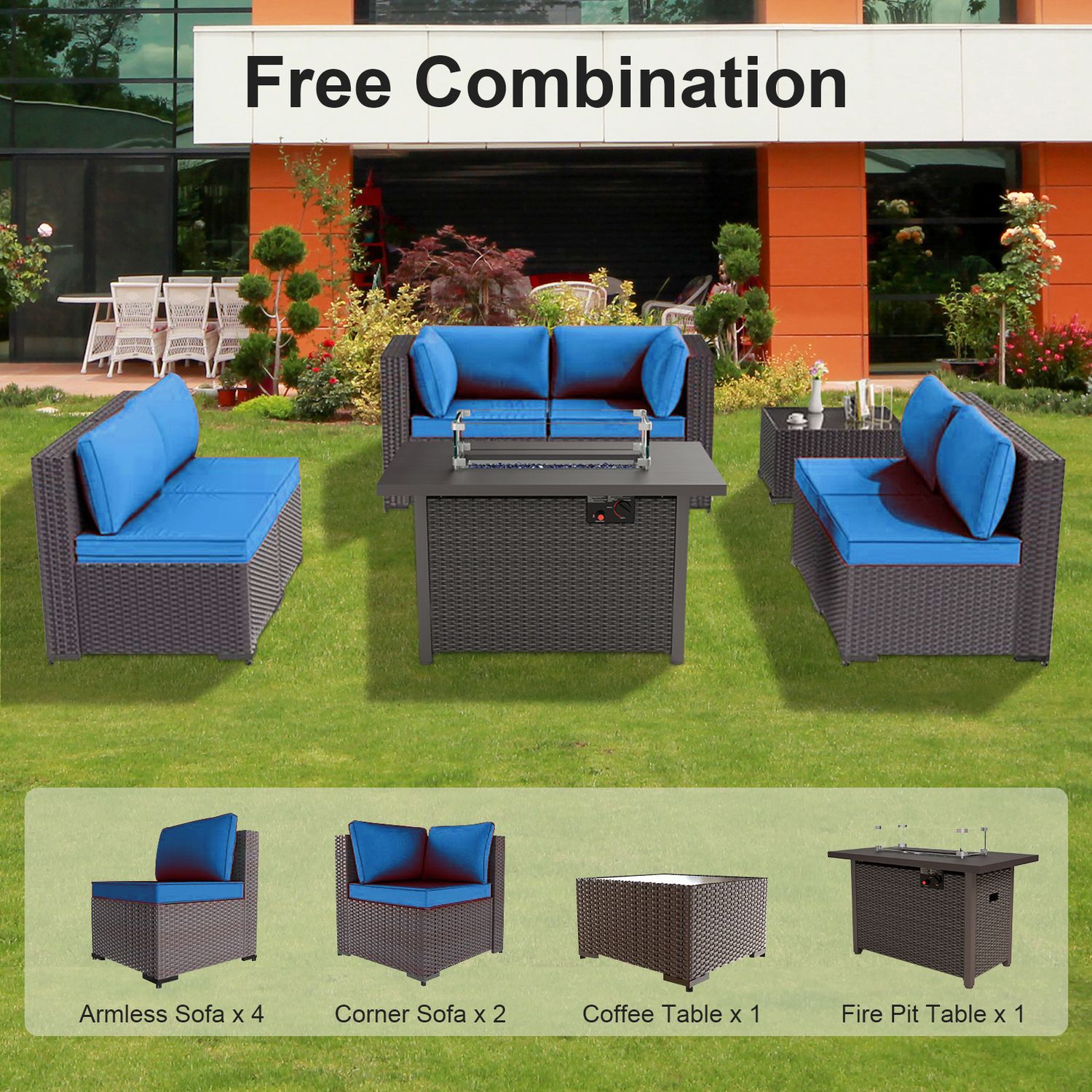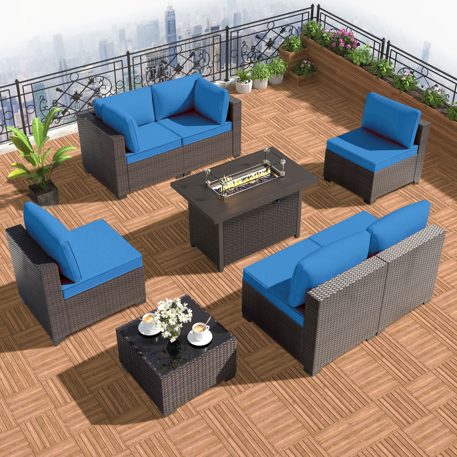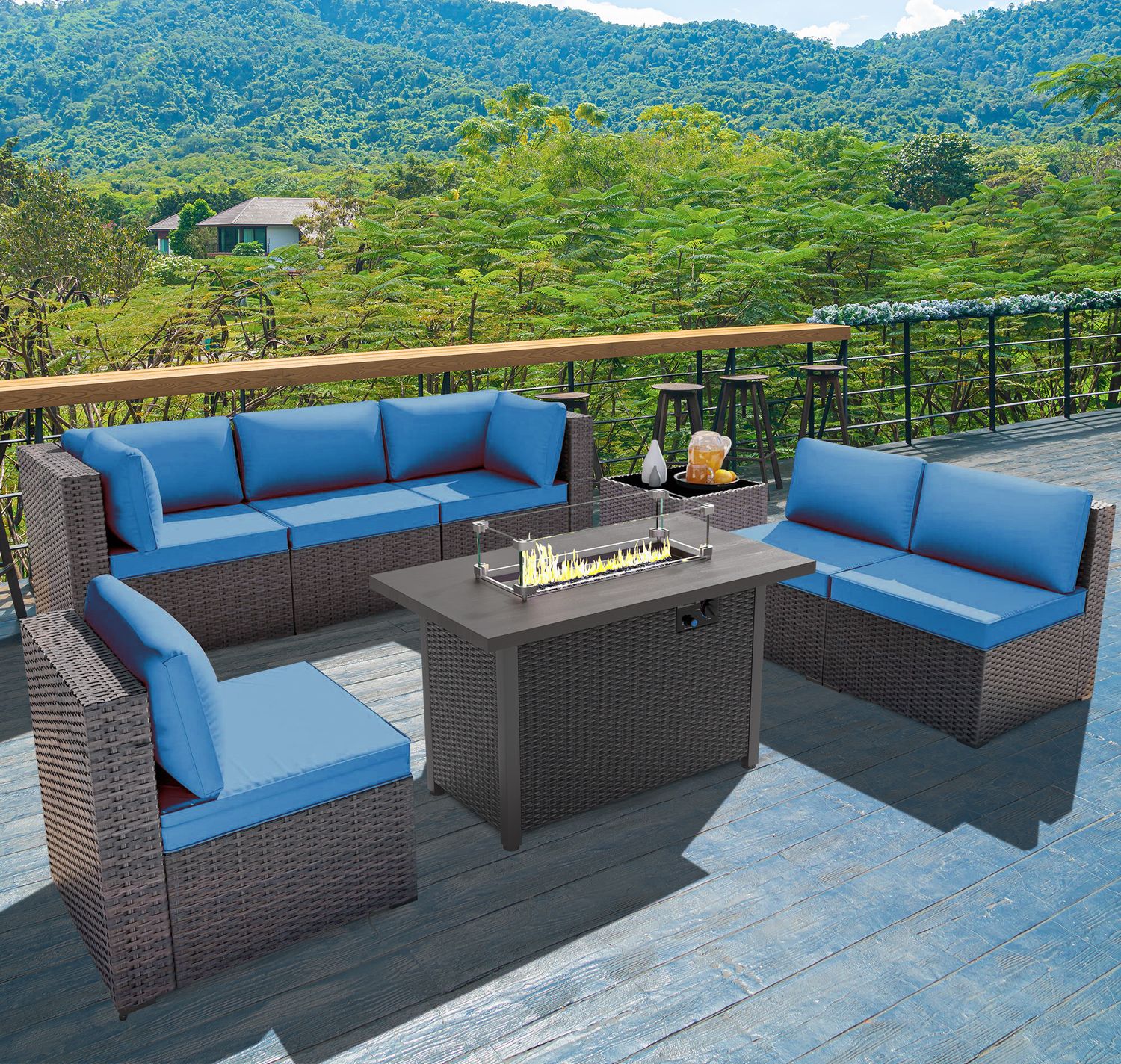 GOJOOASIS Blue 7PCS Outdoor Sectional Sofa With Fire Pit Dining Table
