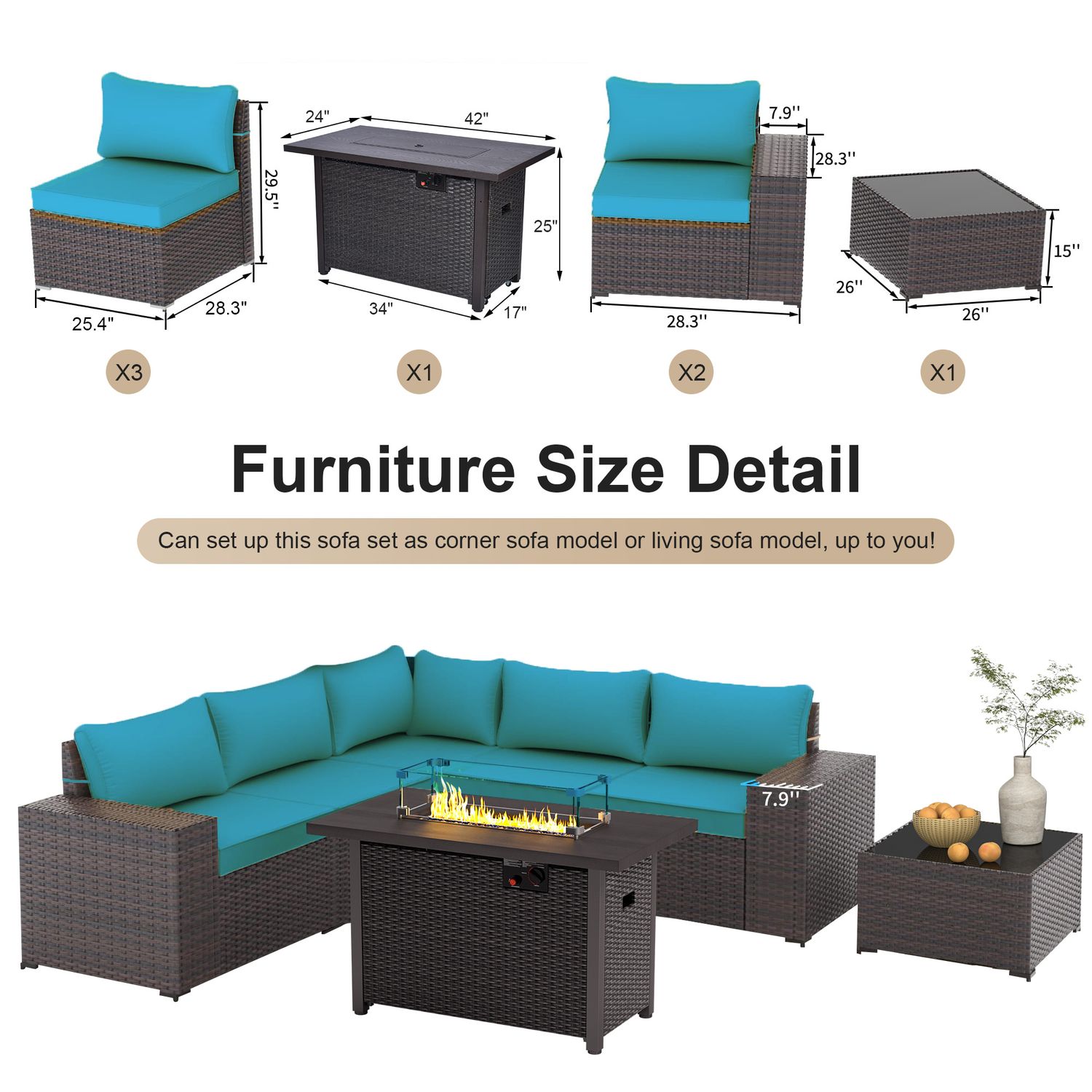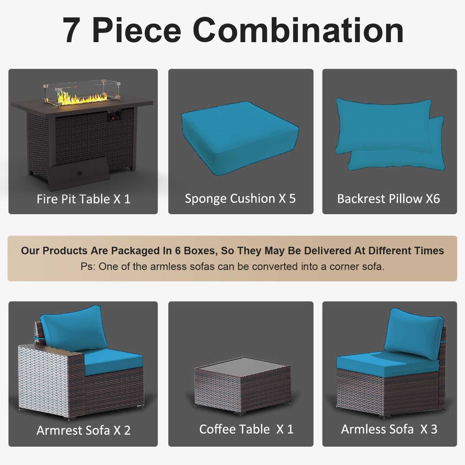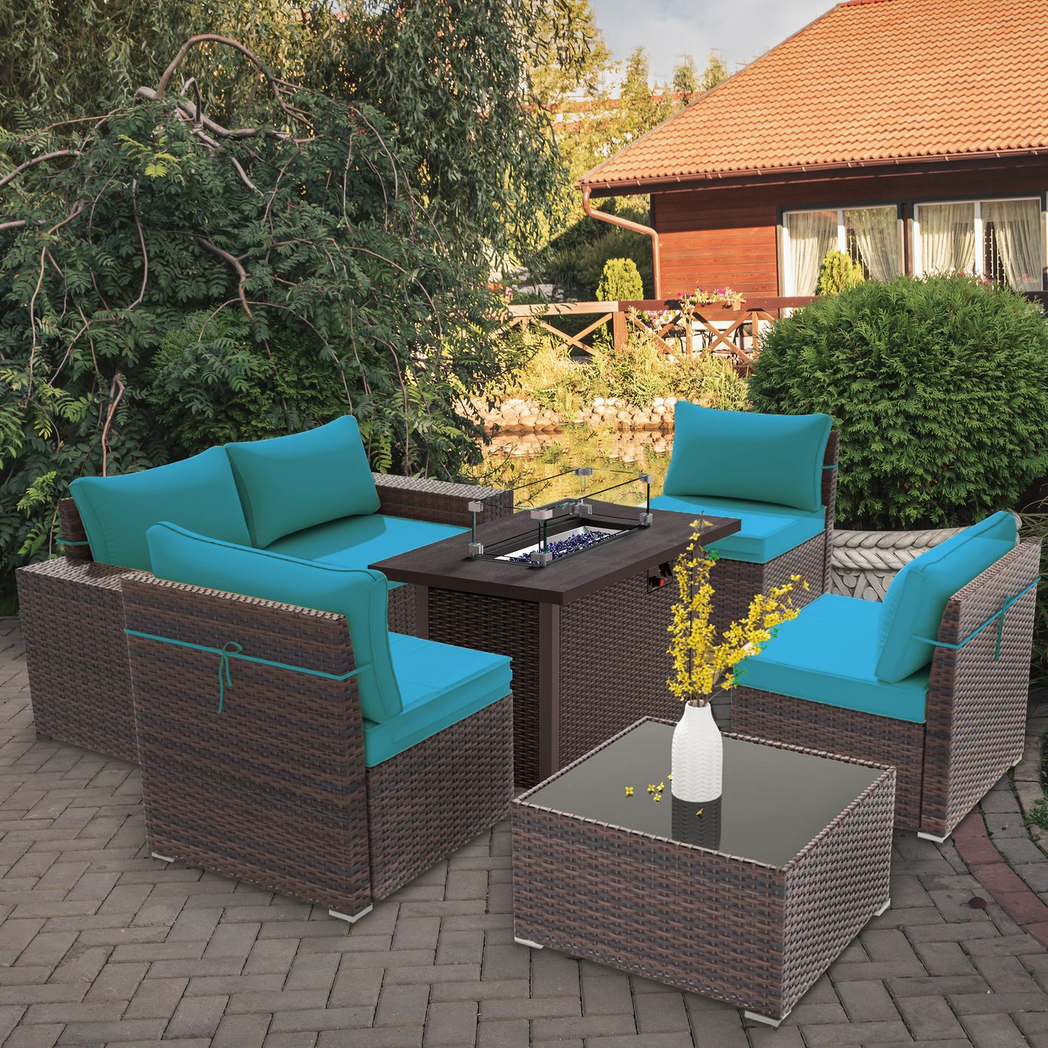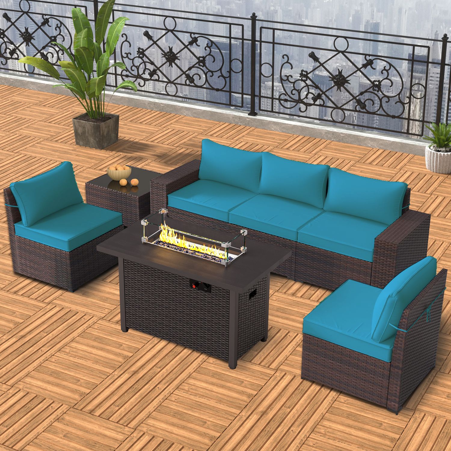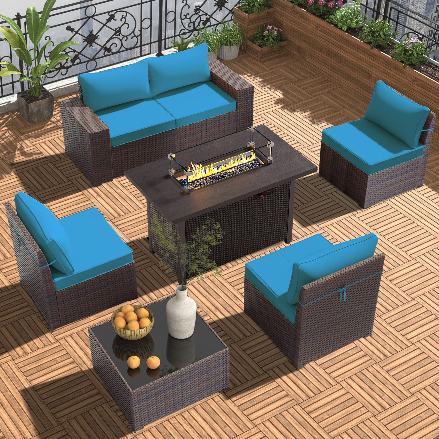 GOJOOASIS Blue 6PCS Outdoor Sectional Sofa With Fire Pit Dining Table