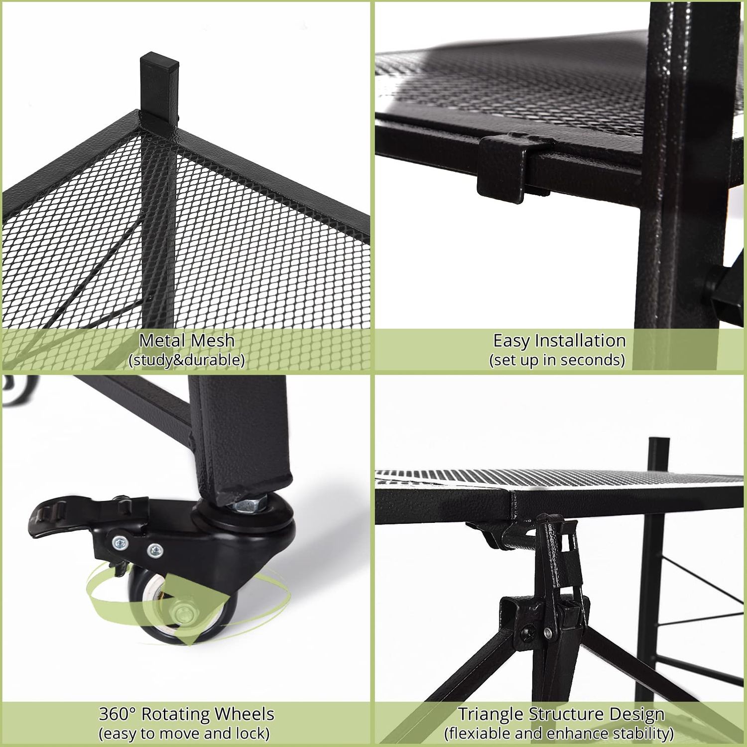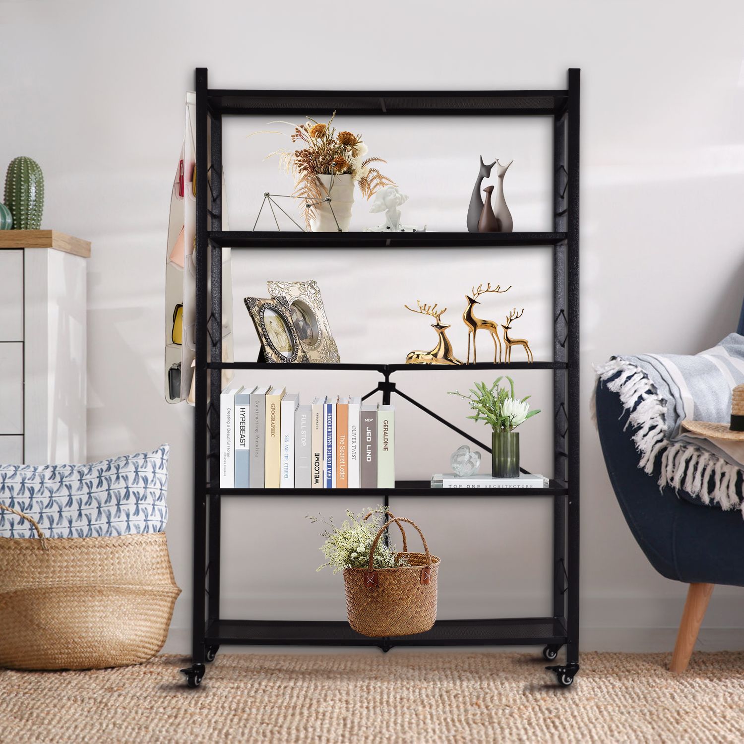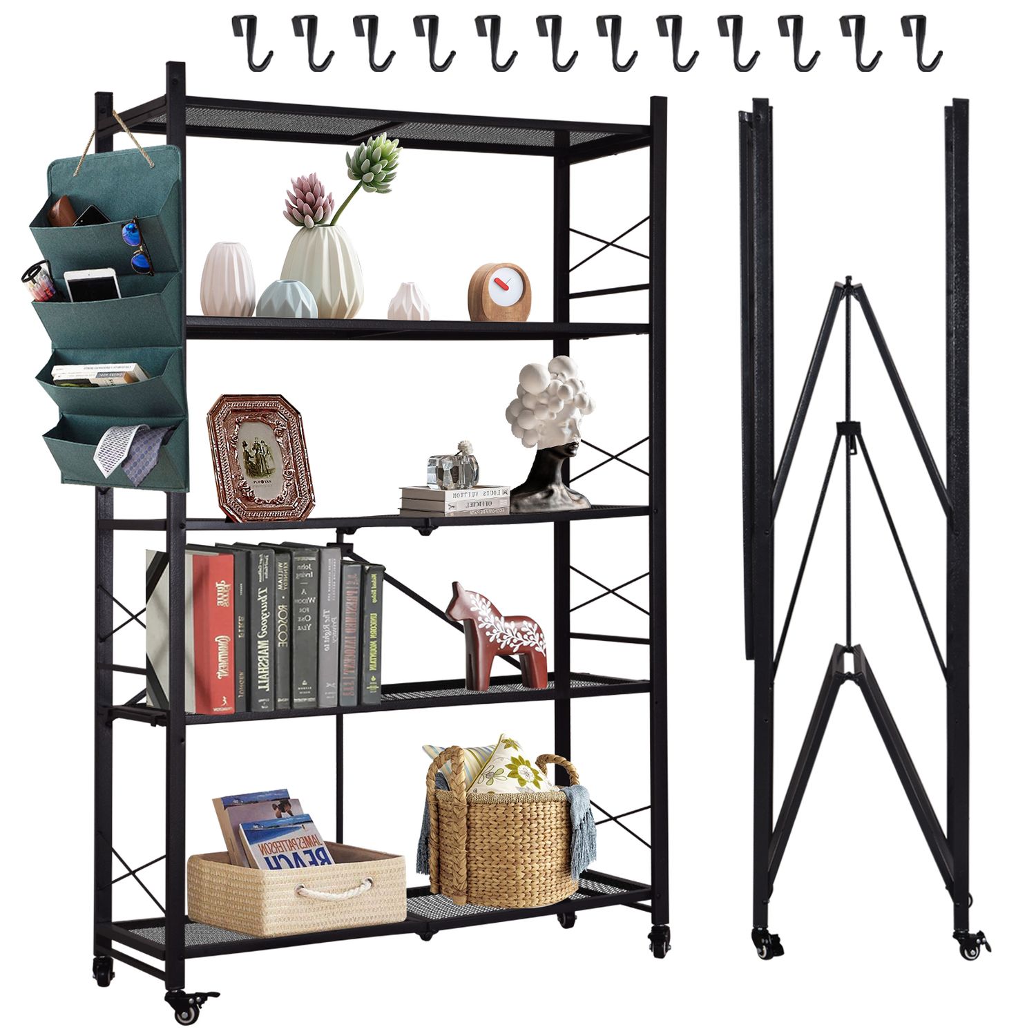 Grezone 5 Tier Foldable Shelves Metal Storage Shelves with Wheels - No Assembly Adult Group