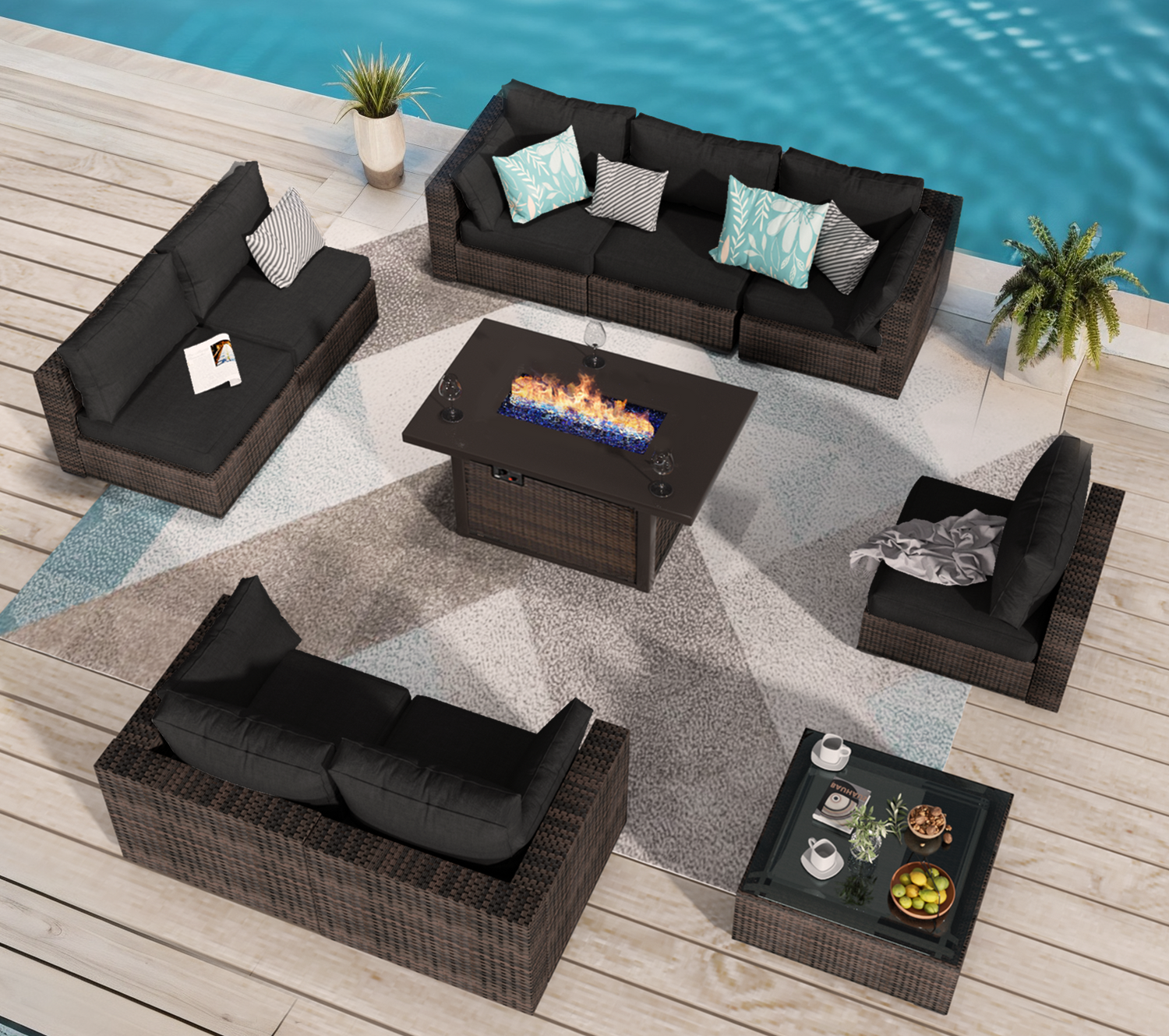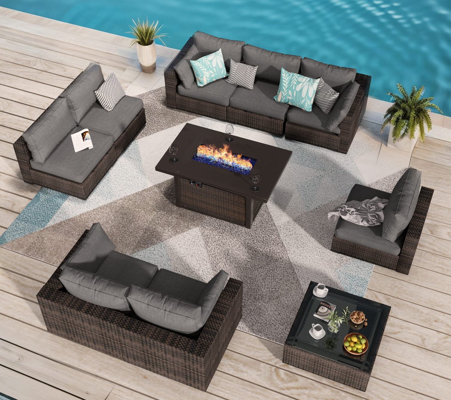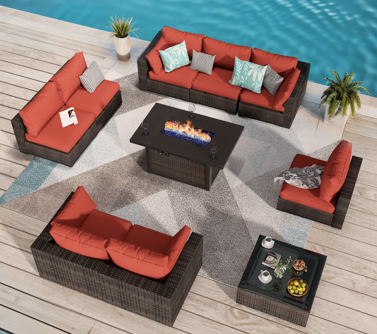 Grezone Outdoor Garden 10 Piece Patio Furniture with 43" 55000BTU Gas Propane Fire Pit Table Rattan Wicker Sectional Set, Red