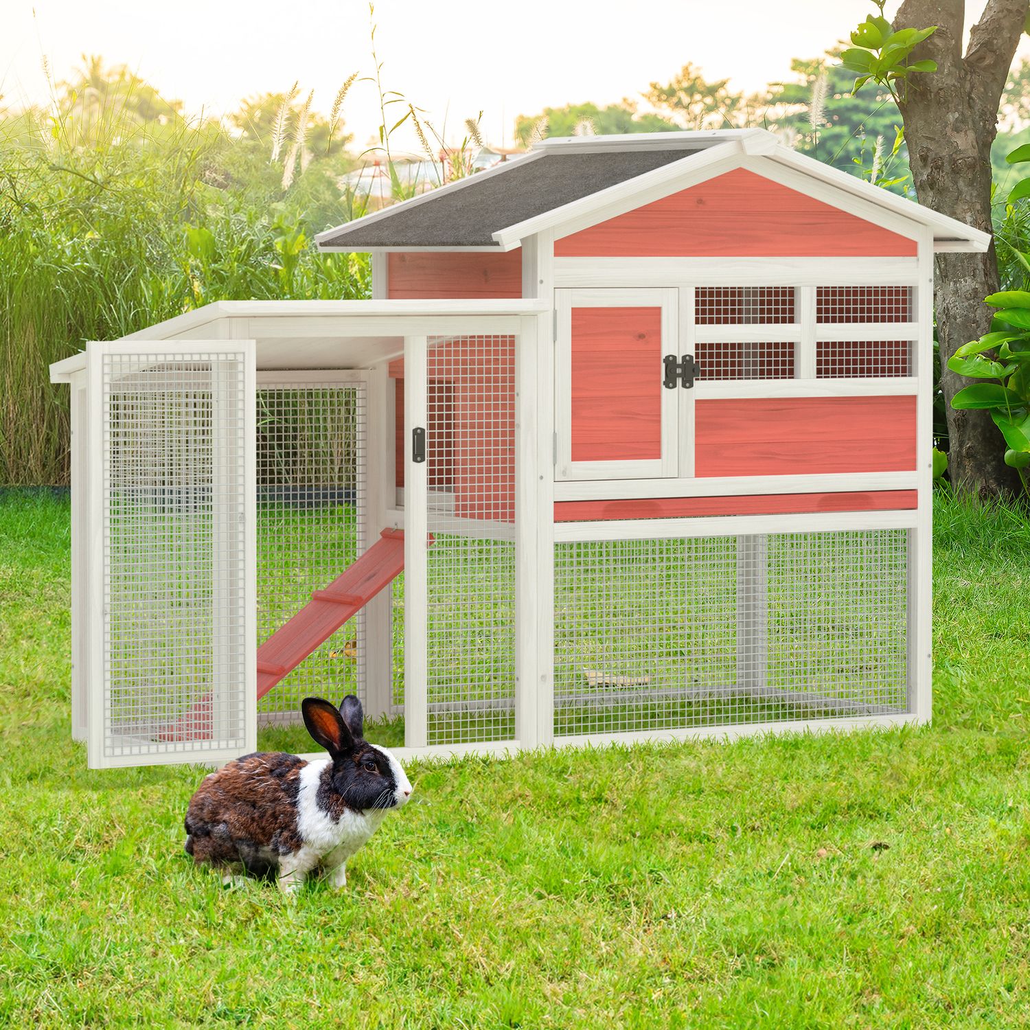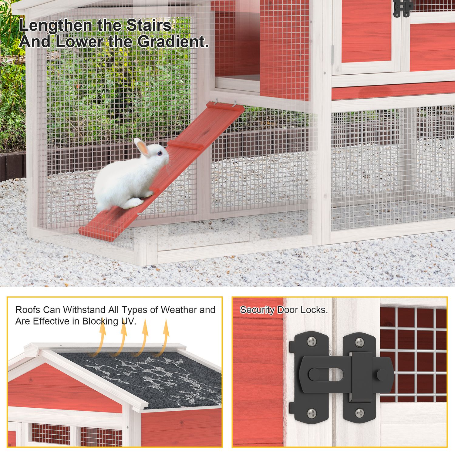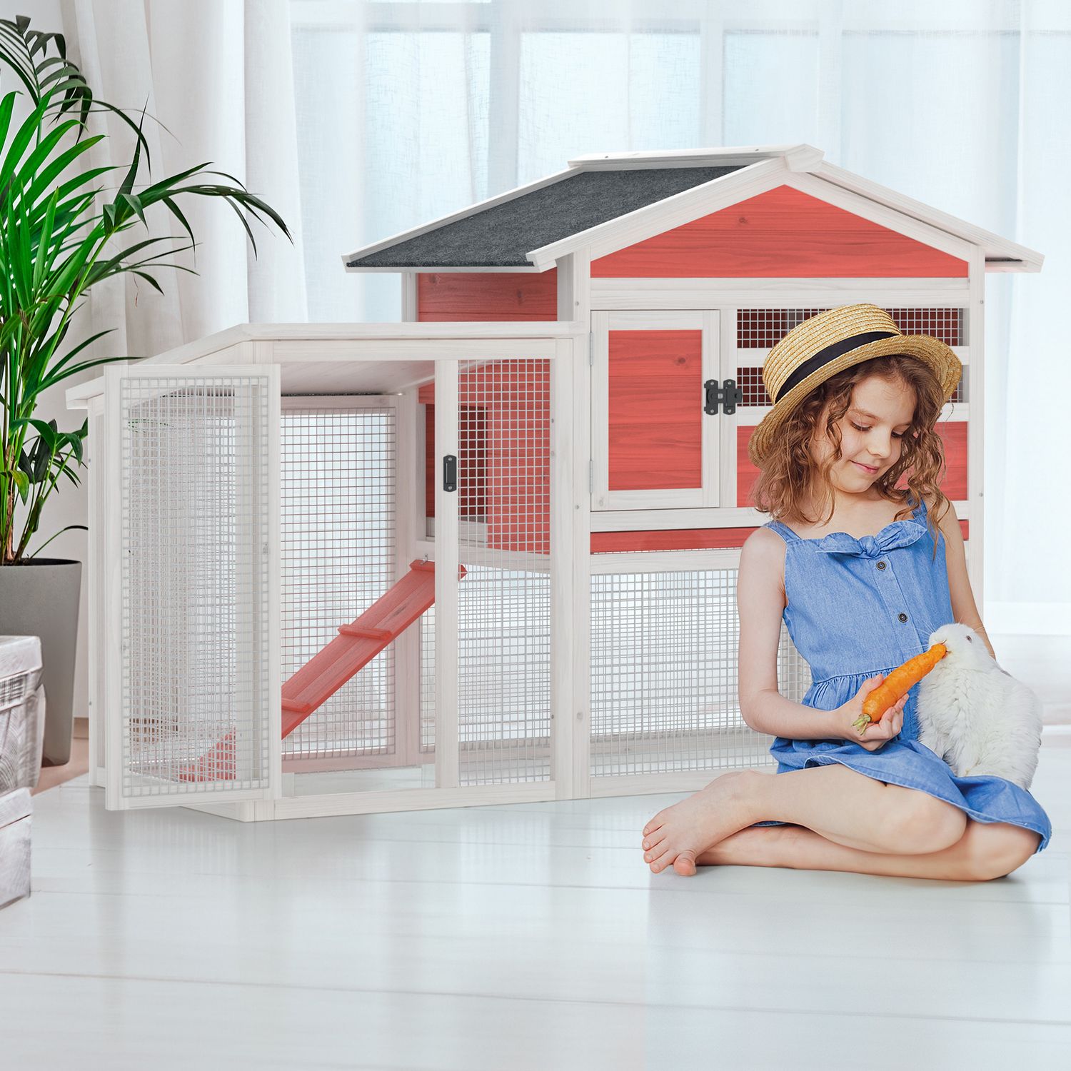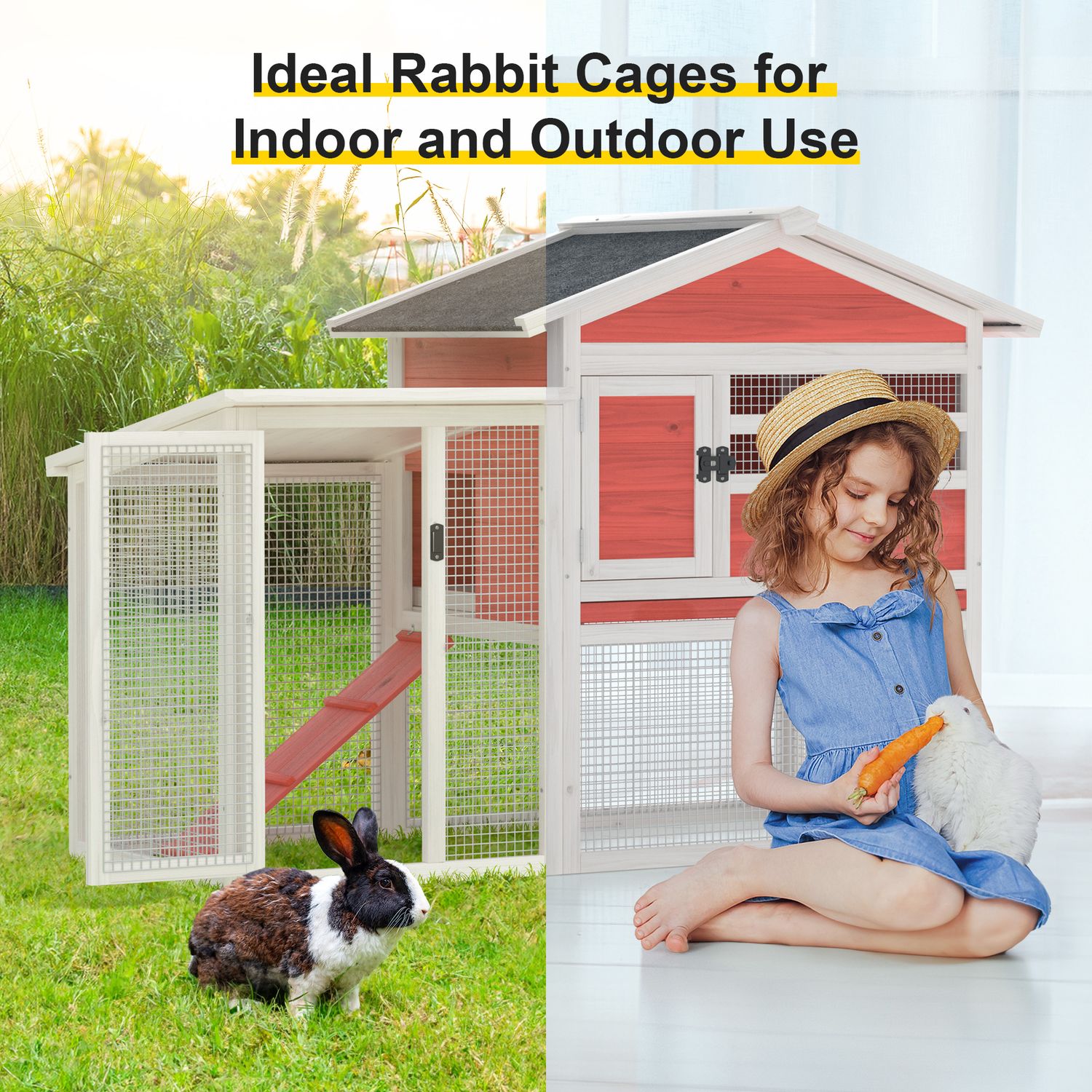Rabbit Cage Indoor & Outdoor Rabbit Hutch Weatherproof Bunny Cage Guinea Pig Cages Chicken Coop w/ Waterproof Top & Tray, Red