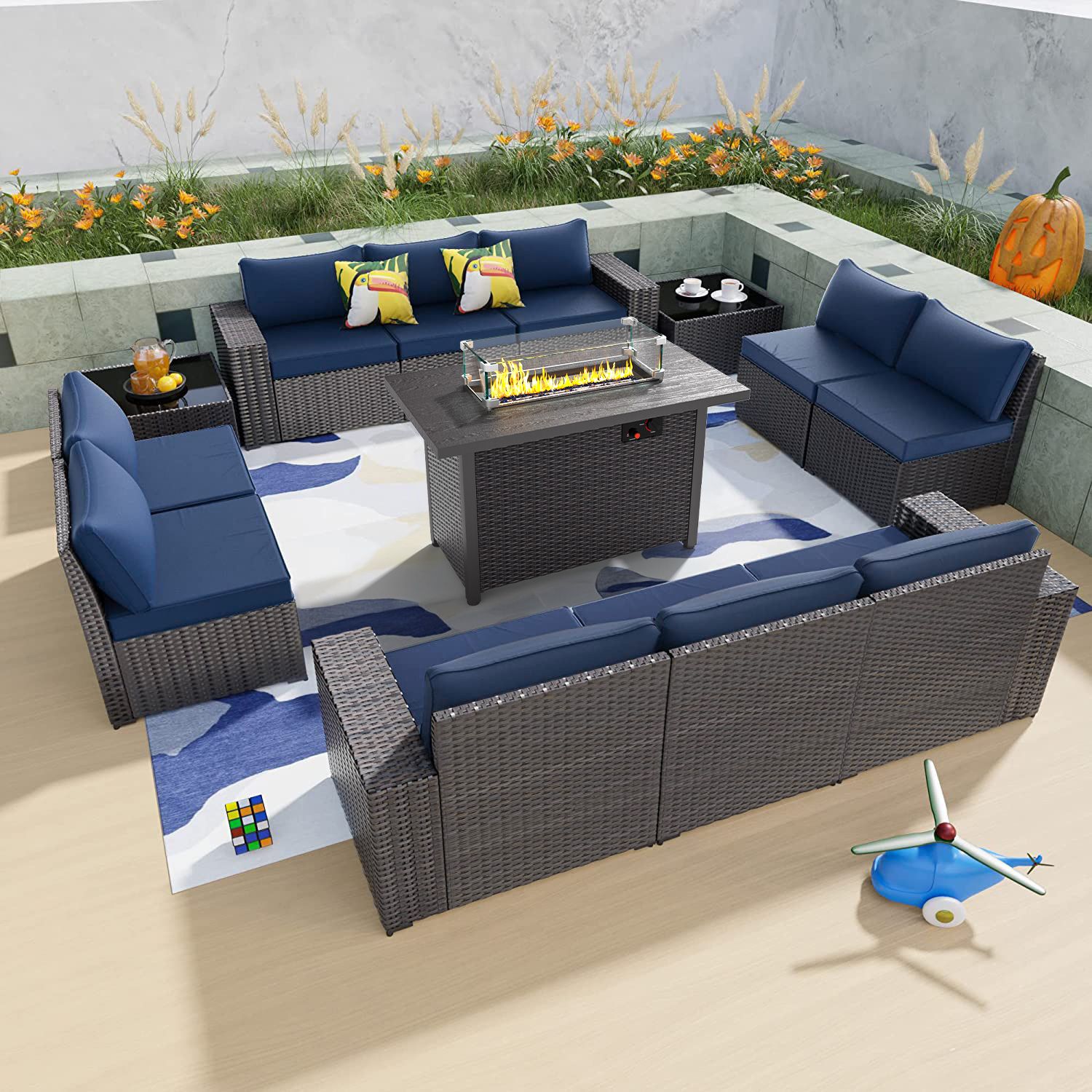 Phonjoro 13 Pieces Outdoor Patio Furniture Set with 42” Fire Pit Table, Rattan Patio Sectional Sofa Conversation Set w/ 50000 BTU Propane Fire Pit and Coffee Table for Garden, Backyard