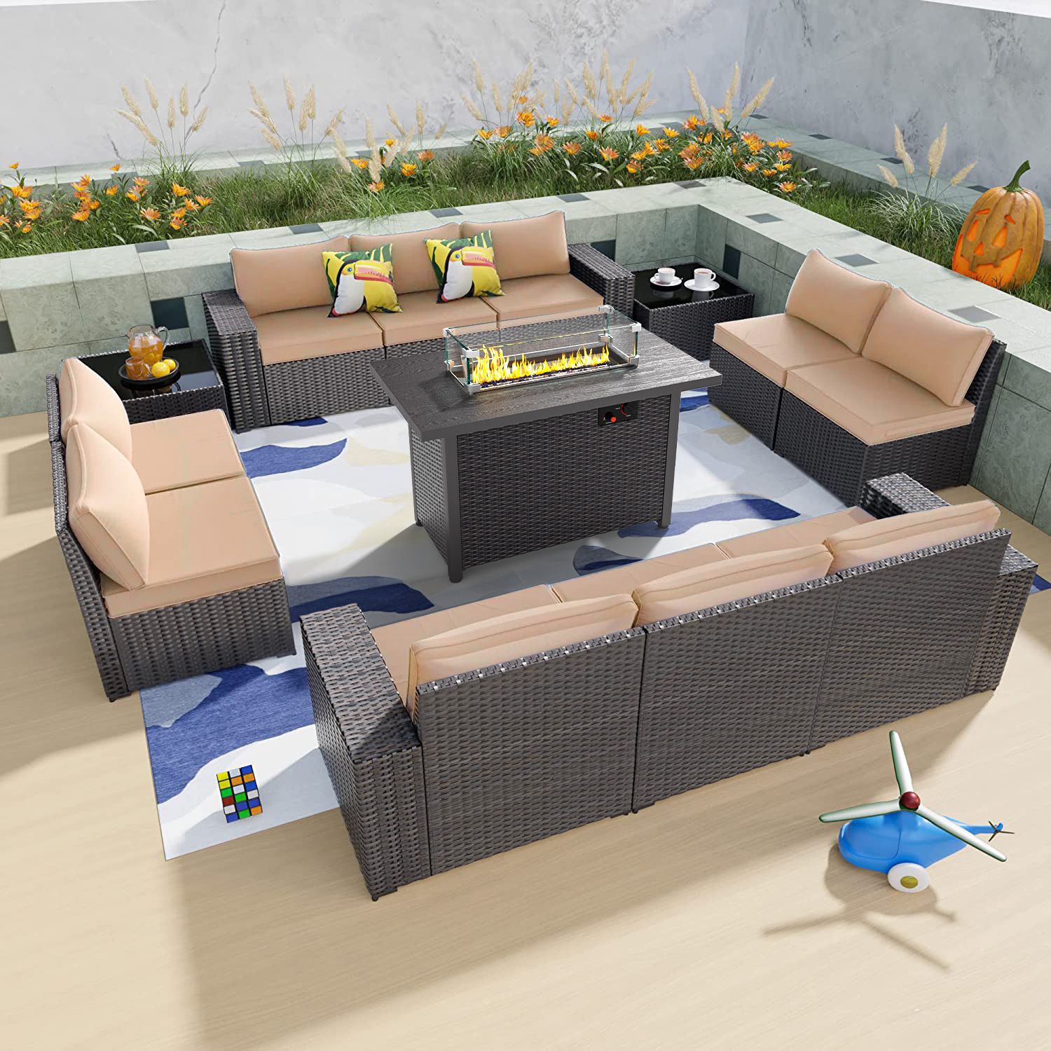 Phonjoro 13 Pieces Outdoor Patio Furniture Set with 42” Fire Pit Table, Rattan Patio Sectional Sofa Conversation Set w/ 50000 BTU Propane Fire Pit and Coffee Table for Garden, Backyard