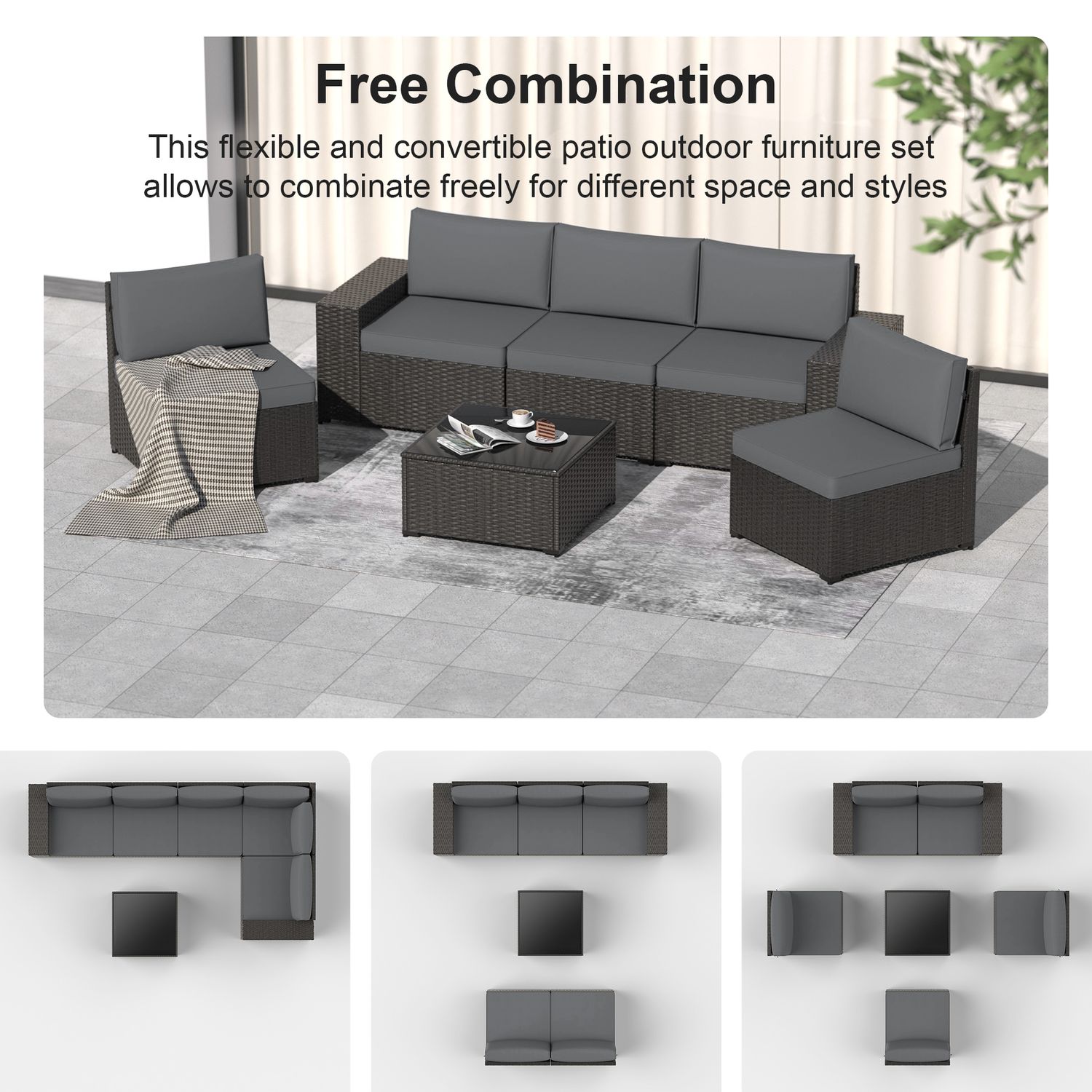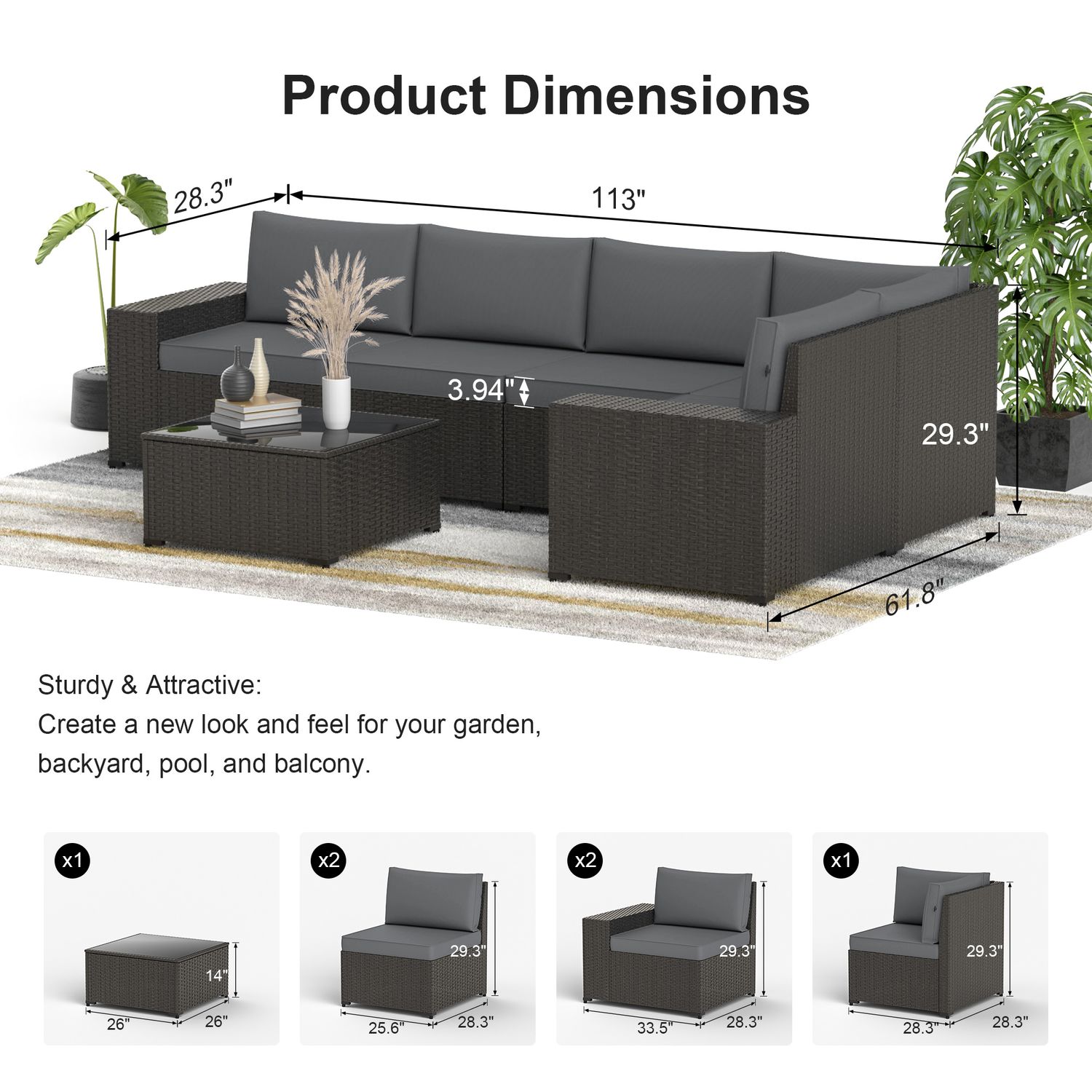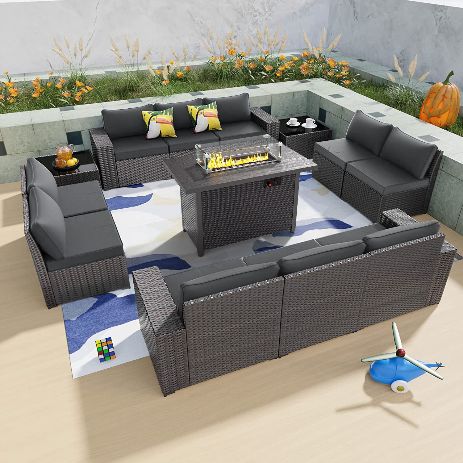 Phonjoro 13 Pieces Outdoor Patio Furniture Set with 42” Fire Pit Table, Rattan Patio Sectional Sofa Conversation Set w/ 50000 BTU Propane Fire Pit and Coffee Table for Garden, Backyard