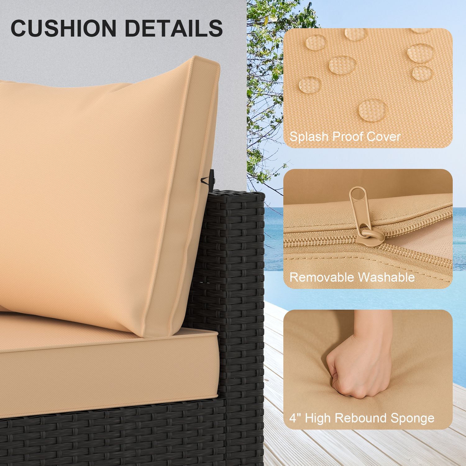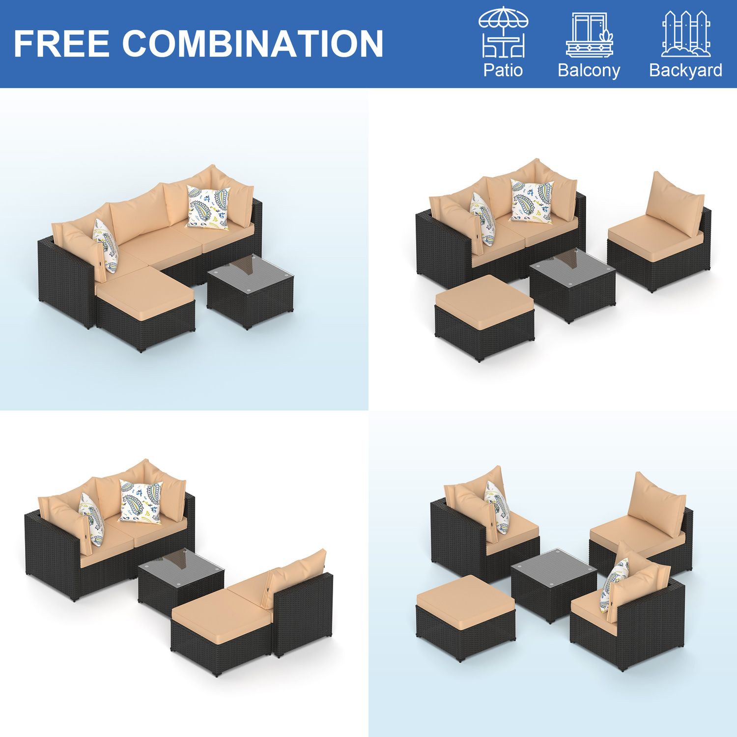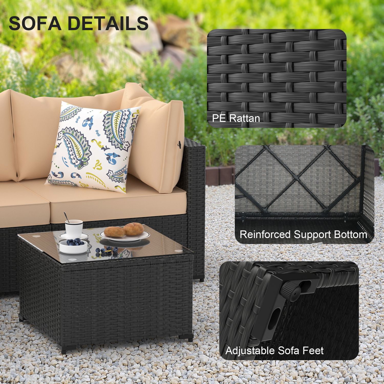 Phonjoroo 5pcs Patio Furniture Sets All Weather Outdoor Sectional Sofa Manual Weaving Wicker Rattan Outdoor Conversation Set with With Cushion And Glass Table, Khaki