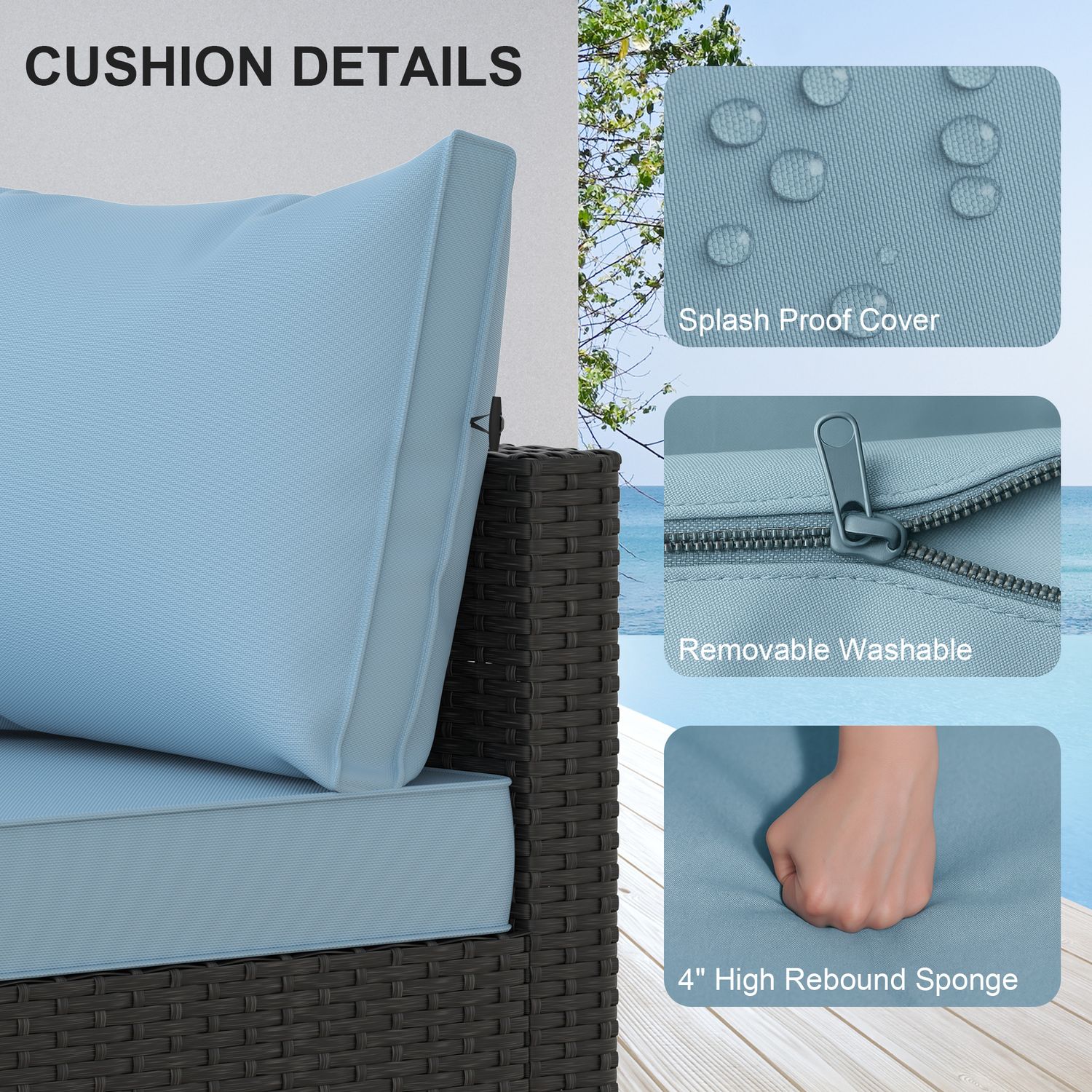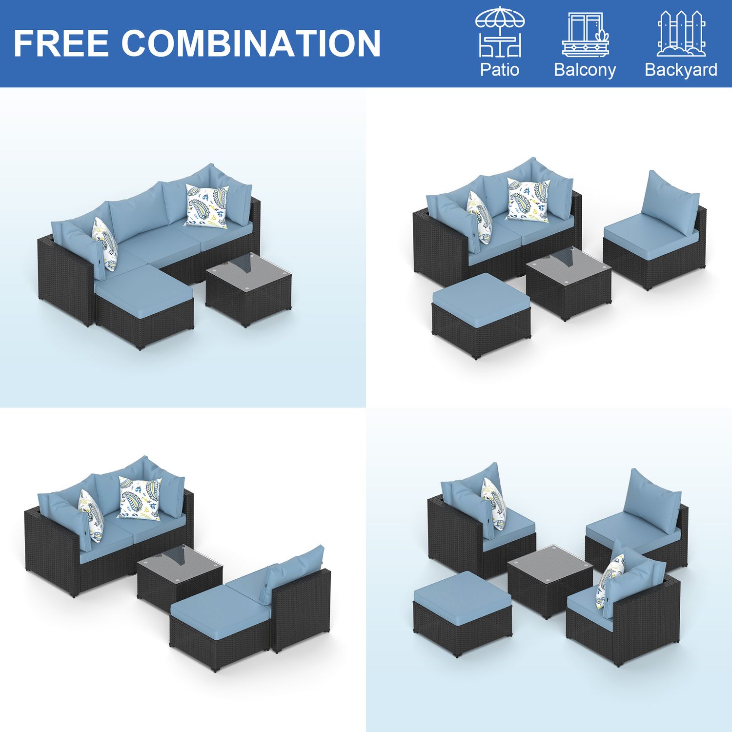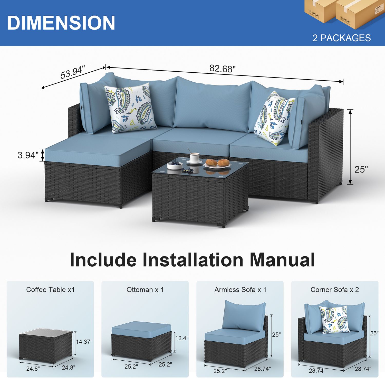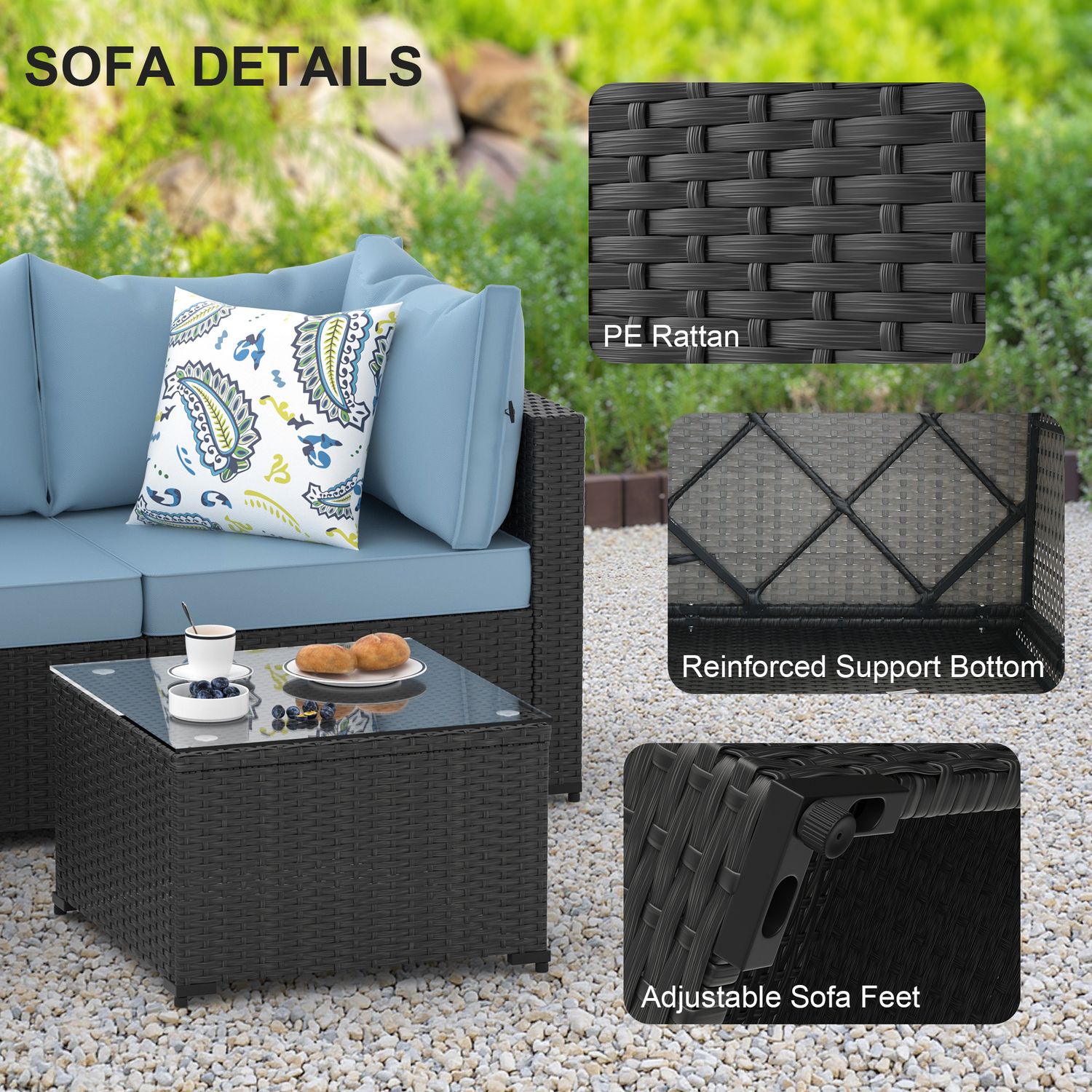 Phonjoroo 5pcs Patio Furniture Sets All Weather Outdoor Sectional Sofa Manual Weaving Wicker Rattan Outdoor Conversation Set with With Cushion And Glass Table, Light Blue
