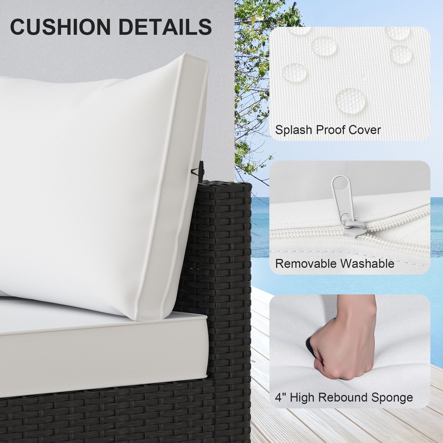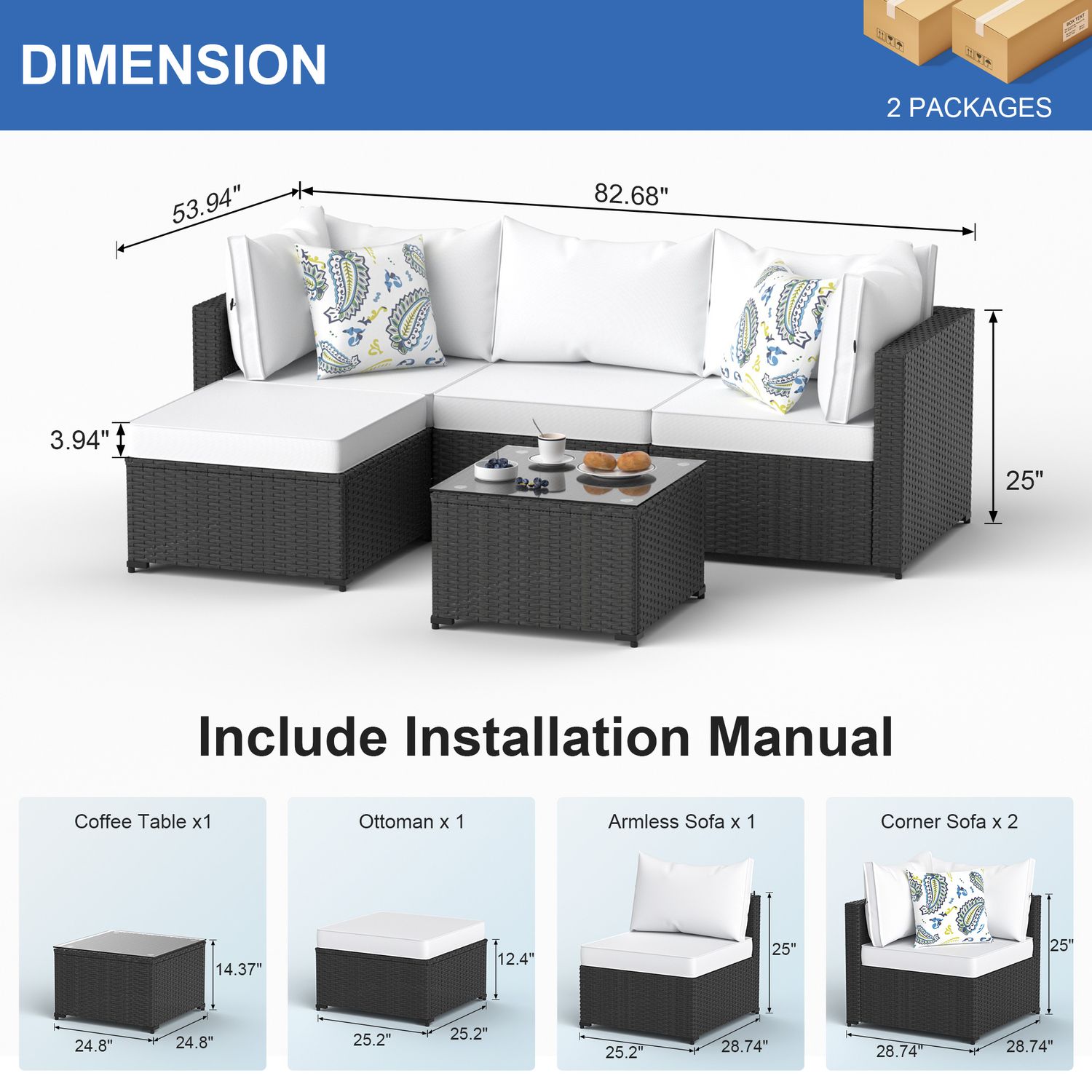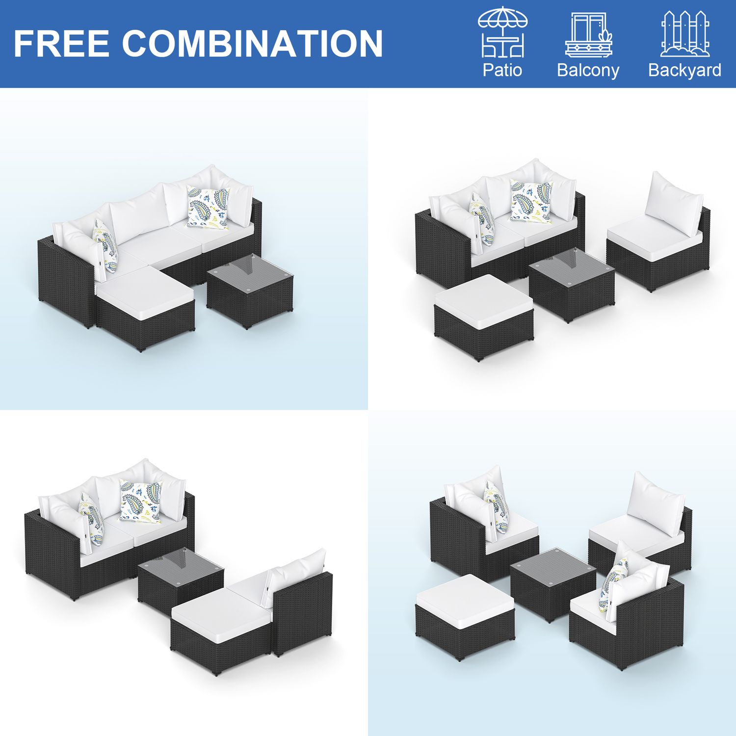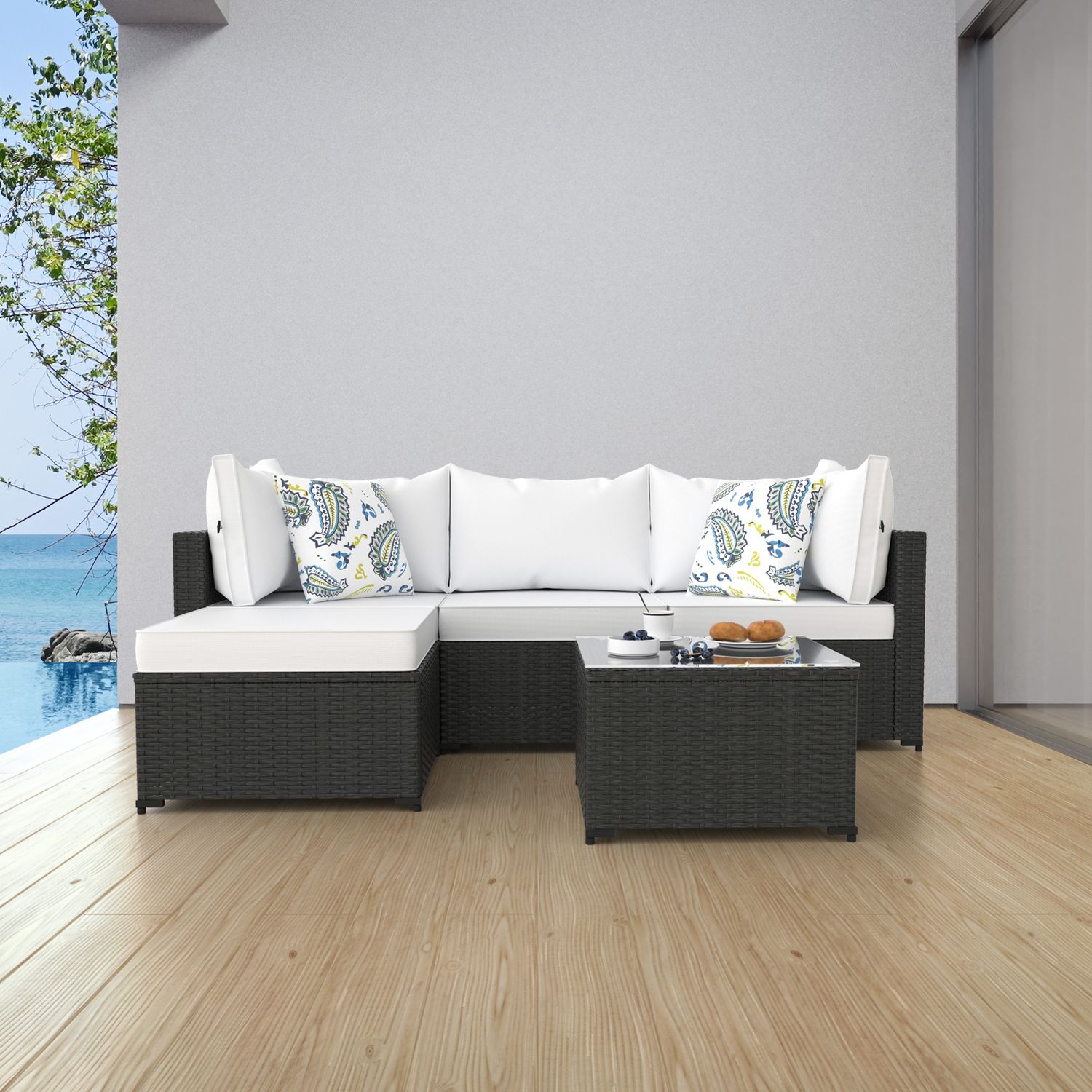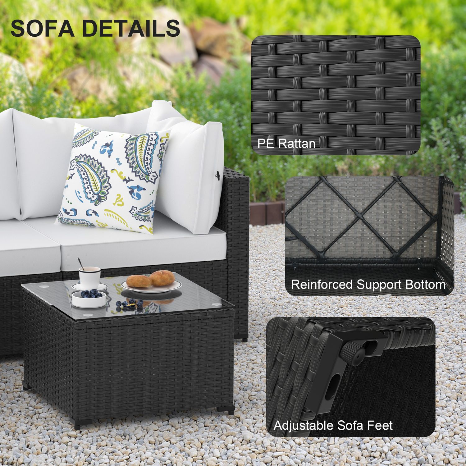 Phonjoroo 5pcs Patio Furniture Sets All Weather Outdoor Sectional Sofa Manual Weaving Wicker Rattan Outdoor Conversation Set with With Cushion And Glass Table, White