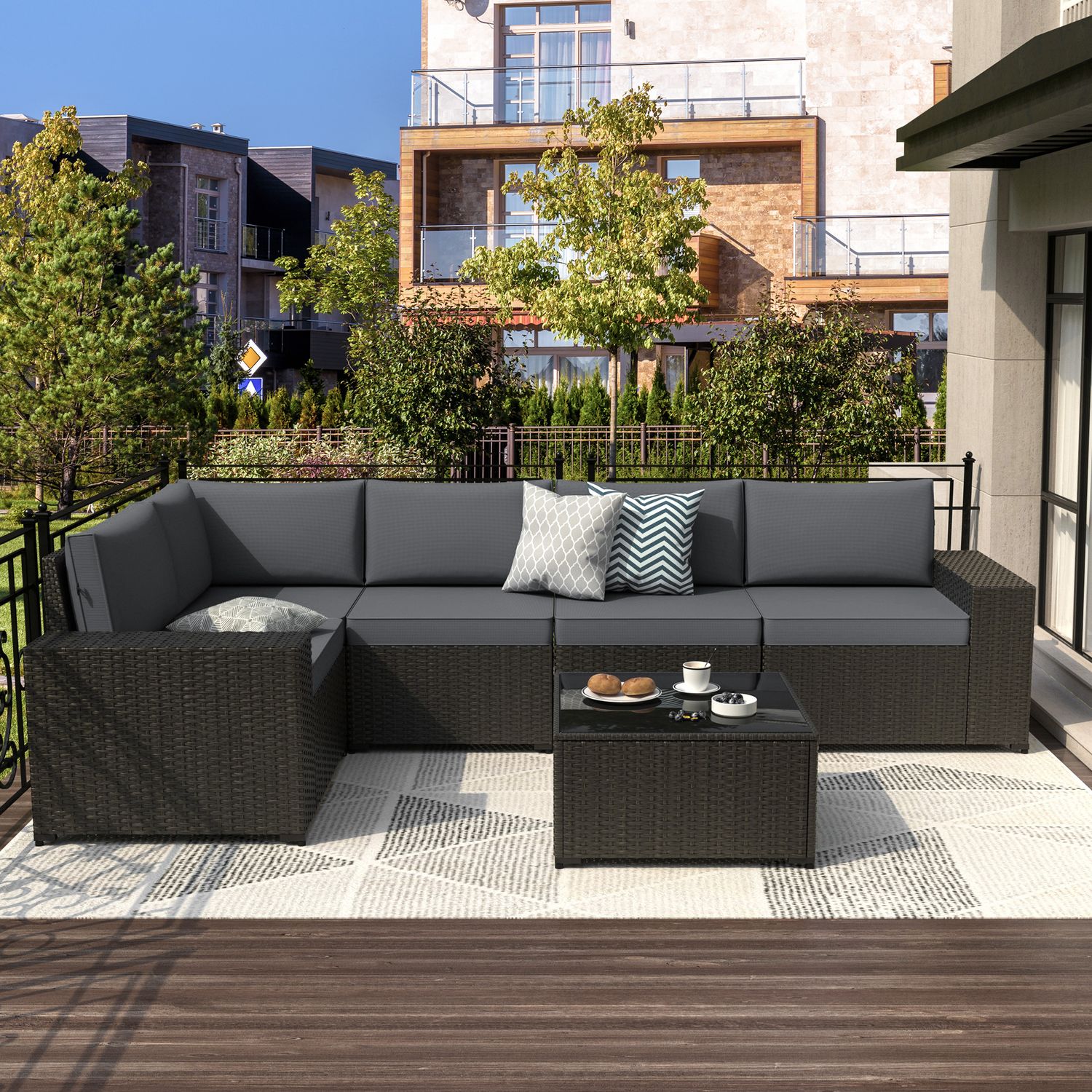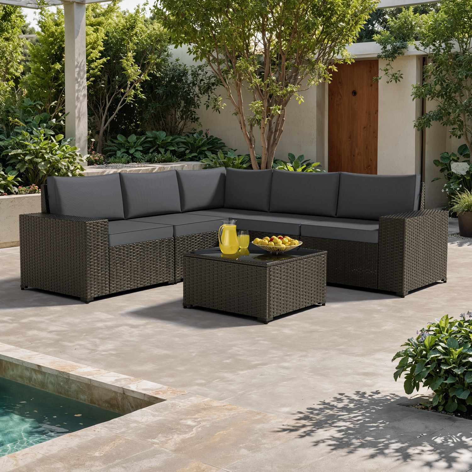 Phonjoroo 6 Pieces Patio Furniture Set Outdoor Wicker Sectional Conversation Sofa All-Weather Rattan Couch Patio Seating with Cushion and Glass Table