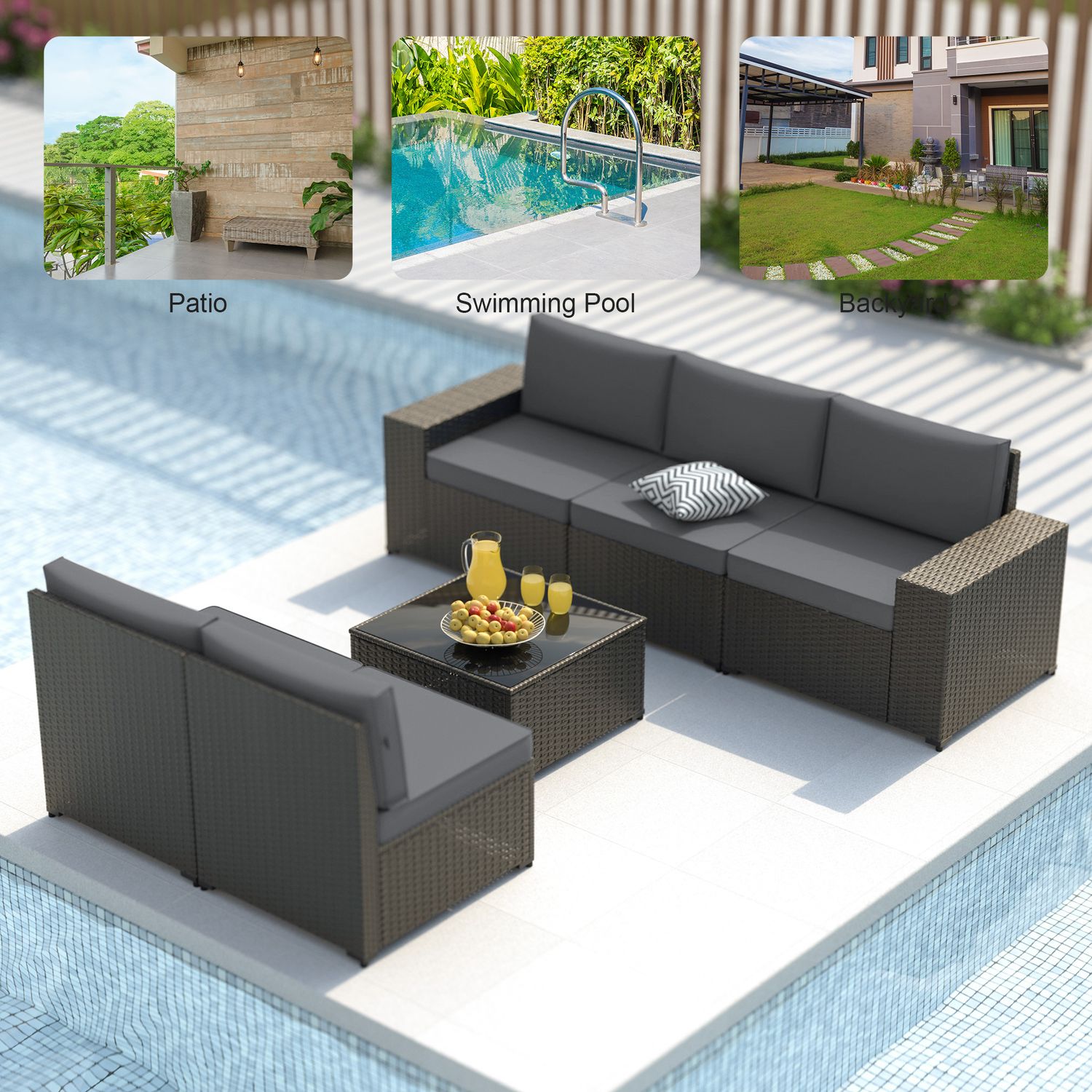 Phonjoroo 6 Pieces Patio Furniture Set Outdoor Wicker Sectional Conversation Sofa All-Weather Rattan Couch Patio Seating with Cushion and Glass Table for Porch, Poolside, Backyard, Balcony