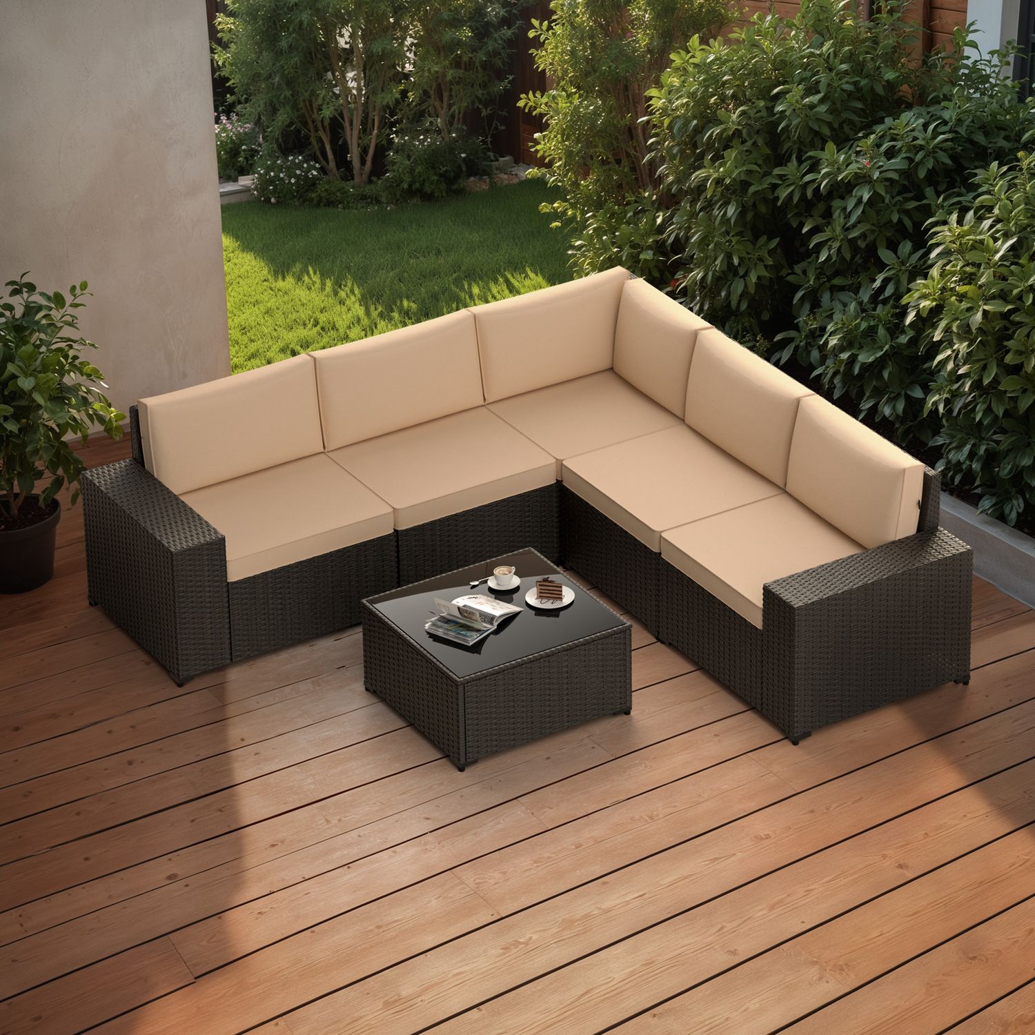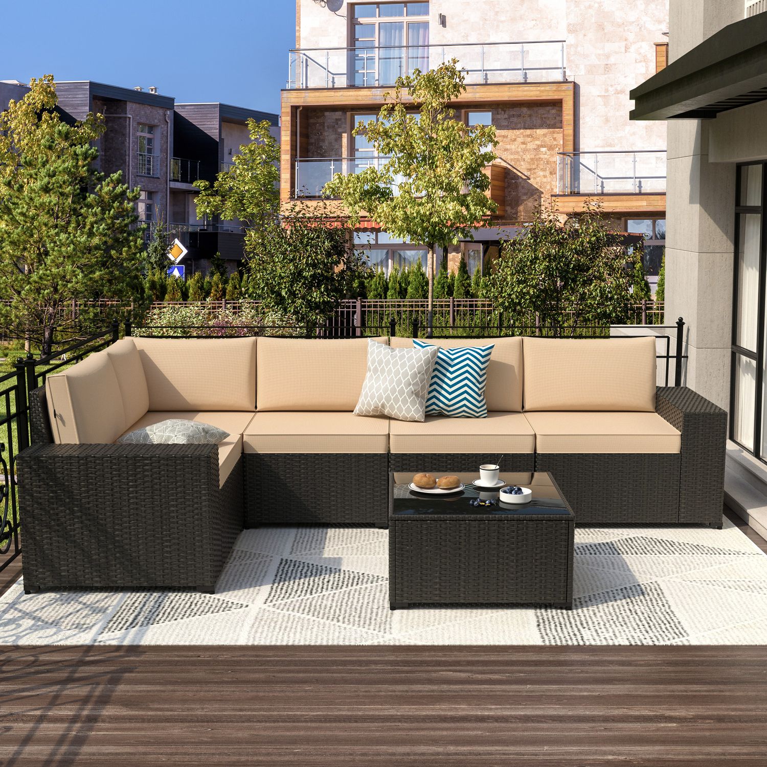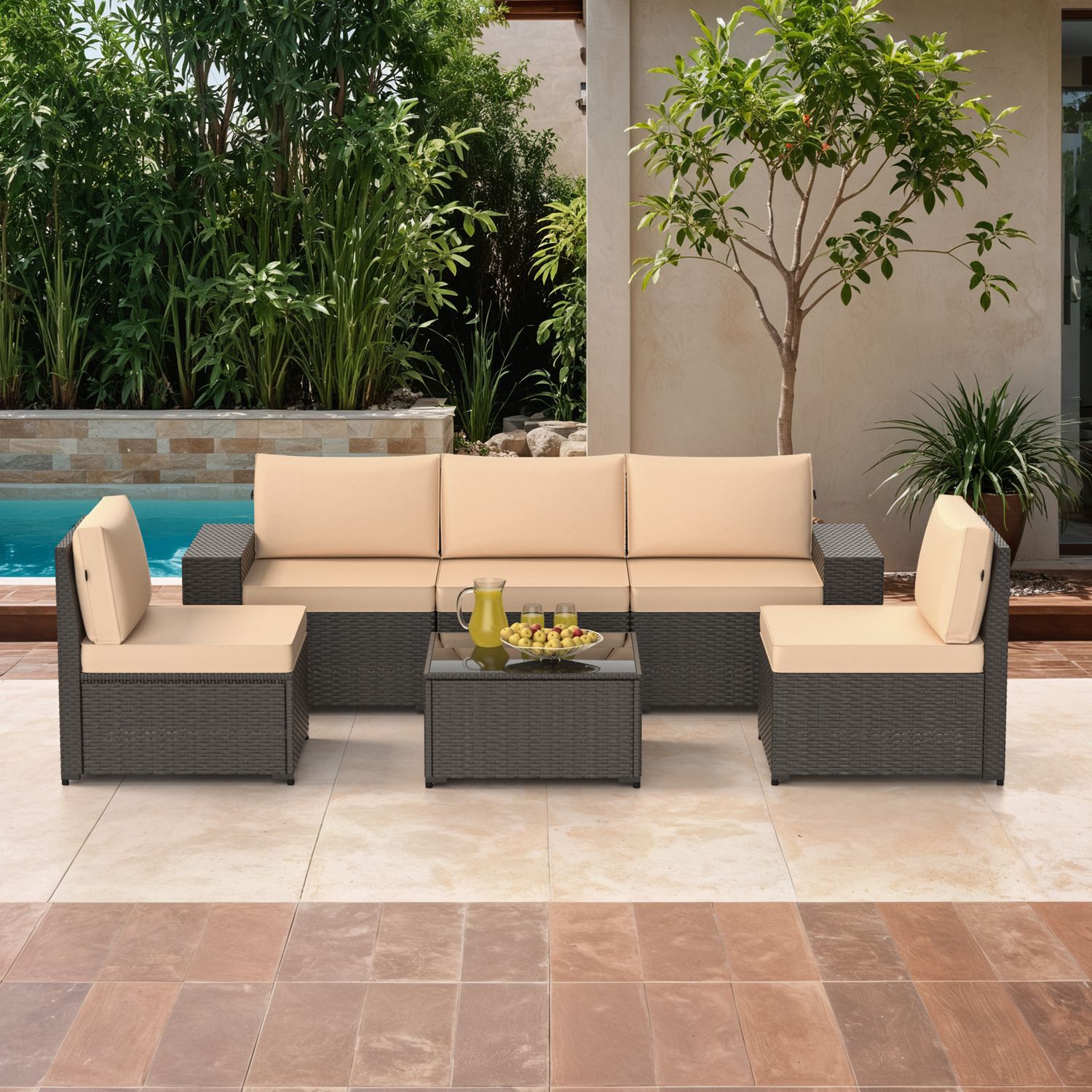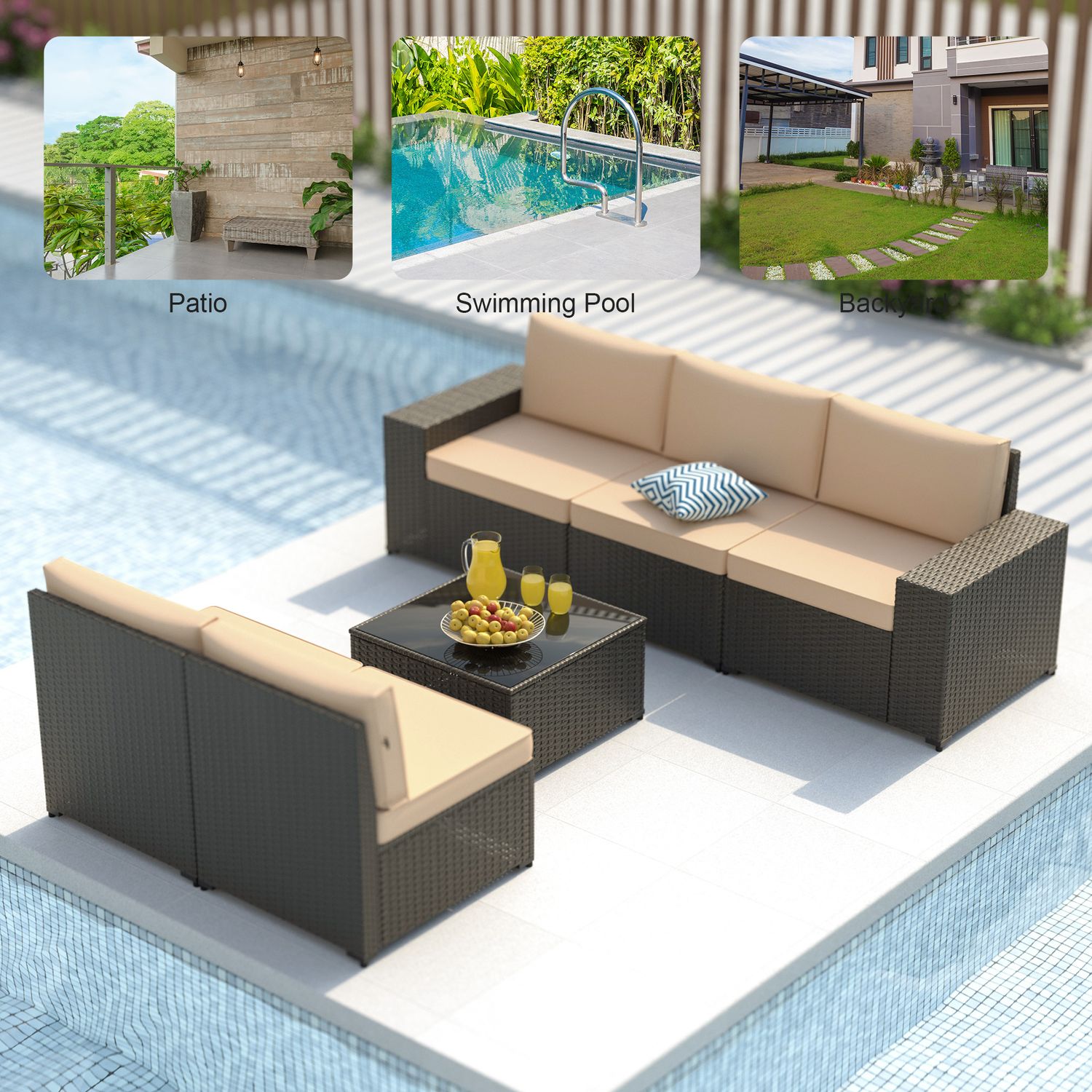 Phonjoroo 6 Pieces Patio Furniture Set Outdoor Wicker Sectional Conversation Sofa All-Weather Rattan Couch Patio Seating with Cushion and Glass Table