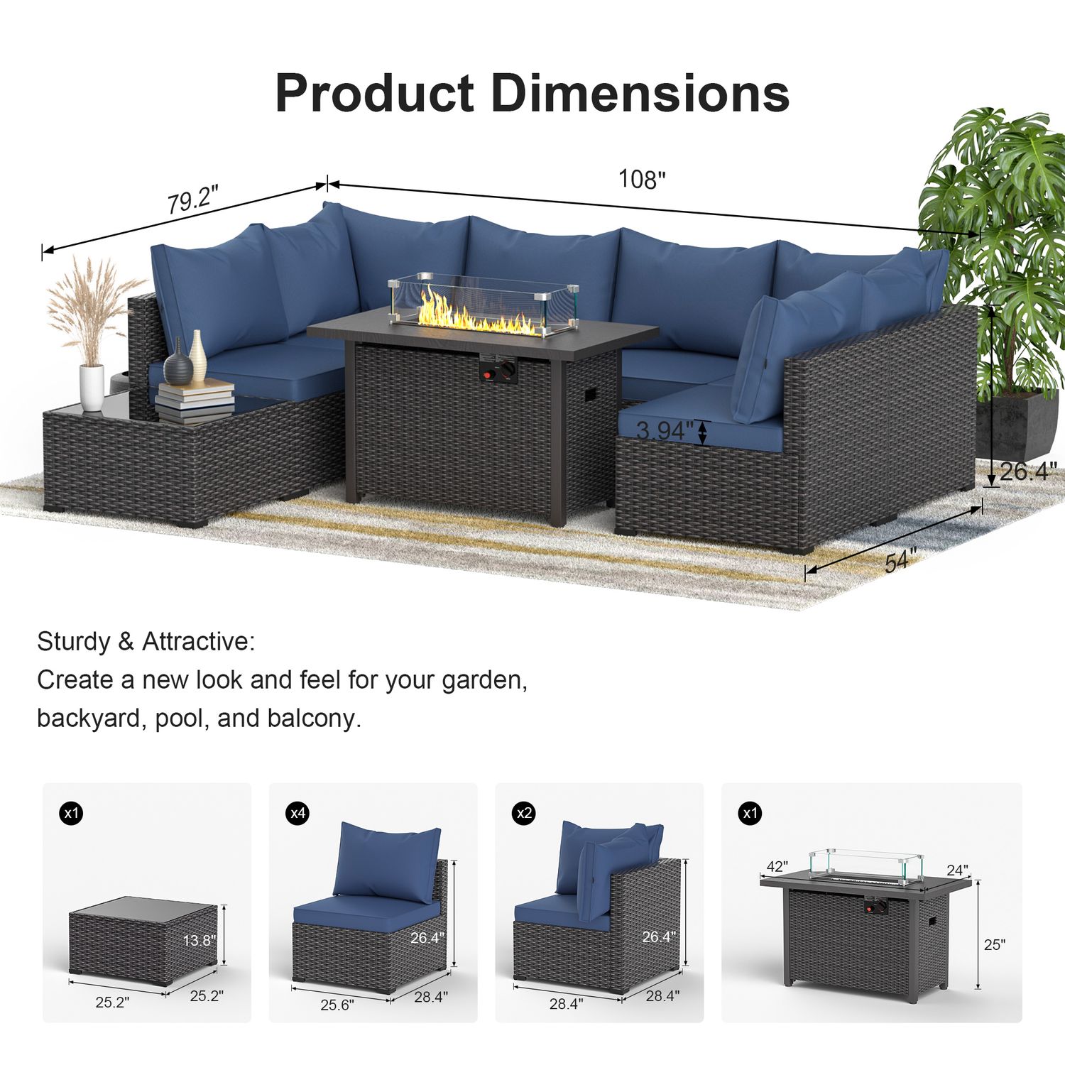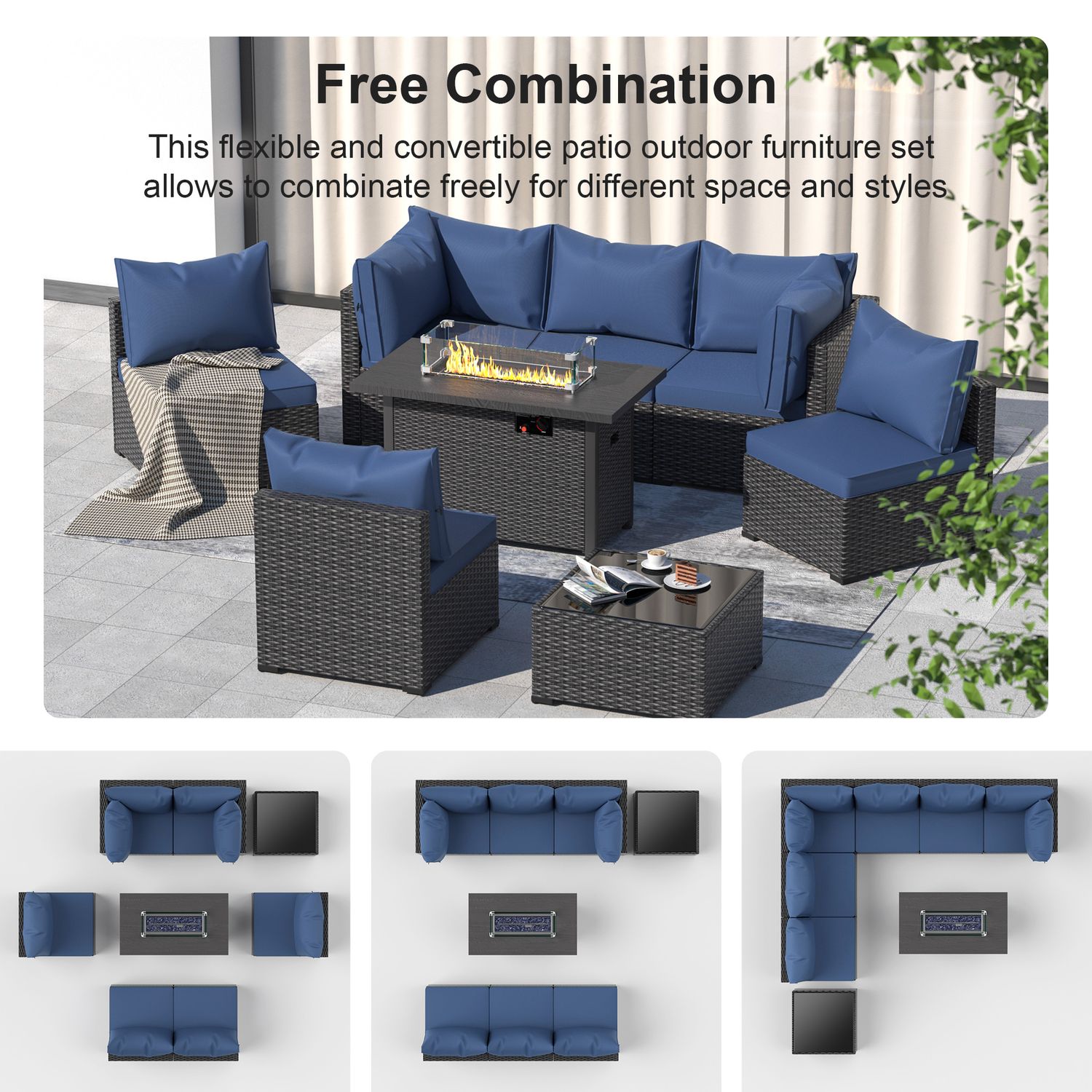 Phonjoroo 8-Piece Outdoor Patio Furniture Set Outdoor Sectional Wicker Rattan Conversation Set with 42" Propane Fire Pit Table Suitable for Garden, Patio, Blue