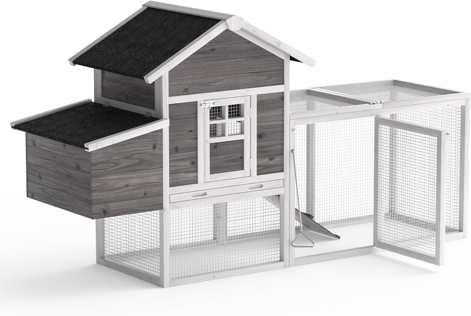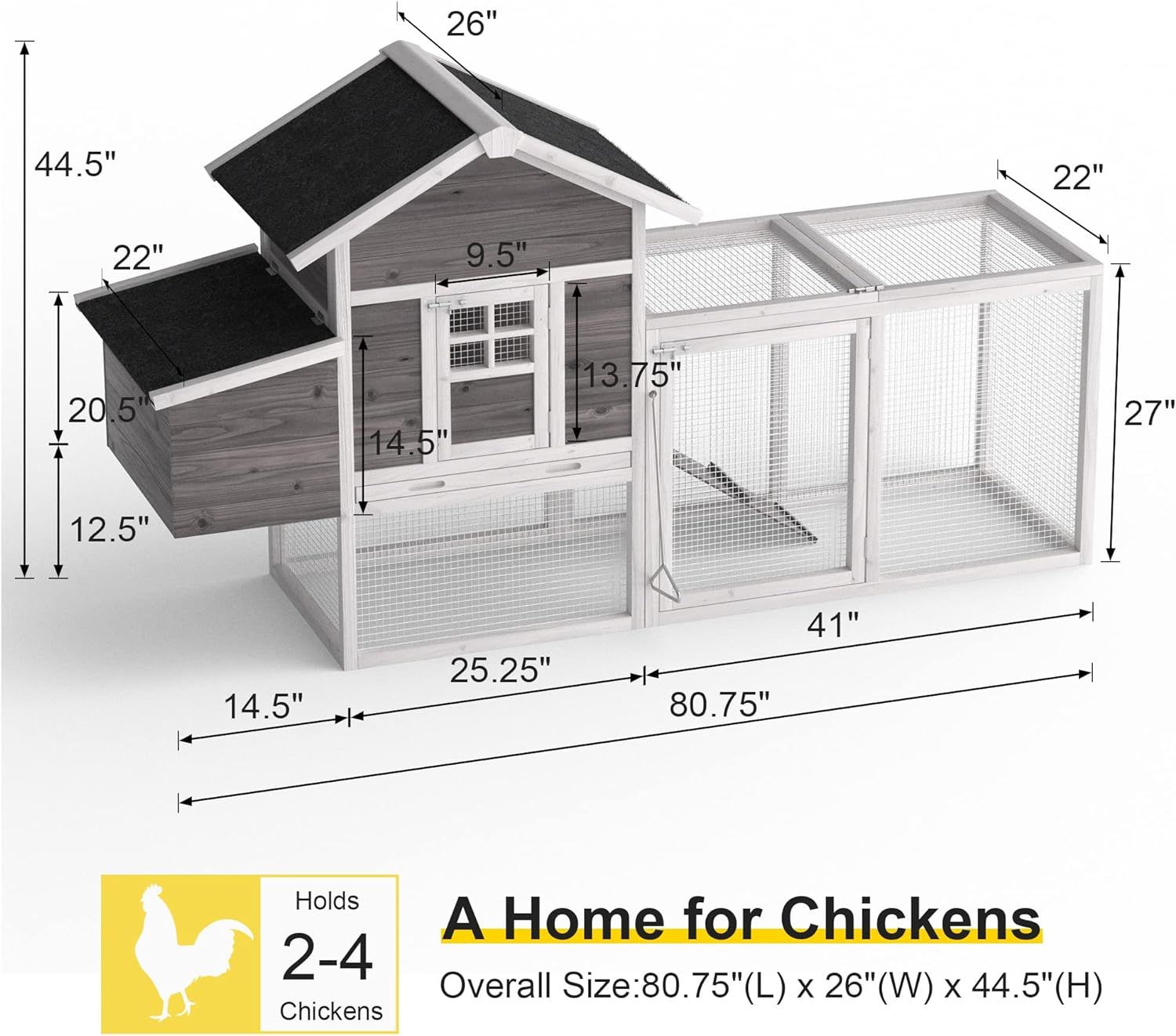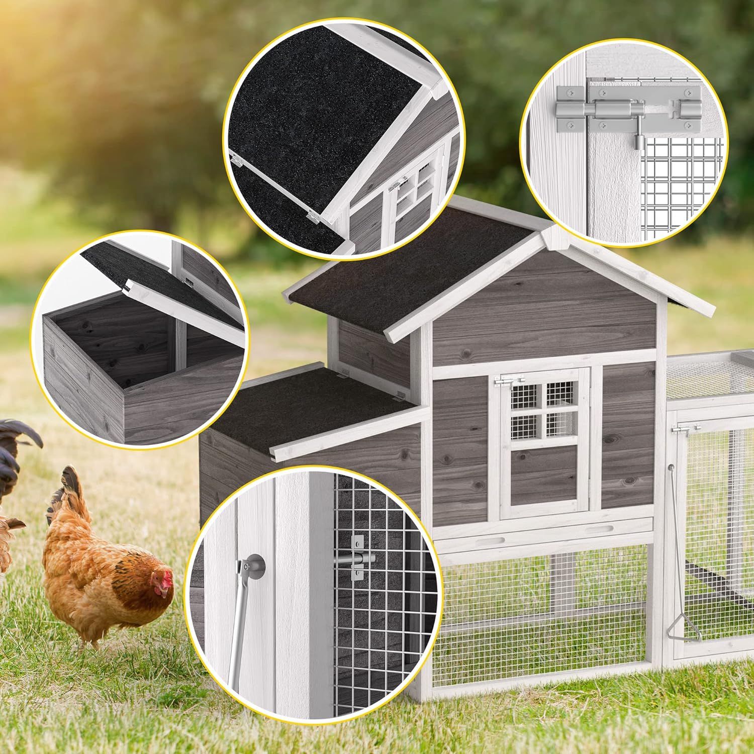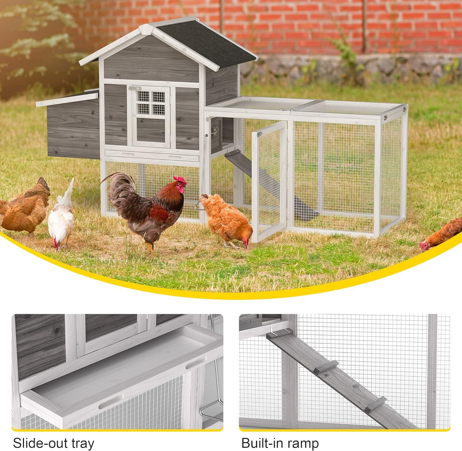 Phonjoroo Chicken Coop for 2-4 Chickens Outdoor Grey Wooden Hen House Poultry Cage w/Wire Fence, Ramp, Nesting Box, Tray, Roosting Bar, 4 Access Areas