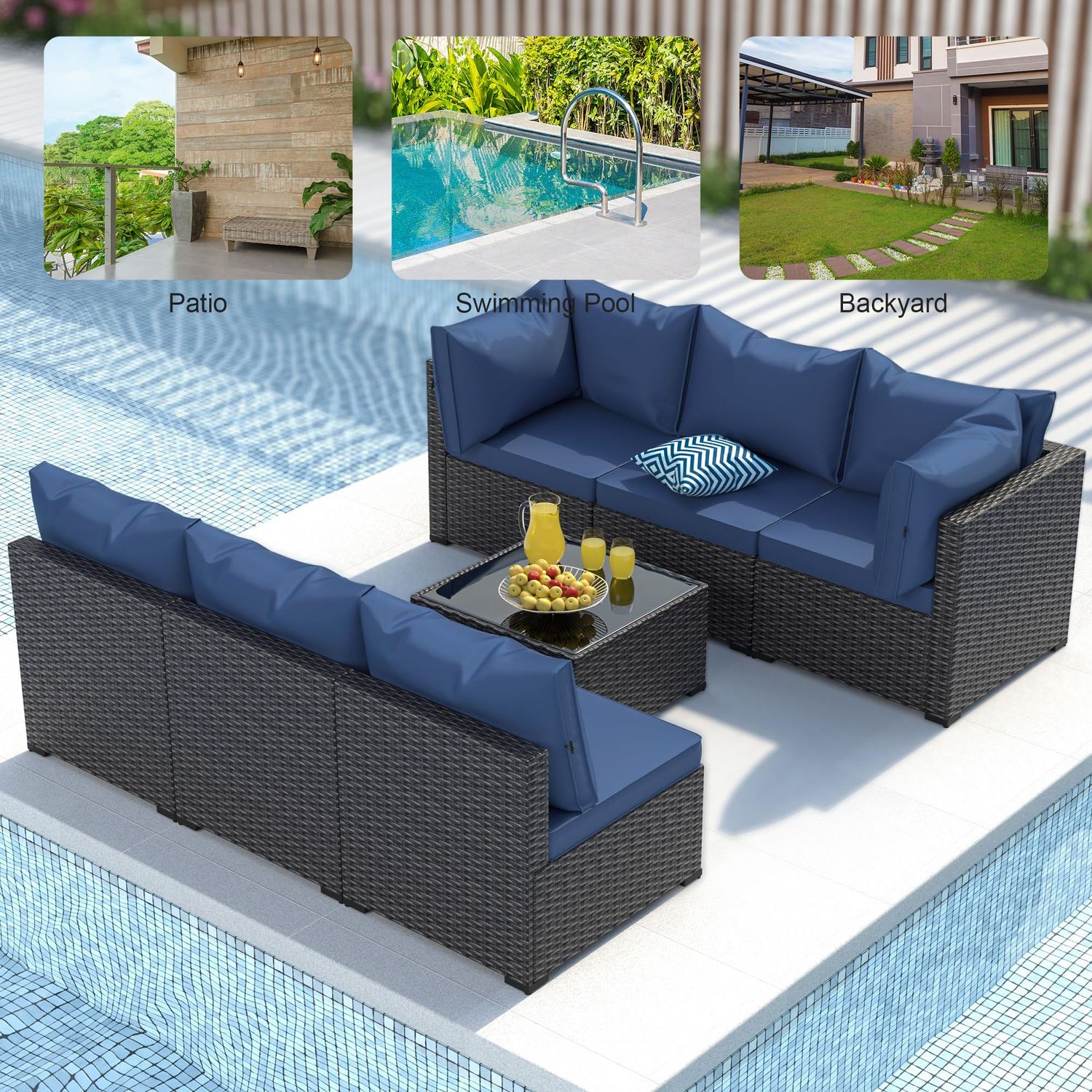 Phonjoroo Patio Furniture Set 7 Pieces Outdoor Patio Furniture Wicker Sectional Furniture Sofa Conversation Sets with Cushions All Weather Outside Patio Seating (Blue)