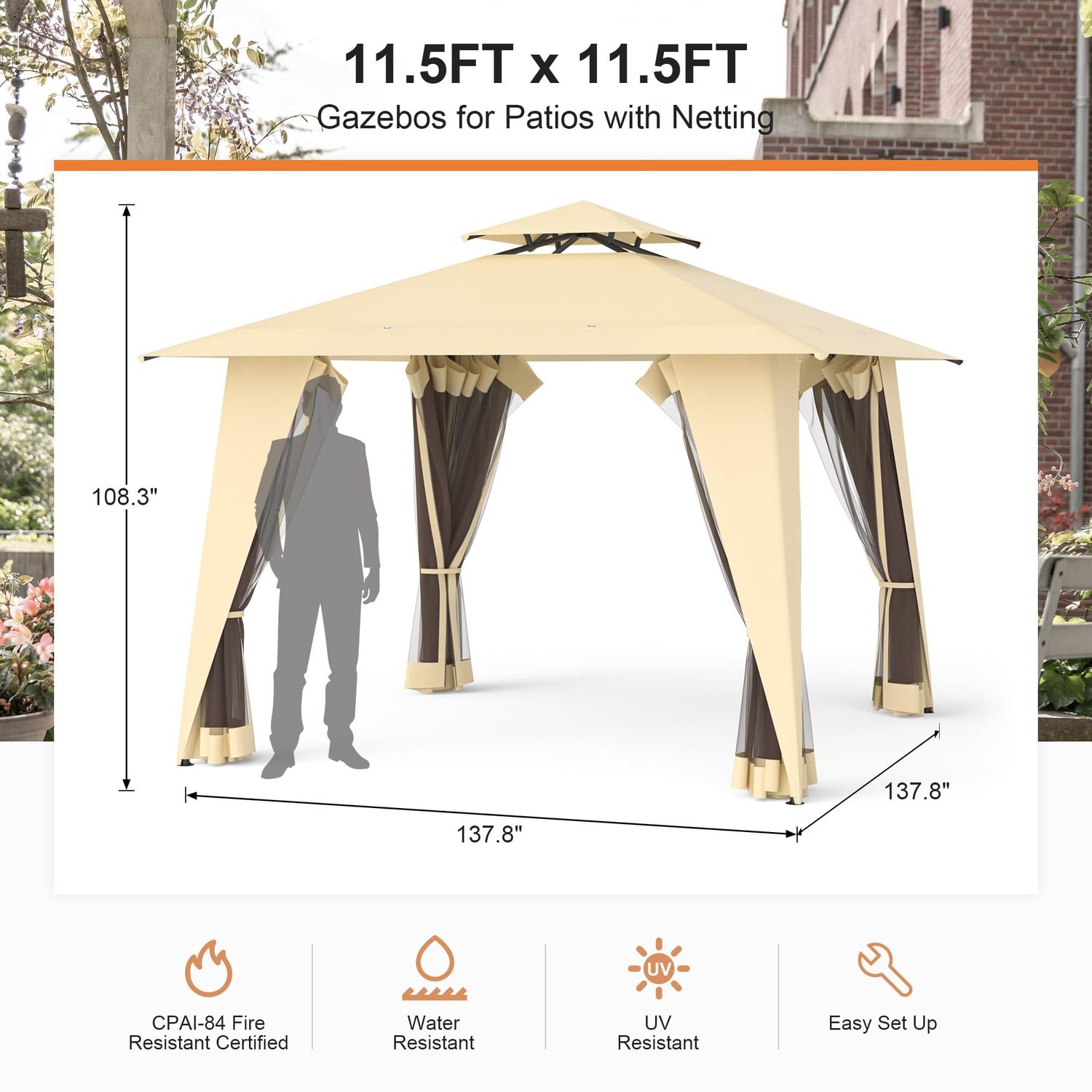 Phonjoroo Patio Gazebo Tent Outdoor Canopy Shelter 12'x12' w/Mosquito Netting with 144 Square Feet of Shade for Garden, Backyard Deck and Lawns