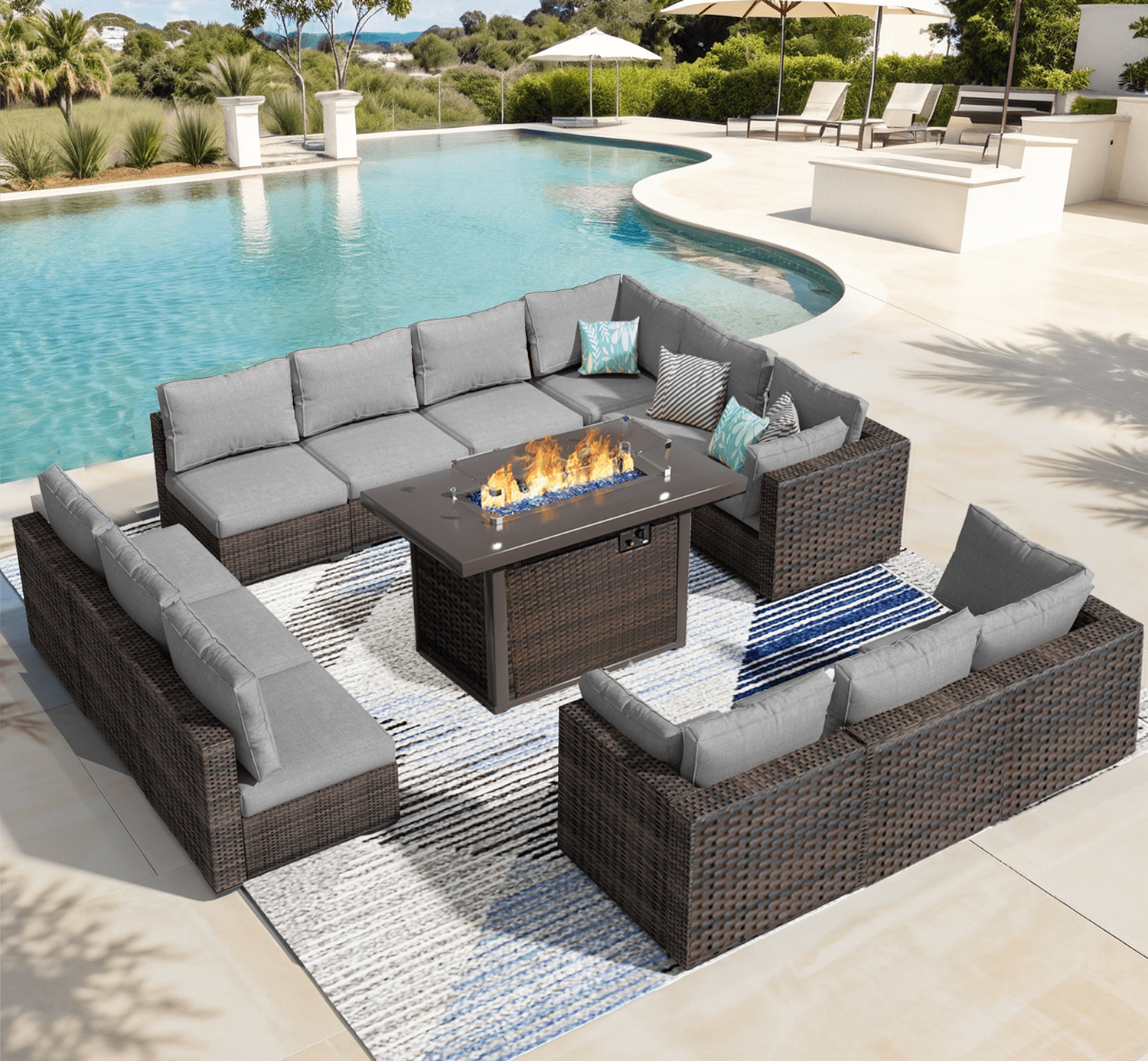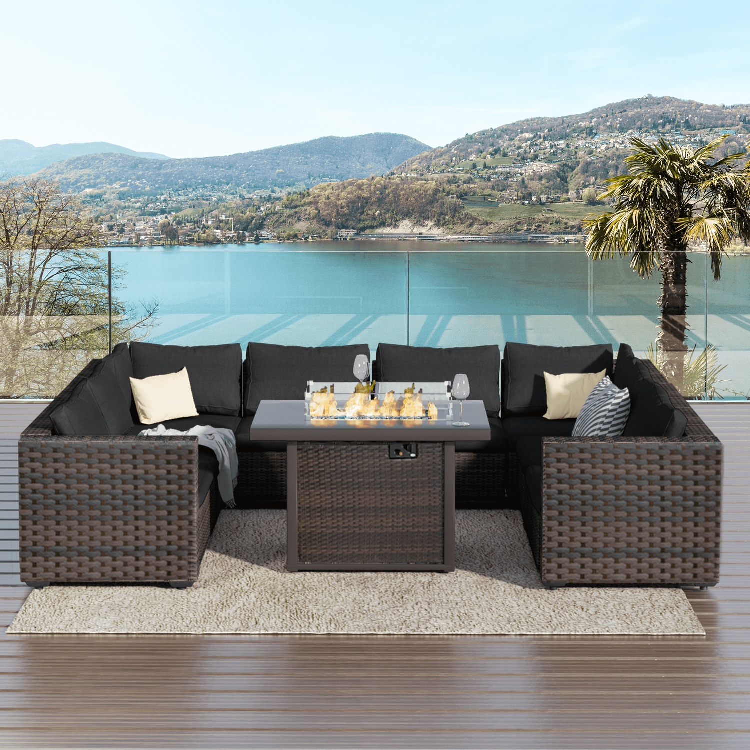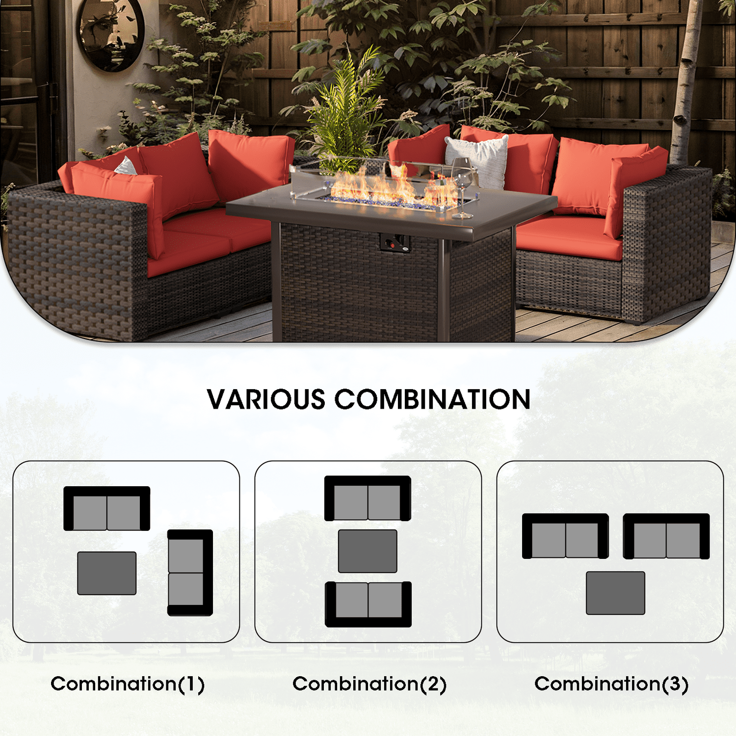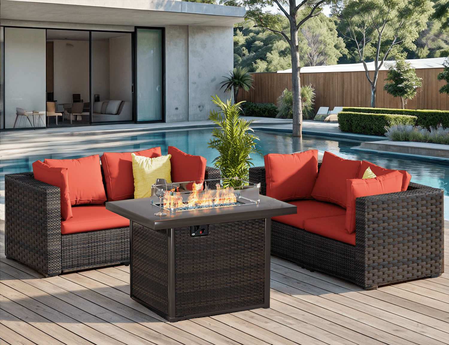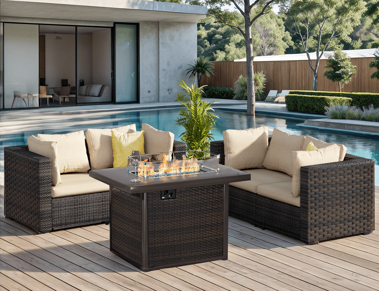 TANGJEAMER 5 Piece Patio Furniture Set with Fire Pit Table, All Weather Outdoor Sectional PE Rattan, Patio Conversation Sets with Cushions and Glass C
