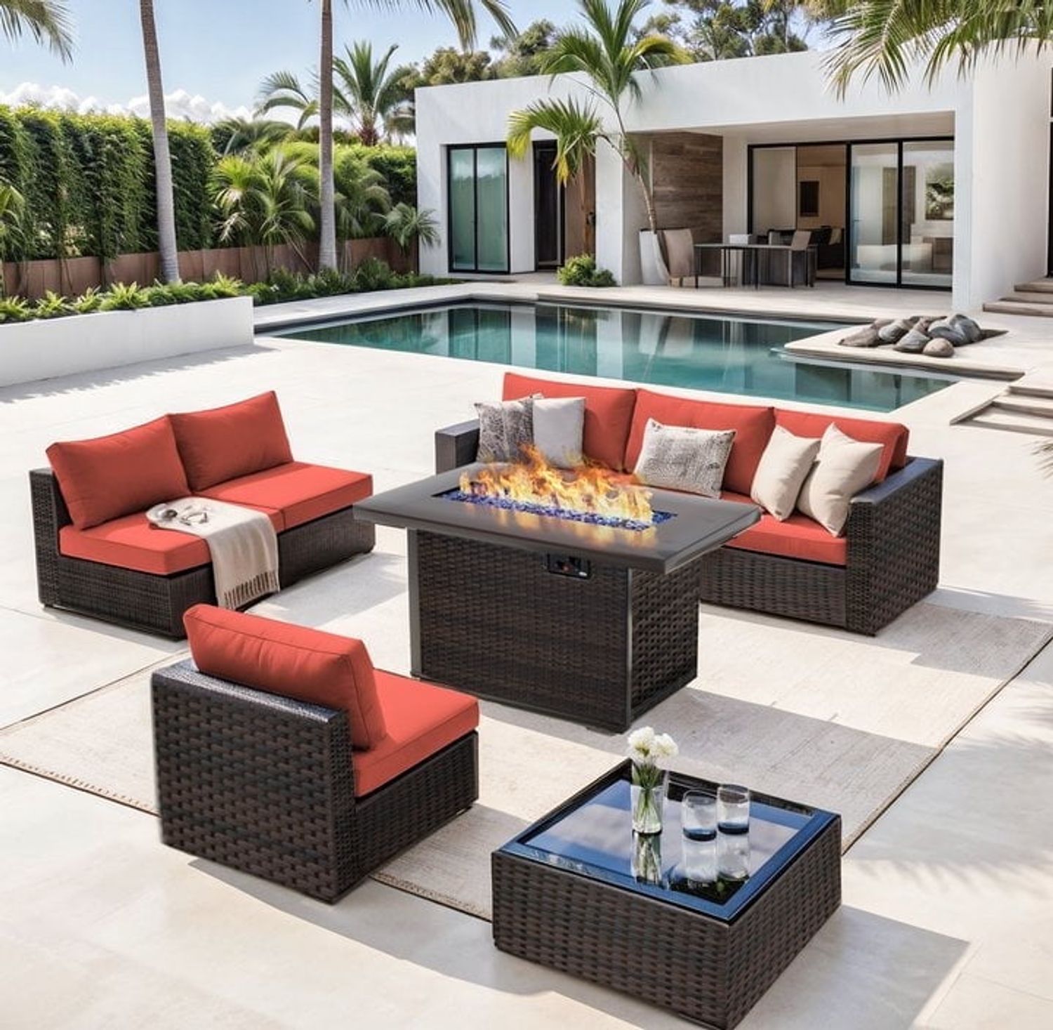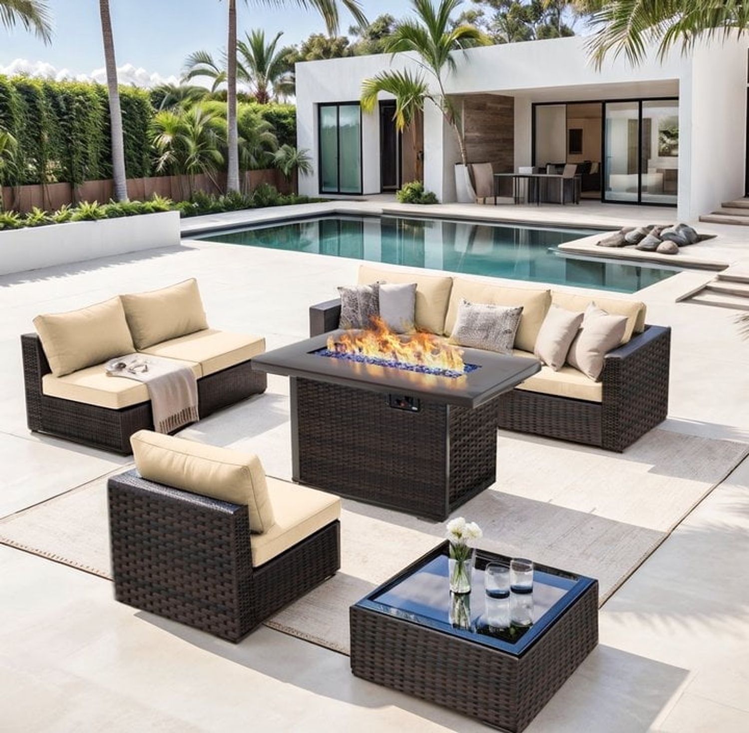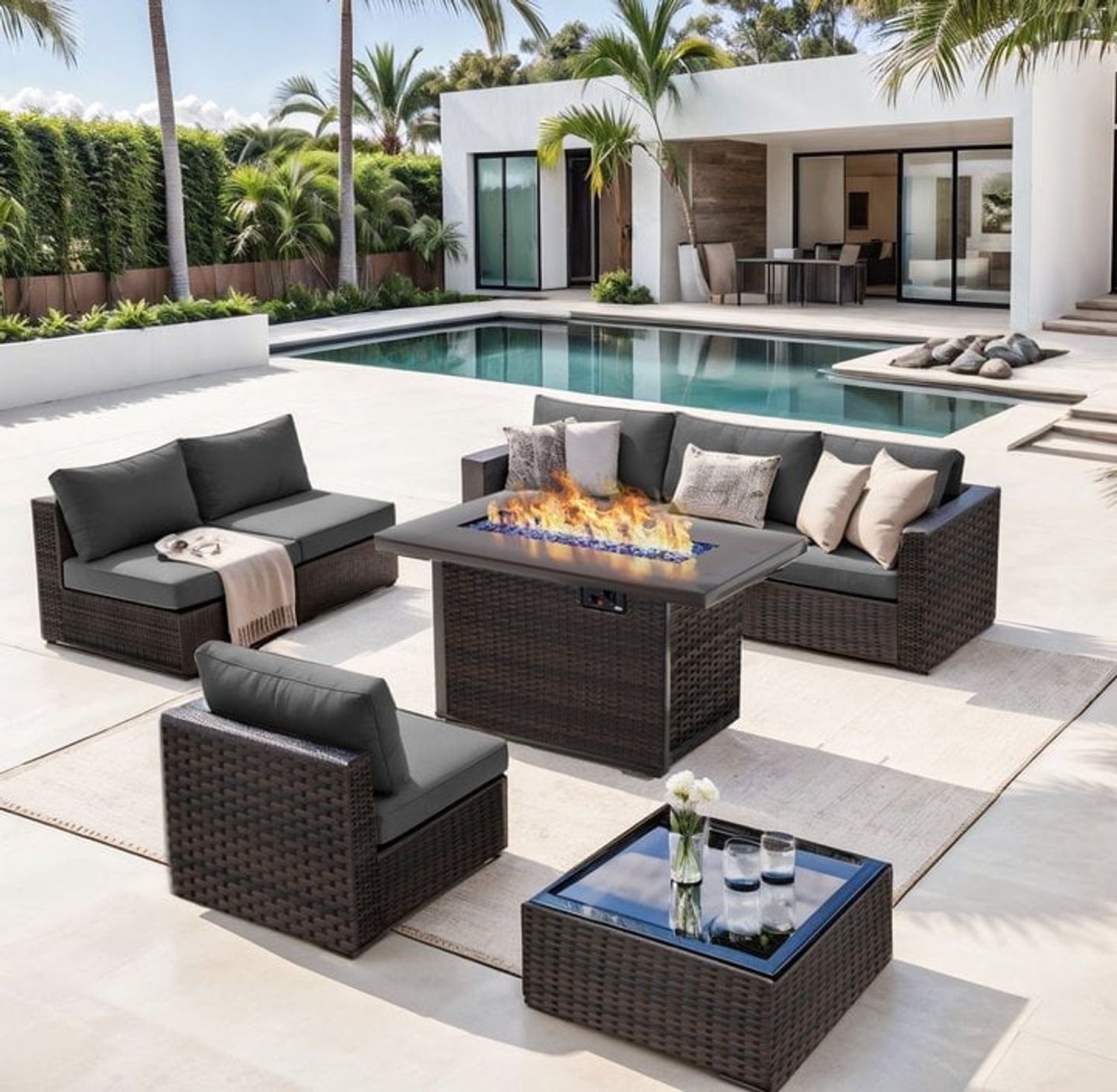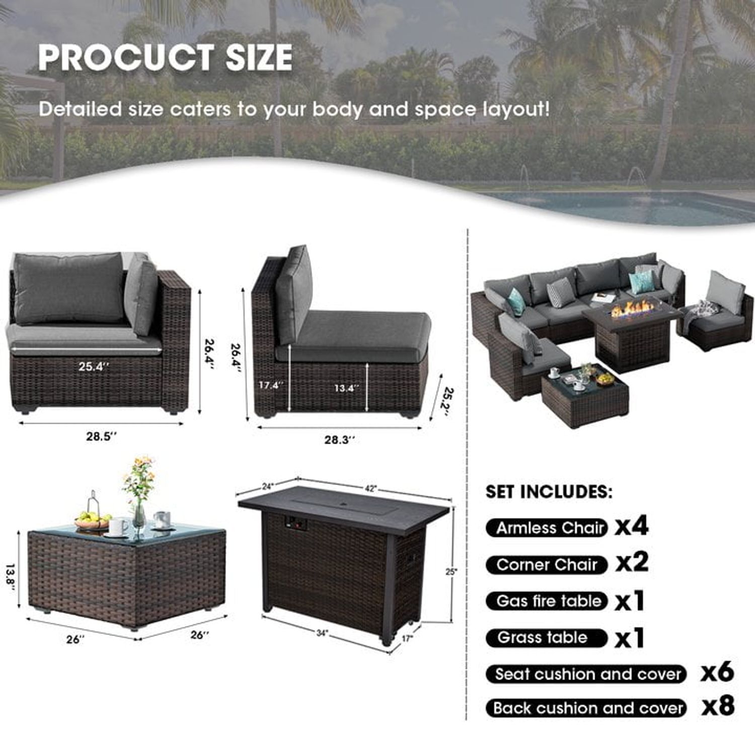 TANGJEAMER Outdoor Garden 8 Piece Patio Furniture with 43" 55000BTU Gas Propane Fire Pit Table Rattan Wicker Sectional Set